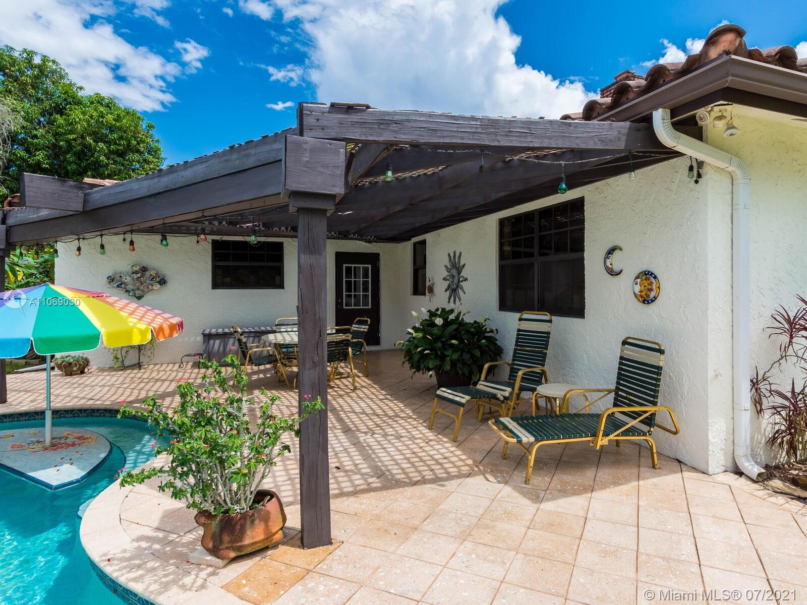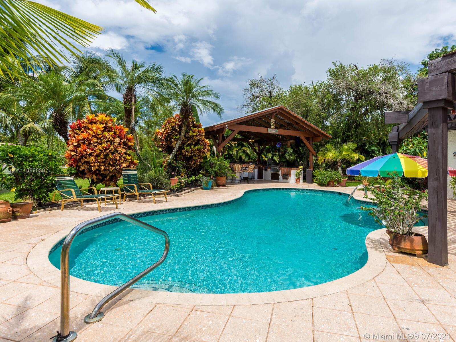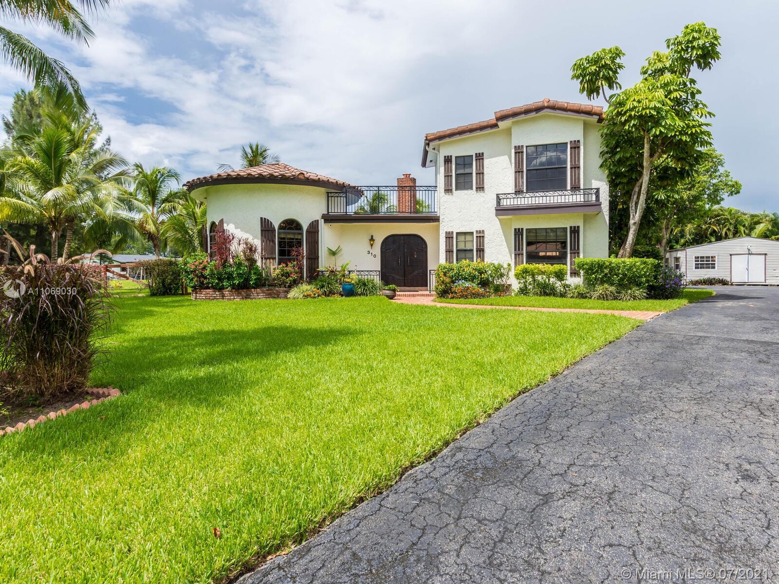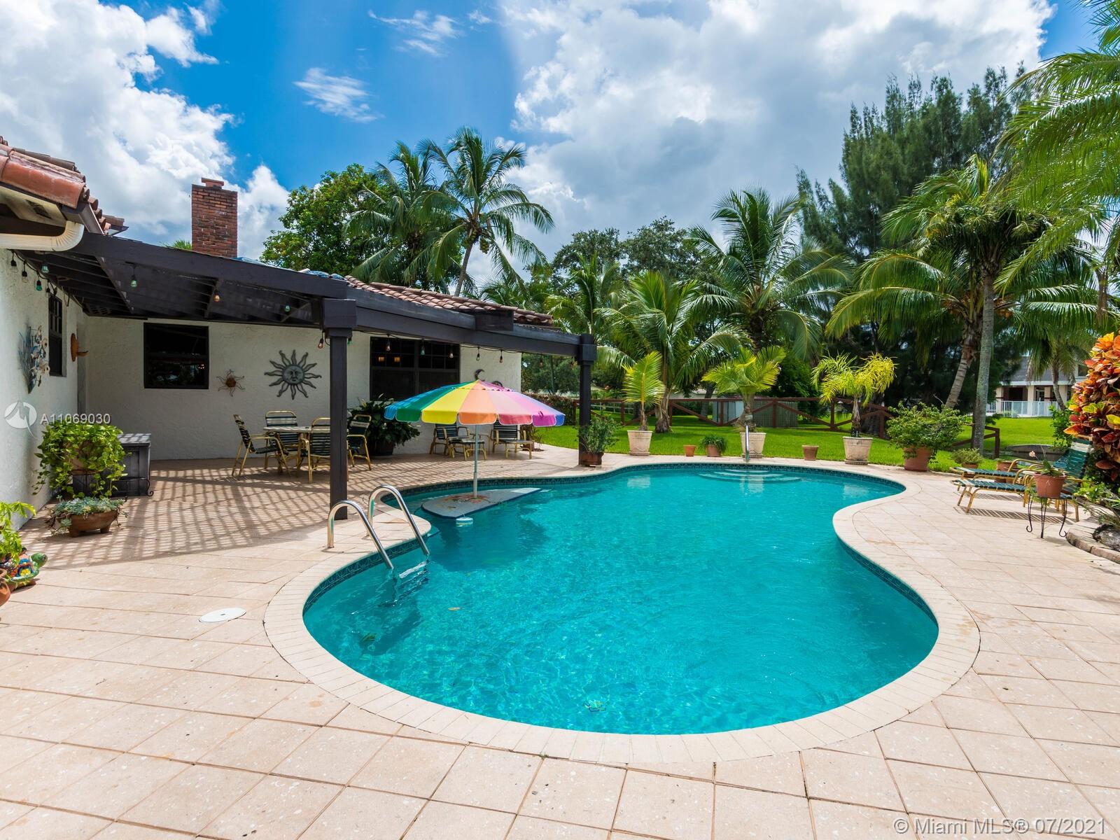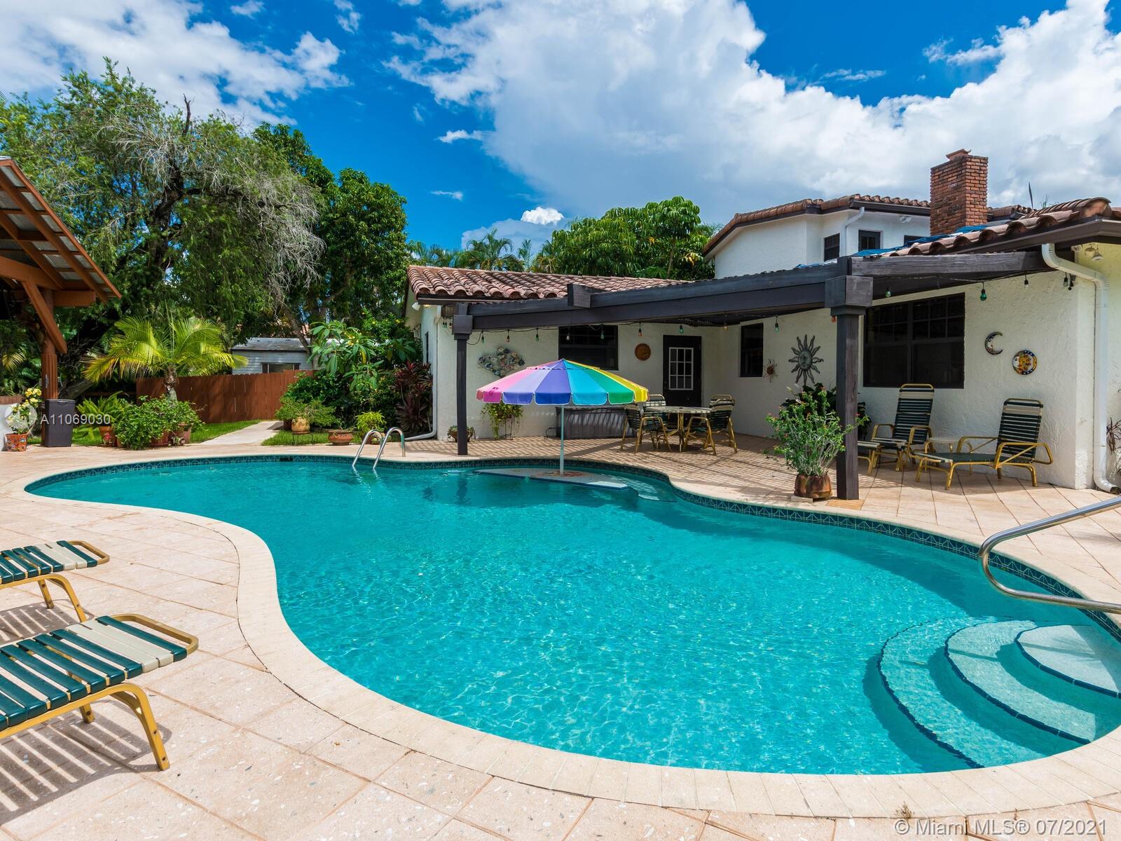 Amazingly unique three bedroom three bath two story home carefully designed to bring forth the best of old world charm. Bask in the pool surrounded by a tropical waterfront paradise on over ½ an acre with party size covered entertainment area with barbeque grill, electric, water, and so much more. Home also offers Impact windows and doors and fabulous flooring throughout. The additional storage building offers electricity and wall a/c for your comfort, whether as an office, home gym, or other. Desireably situated in Plantation Acres near American Heritage School. This beautiful home can be yours! Love it just the way it is or personalize it with your own creative updates. Showings by Appointment Only.