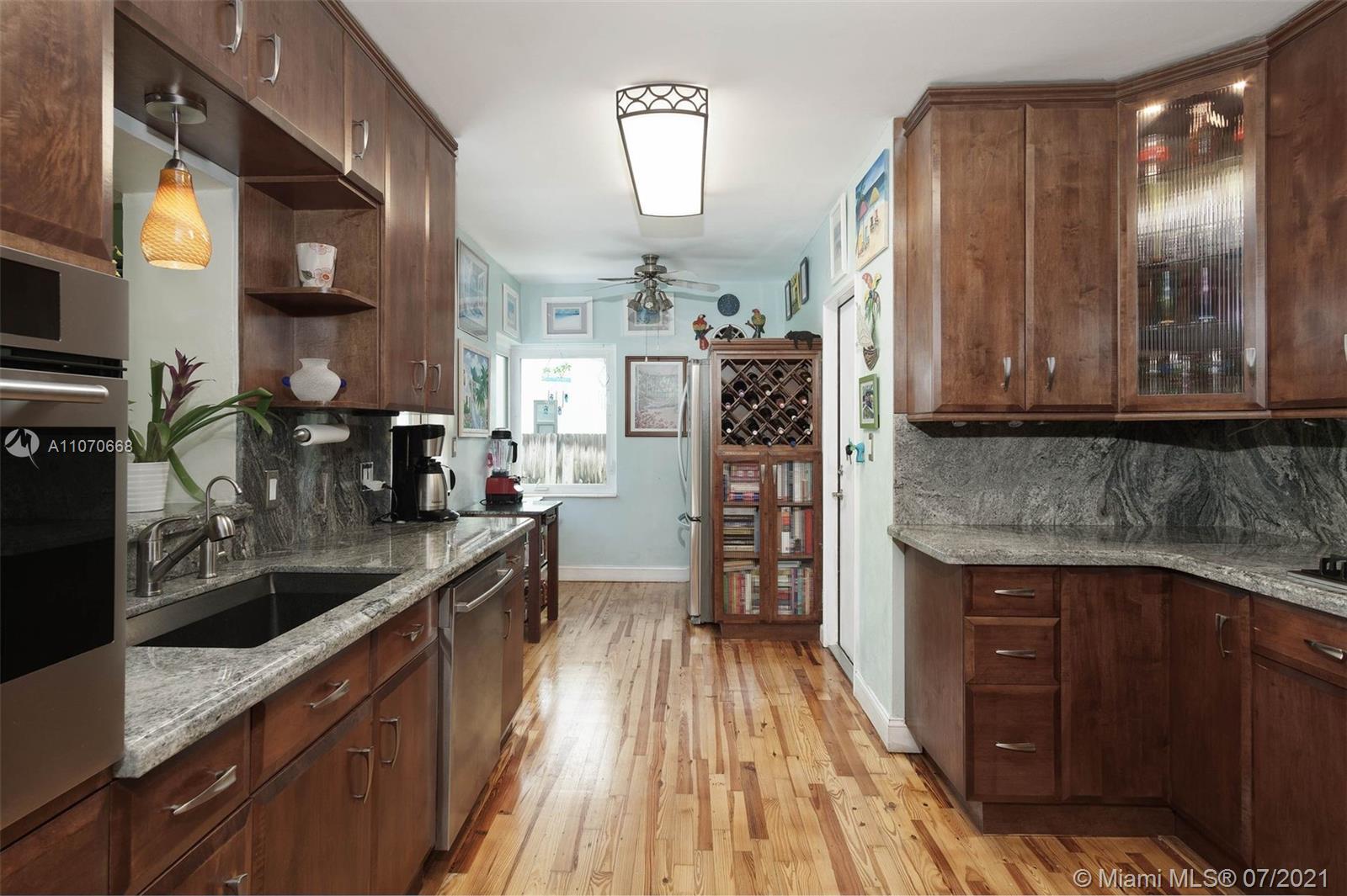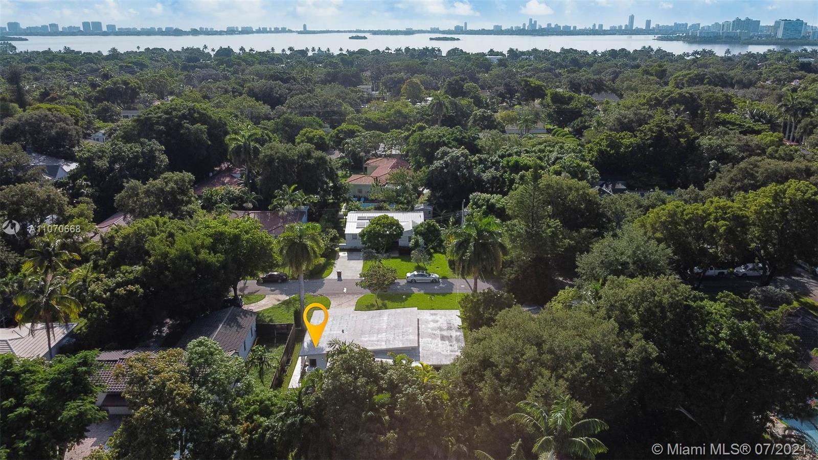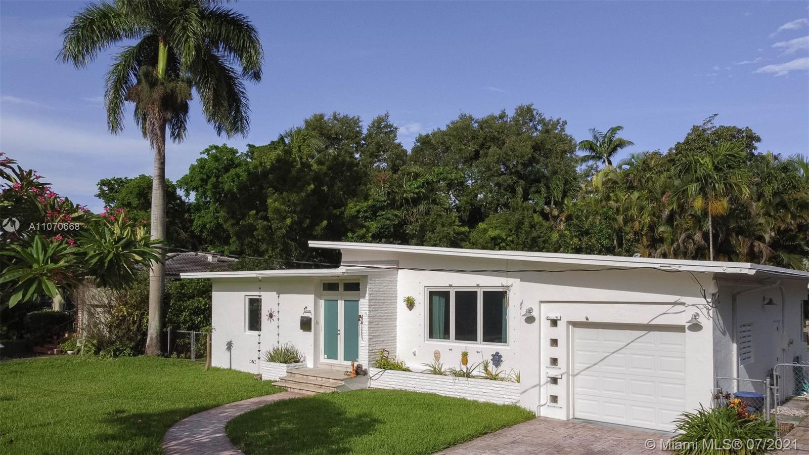 Magical Mid-century modern East of US-1 on a quiet street, Miami Shores. Big fenced/private yard with fruit trees, patio and room for a pool. Attached 1 car garage with laundry and extra storage. Open floor plan with high ceilings, huge living room, great dining area, and awesome Florida/family room overlooking the garden. Amazing natural light. 2 bedrooms and 2 full baths. Large updated eat-in kitchen with granite and stainless steel, ample cabinet and countertop space. Natural gas hooked up to the cook-top, tank-less H2O heater and dryer. Oak and terrazzo floors. Impact windows and doors, sprinkler system and more. A Must See!