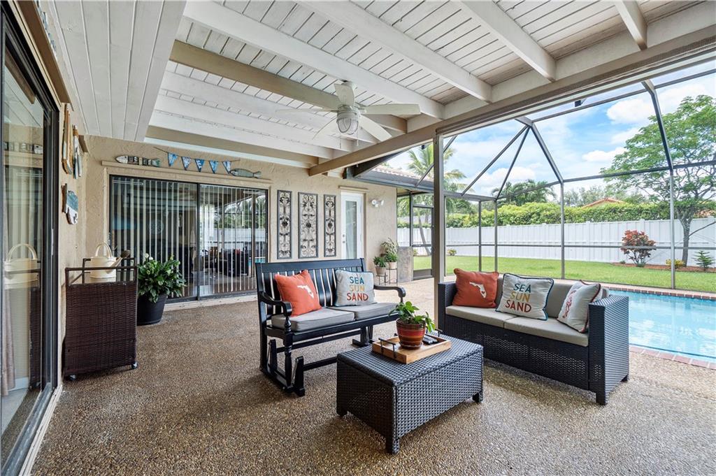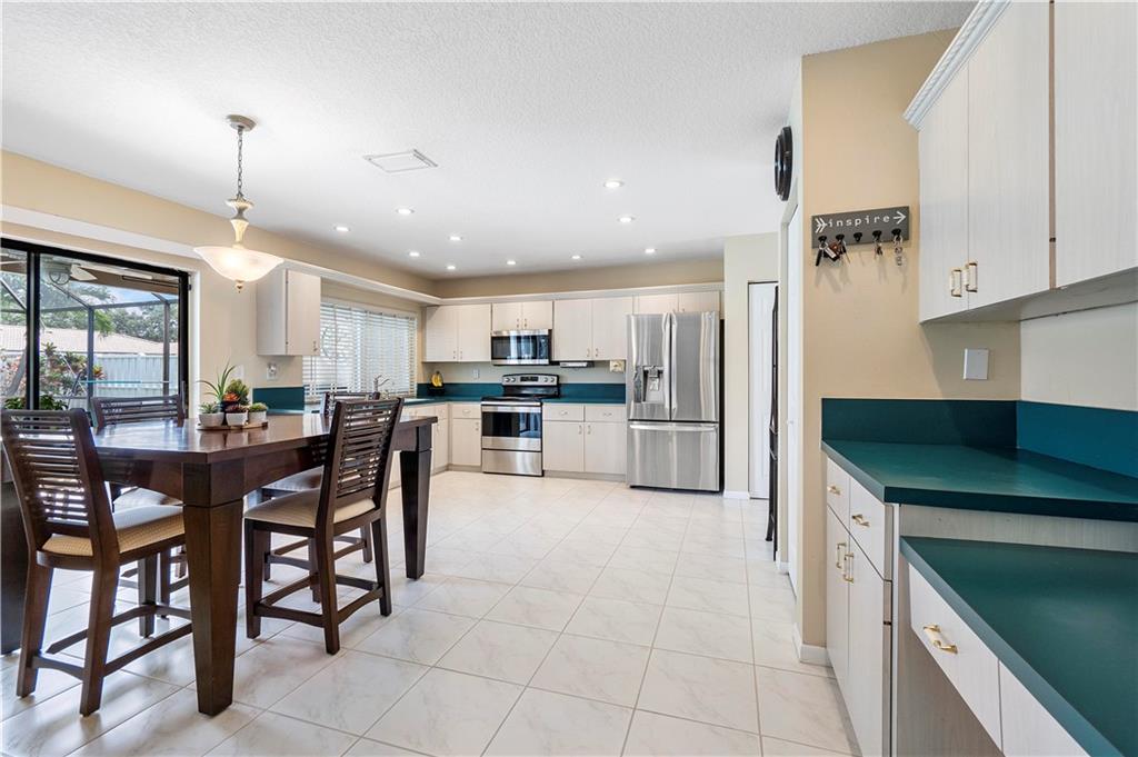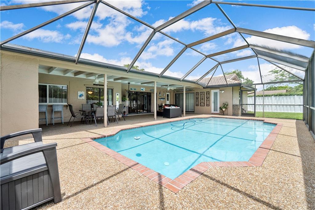 **NO HOMEOWNER ASSOCIATION** Charming home complete with impact windows/doors & hurricane panels for sliders & one cabana bath window. Sit in your kitchen, family room or Lanai, while sipping your favorite libation & gaze at your inviting screened-in pool with private (PVC shadow box) fenced-in backyard. Very large eat-in kitchen with new stainless steel appliances and opened to the family room. Formal dining and living room. Laminate wood floors in 3 bedrooms, dining room & living room. Wood look tile in one bedroom. Tile in kitchen/family room & hallways. Stunning remodeled grand bath w/cabana door. Hurricane proof garage door w/new motor. Gutters all around. Dual AC units. Samsung high efficiency Washer & Dryer. Ring Doorbell & new paver driveway! Neighborhood park around the corner!