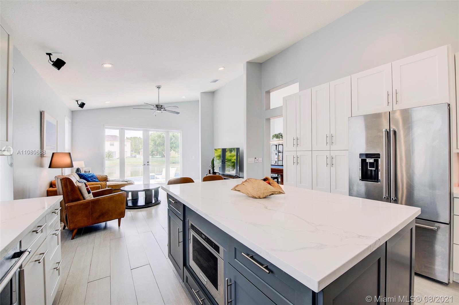 Prepare to be amazed when you step inside this gorgeous remodeled home in the highly sought after Sunset Lakes community! Upon entry you are greeted by an open floor plan with direct views to the pool and lake. Complete impact windows & doors PLUS natural lighting! Fully remodeled flooring all throughout! Home exterior was freshly painted! Updated kitchen with white wood cabinetry, soft close drawers & doors, quartz countertops, large center island and SS appliances! Fully remodeled bathrooms. Master has bamboo floors, electric black out shades & custom closets. Enjoy Florida living with this stunning pool with infinity edge, decorative lighting, salt water system, & spa! Beautiful travertine pool deck & outdoor kitchen with grill makes this backyard the perfect place to entertain!