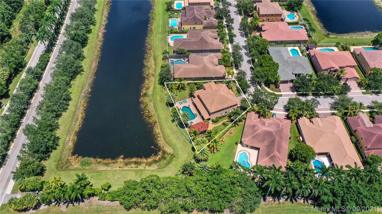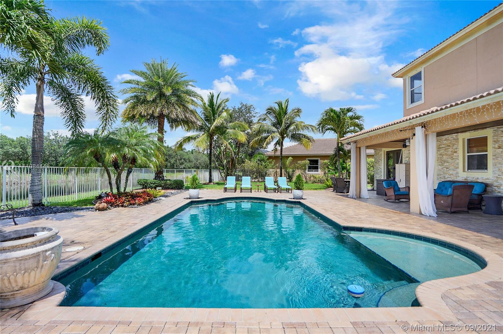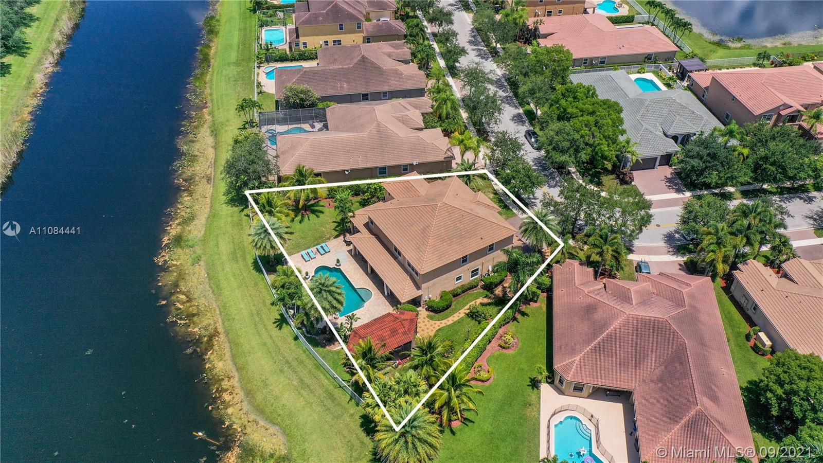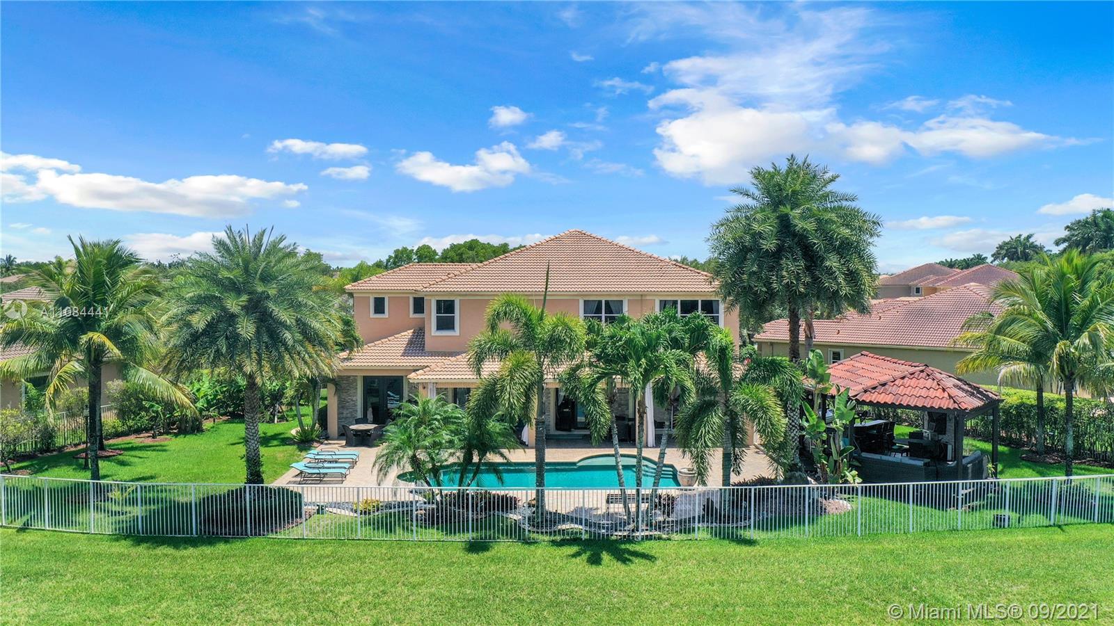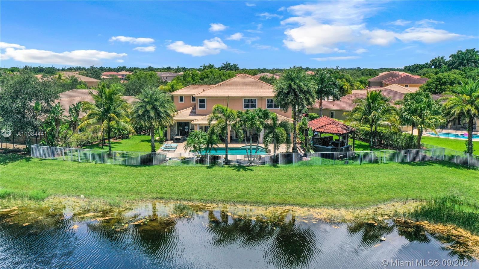 Unique Opportunity! First time in the market. Spectacular two story Lakefront/Pool Home on oversized and private lot with no neighbors on the back in the sought after 24-Hour Manned Gated Community of Isles at Weston. Spacious 5 bedroom with built-in closets plus office/game room, 5 bath, extended 3 car garage, ample remodeled kitchen with large island, granite countertops and ss appliances. Travertine and wood floors. One of kind lush resort-style backyard with mature fruit trees, covered lanai, pool and State-of-the-Art Tiki Hut — Perfect for BBQ's and outdoor enjoyment year-round. Hurricane shutter/impact protection. A+ schools. Clubhouse with gym, two pools, child playground and many more amenities.