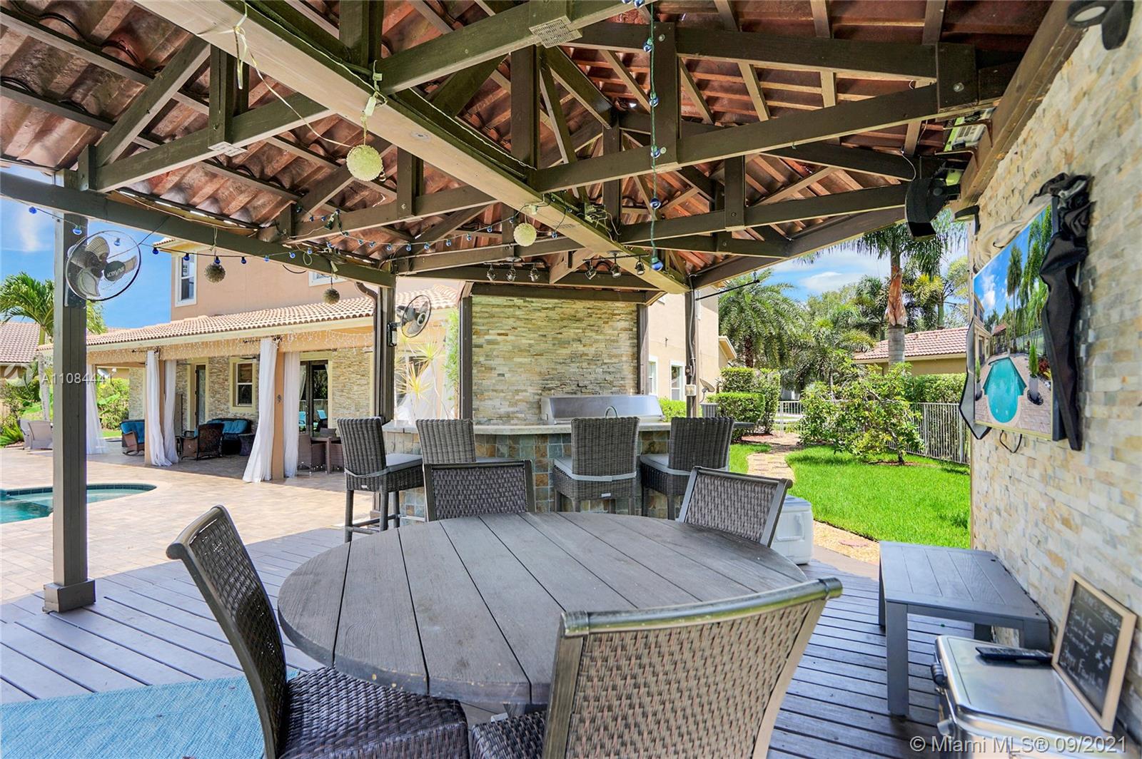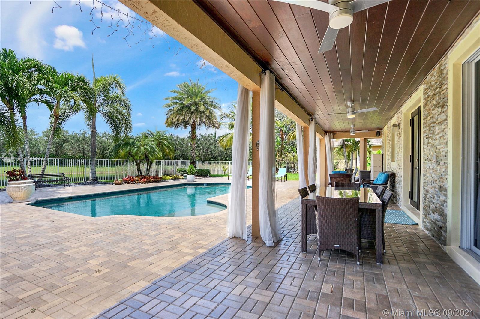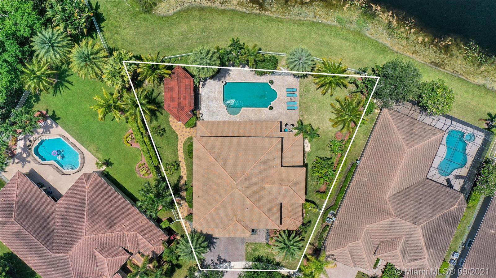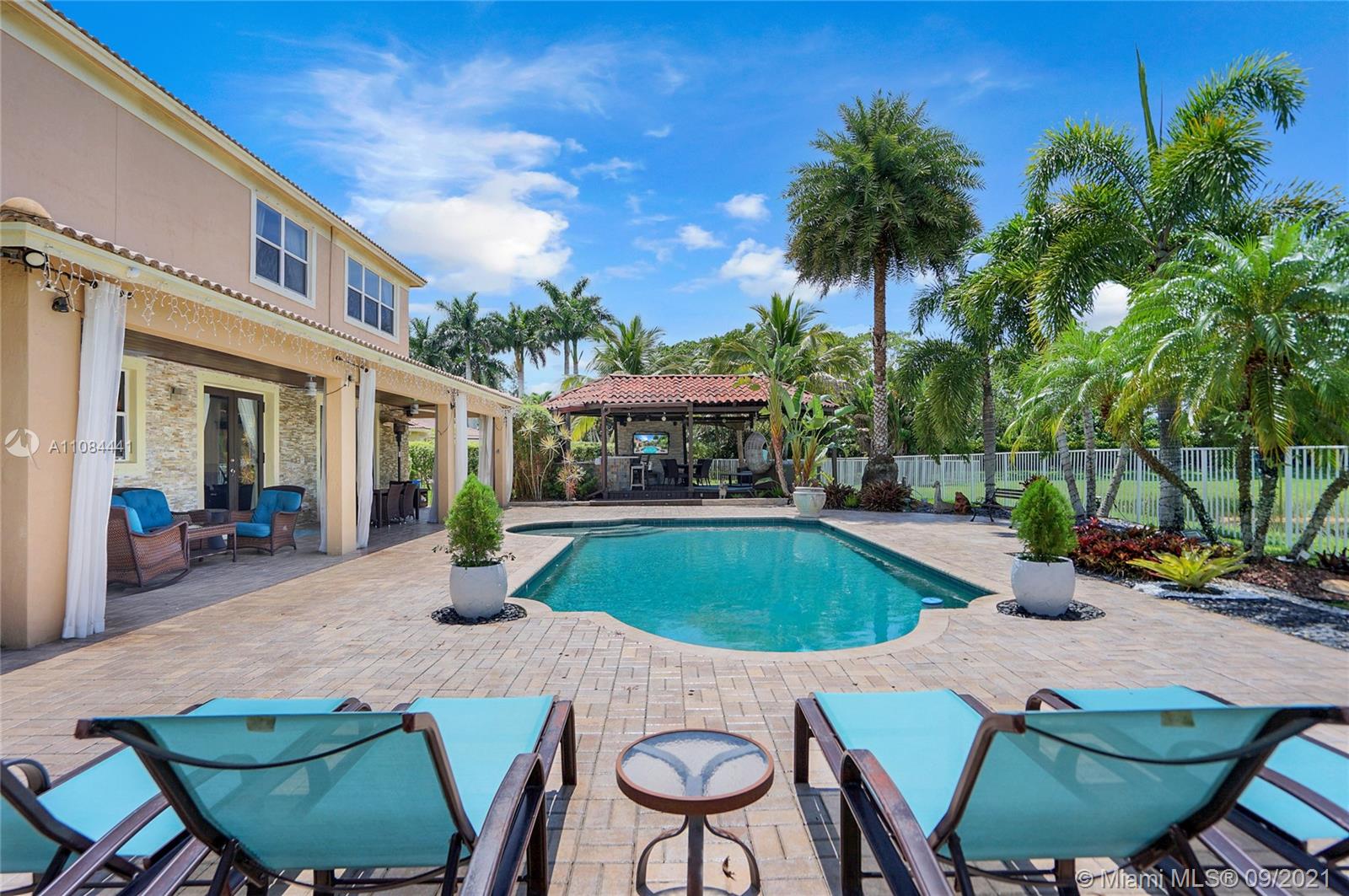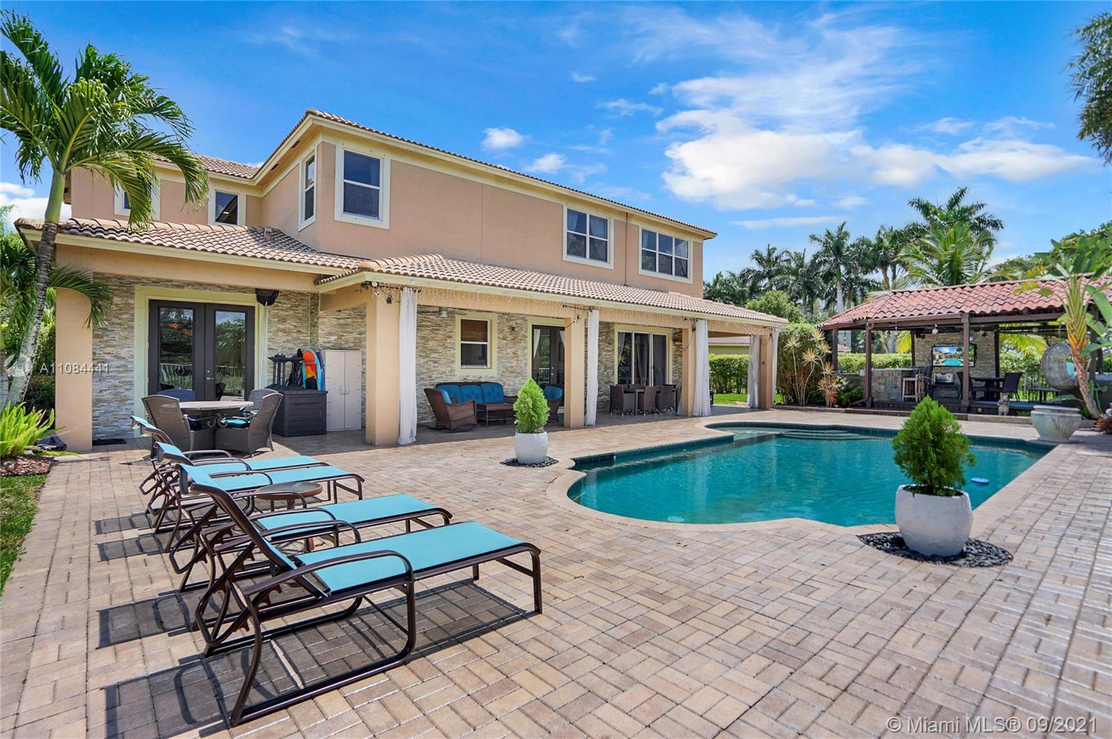 Unique Opportunity! First time in the market. Spectacular two story Lakefront/Pool Home on oversized and private lot with no neighbors on the back in the sought after 24-Hour Manned Gated Community of Isles at Weston. Spacious 5 bedroom with built-in closets plus office/game room, 5 bath, extended 3 car garage, ample remodeled kitchen with large island, granite countertops and ss appliances. Travertine and wood floors. One of kind lush resort-style backyard with mature fruit trees, covered lanai, pool and State-of-the-Art Tiki Hut — Perfect for BBQ's and outdoor enjoyment year-round. Hurricane shutter/impact protection. A+ schools. Clubhouse with gym, two pools, child playground and many more amenities.