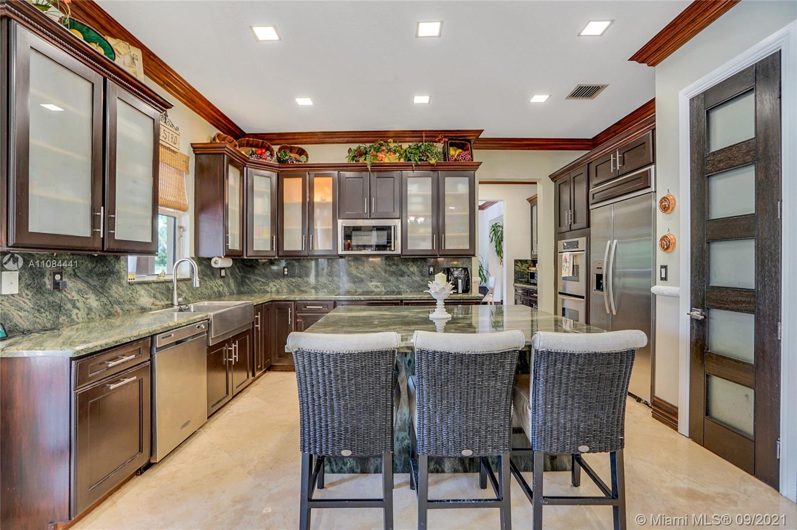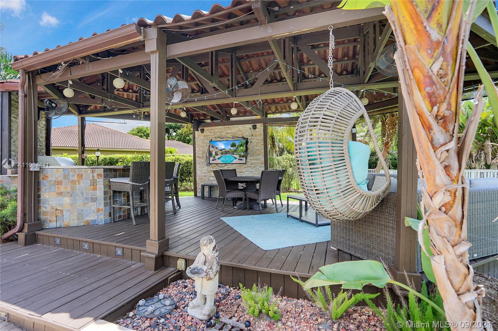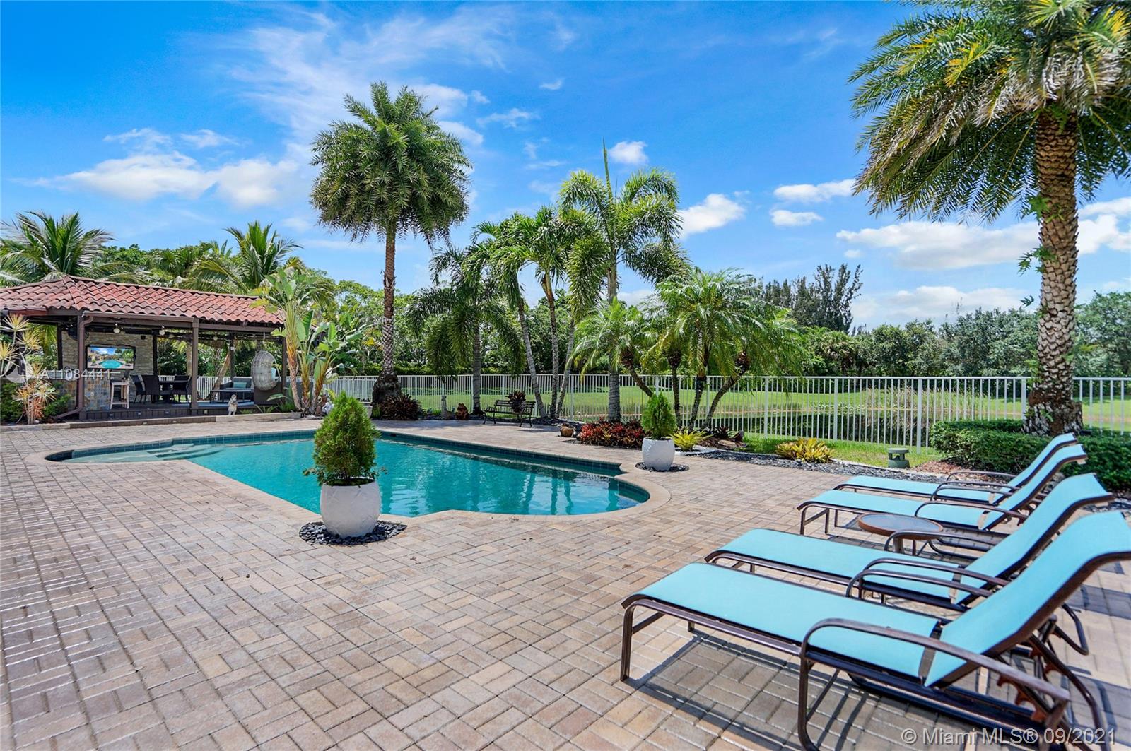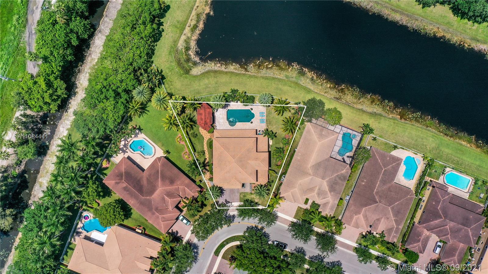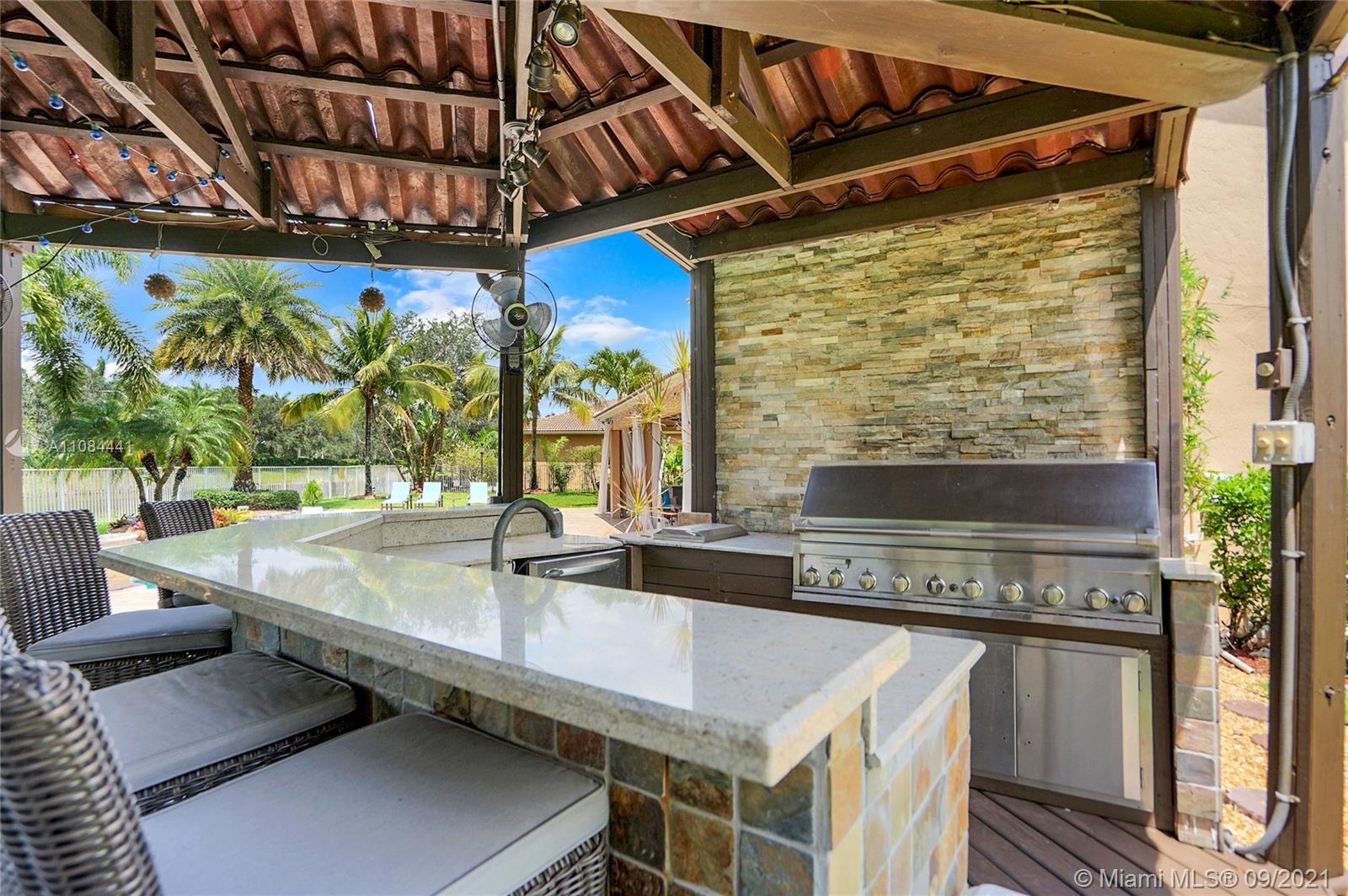 Unique Opportunity! First time in the market. Spectacular two story Lakefront/Pool Home on oversized and private lot with no neighbors on the back in the sought after 24-Hour Manned Gated Community of Isles at Weston. Spacious 5 bedroom with built-in closets plus office/game room, 5 bath, extended 3 car garage, ample remodeled kitchen with large island, granite countertops and ss appliances. Travertine and wood floors. One of kind lush resort-style backyard with mature fruit trees, covered lanai, pool and State-of-the-Art Tiki Hut — Perfect for BBQ's and outdoor enjoyment year-round. Hurricane shutter/impact protection. A+ schools. Clubhouse with gym, two pools, child playground and many more amenities.