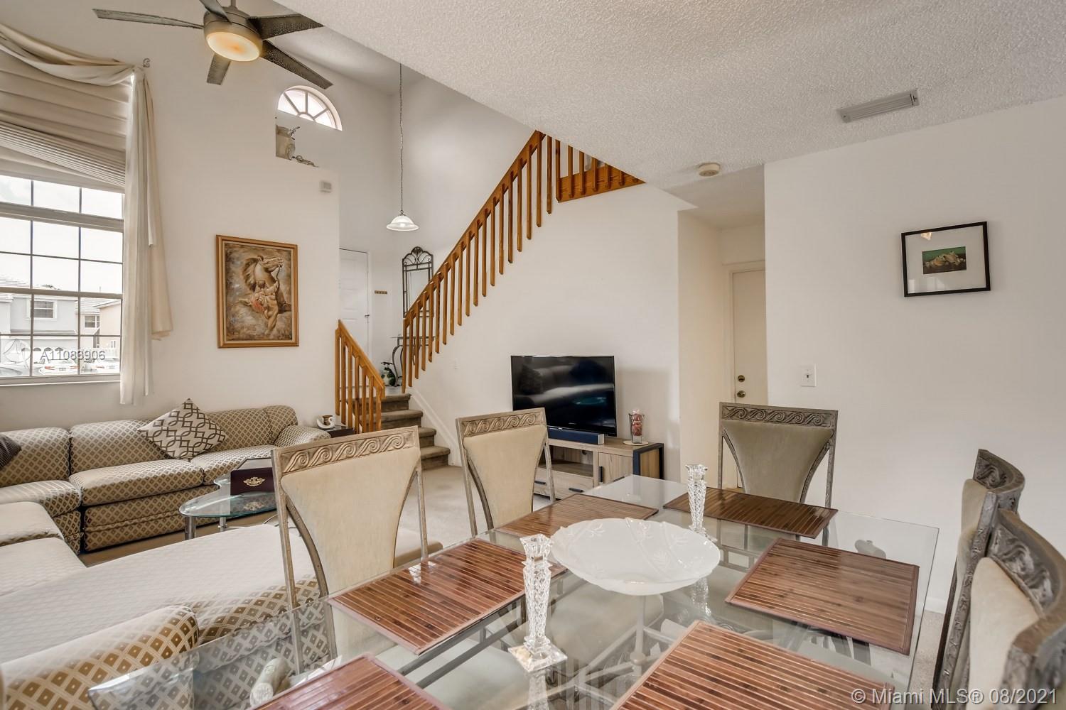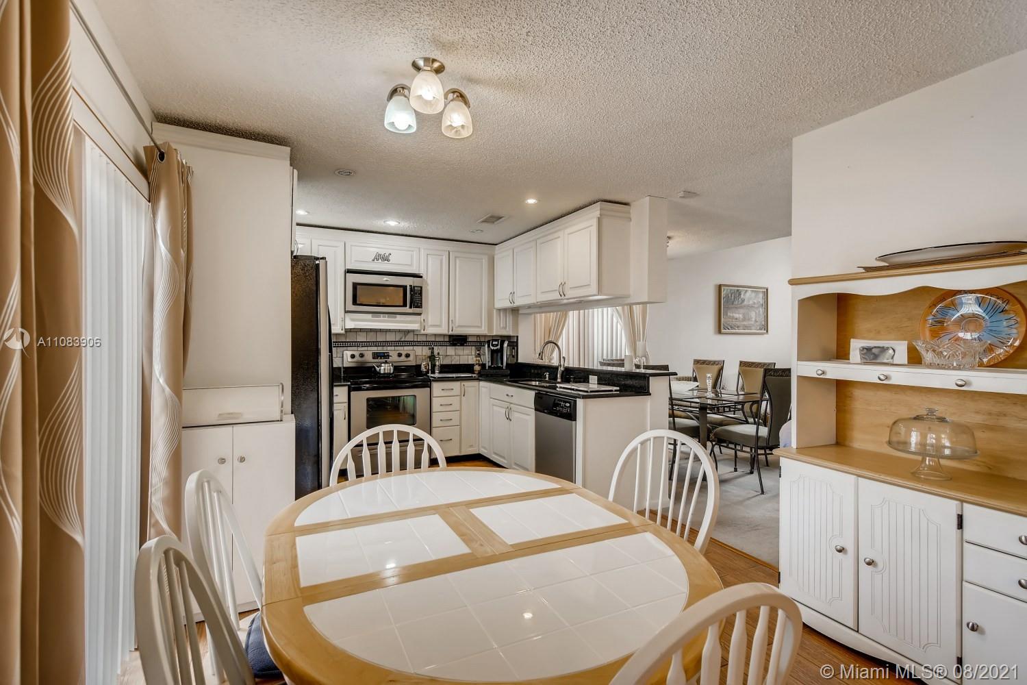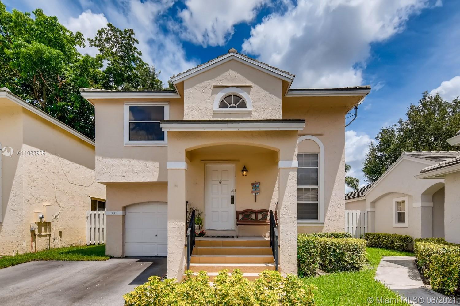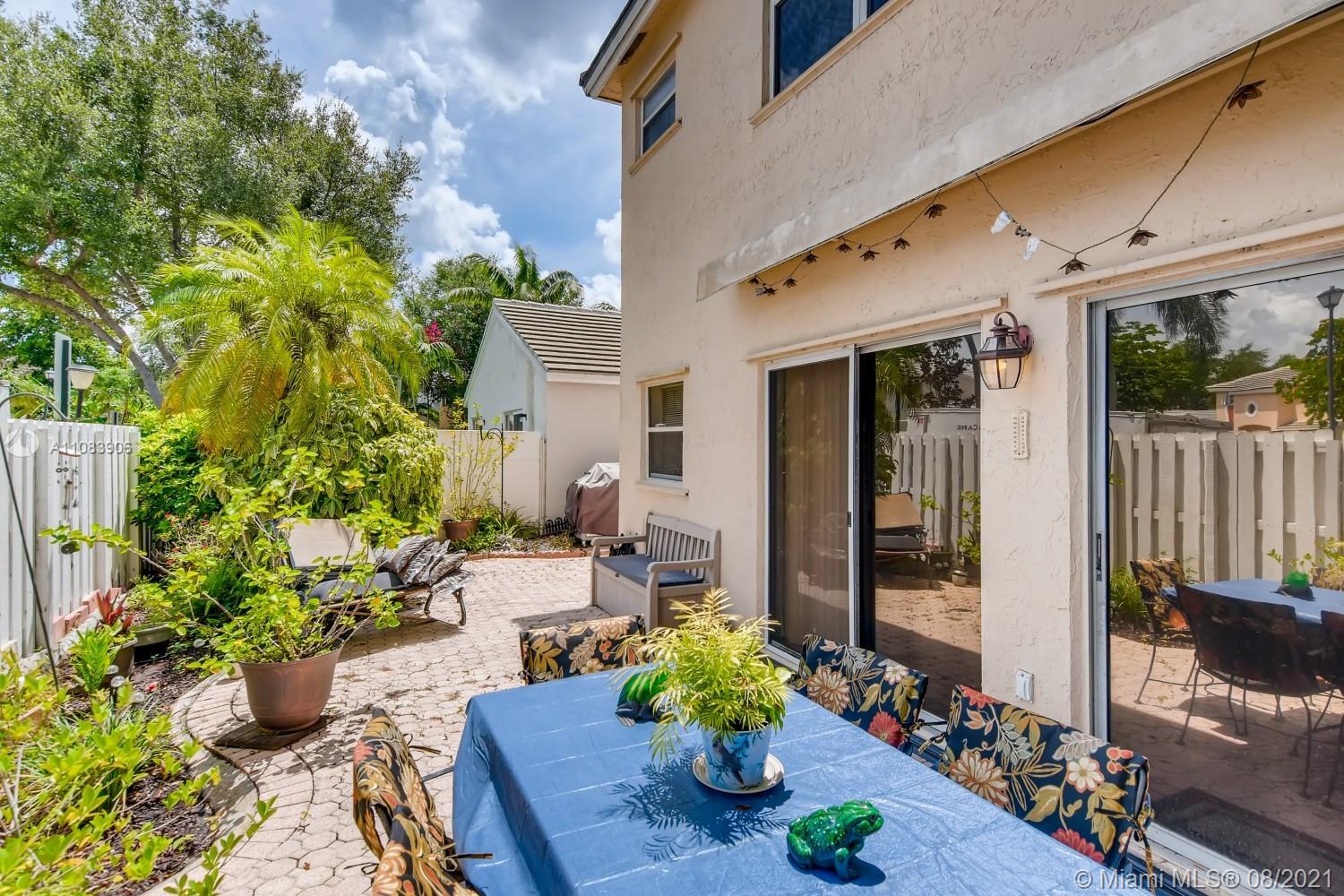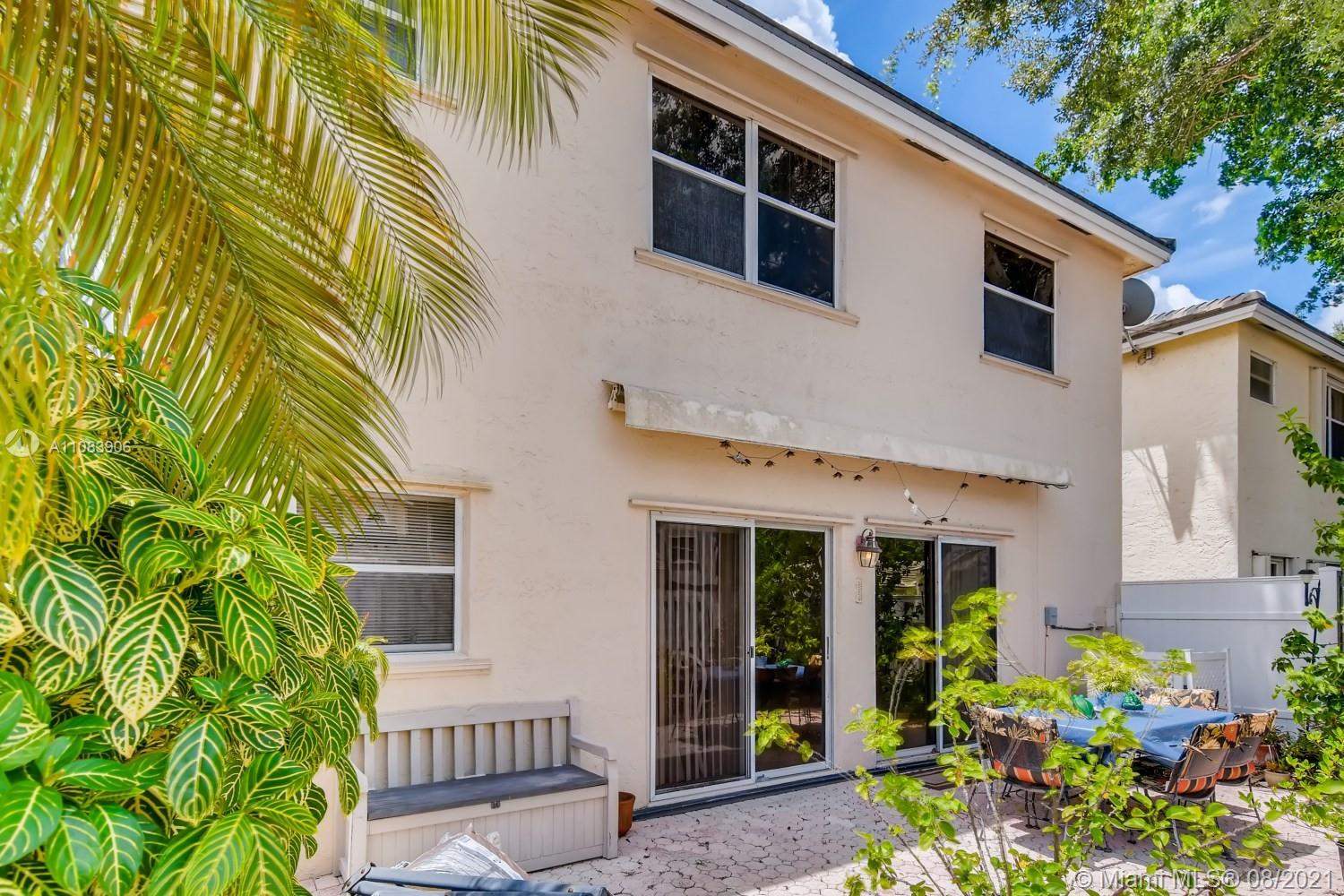 Fantastic 3 bd/ 2.5 ba two-story home with stainless steel appliances, a peninsula bar, granite countertops and a side dining nook with built-in cabinetry. A side living area stretches beyond the kitchen and runs across the rear of the home. bedrooms on the second level — the primary has plush carpeting, custom built armoire, ensuite bathroom with tiled standing shower, granite vanity and massive walk-in closet with custom shelving. The secondary bedrooms are also carpeted. Paradise waits in your own backyard; find yourself amongst the palms and lush, tropical vegetation on the paver patio as you entertain or enjoy the solitude — a surrounding fence ensures your privacy. Roof 2012, AC 2020, Water Heater 2003. HAS HOA.