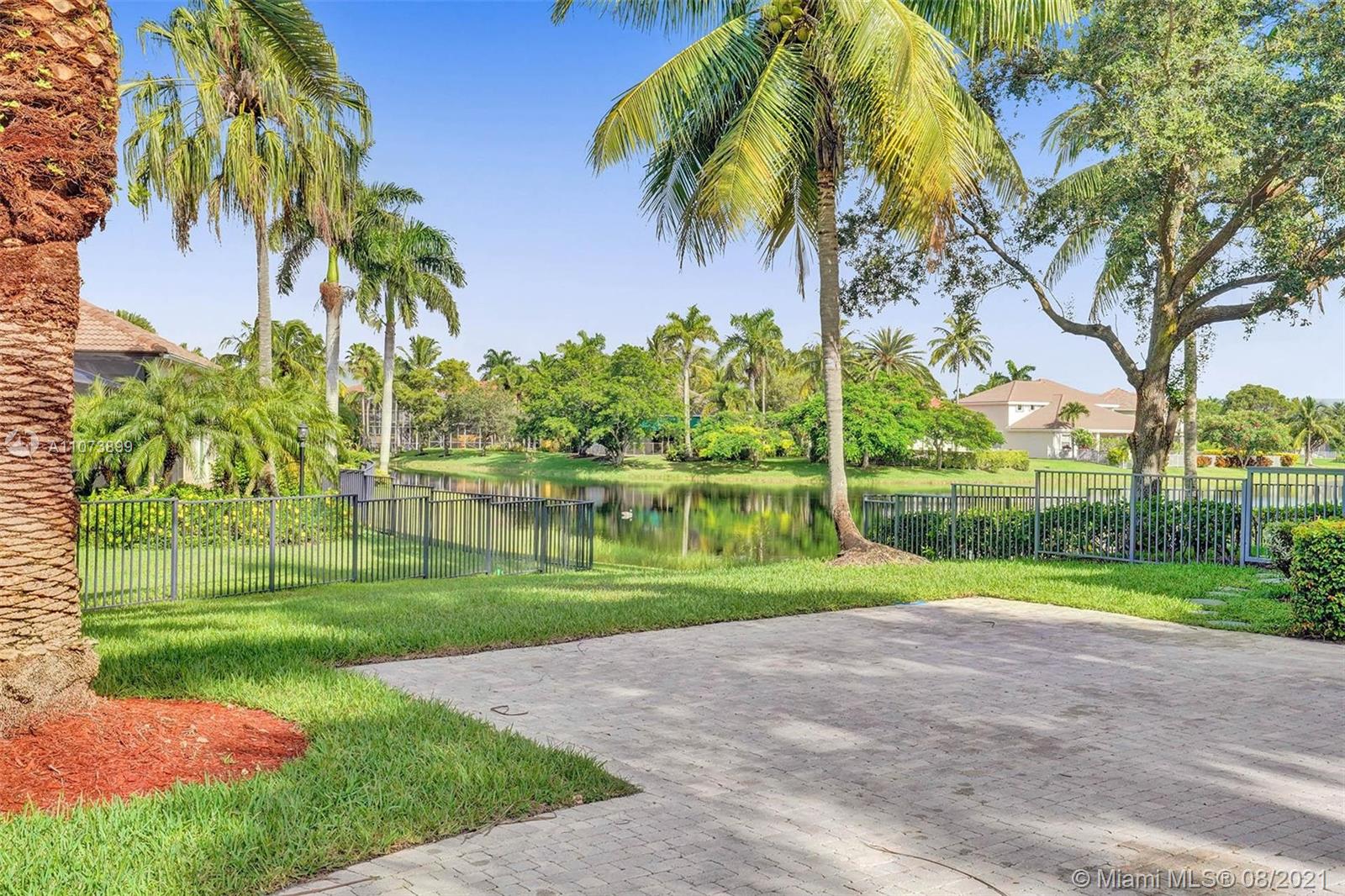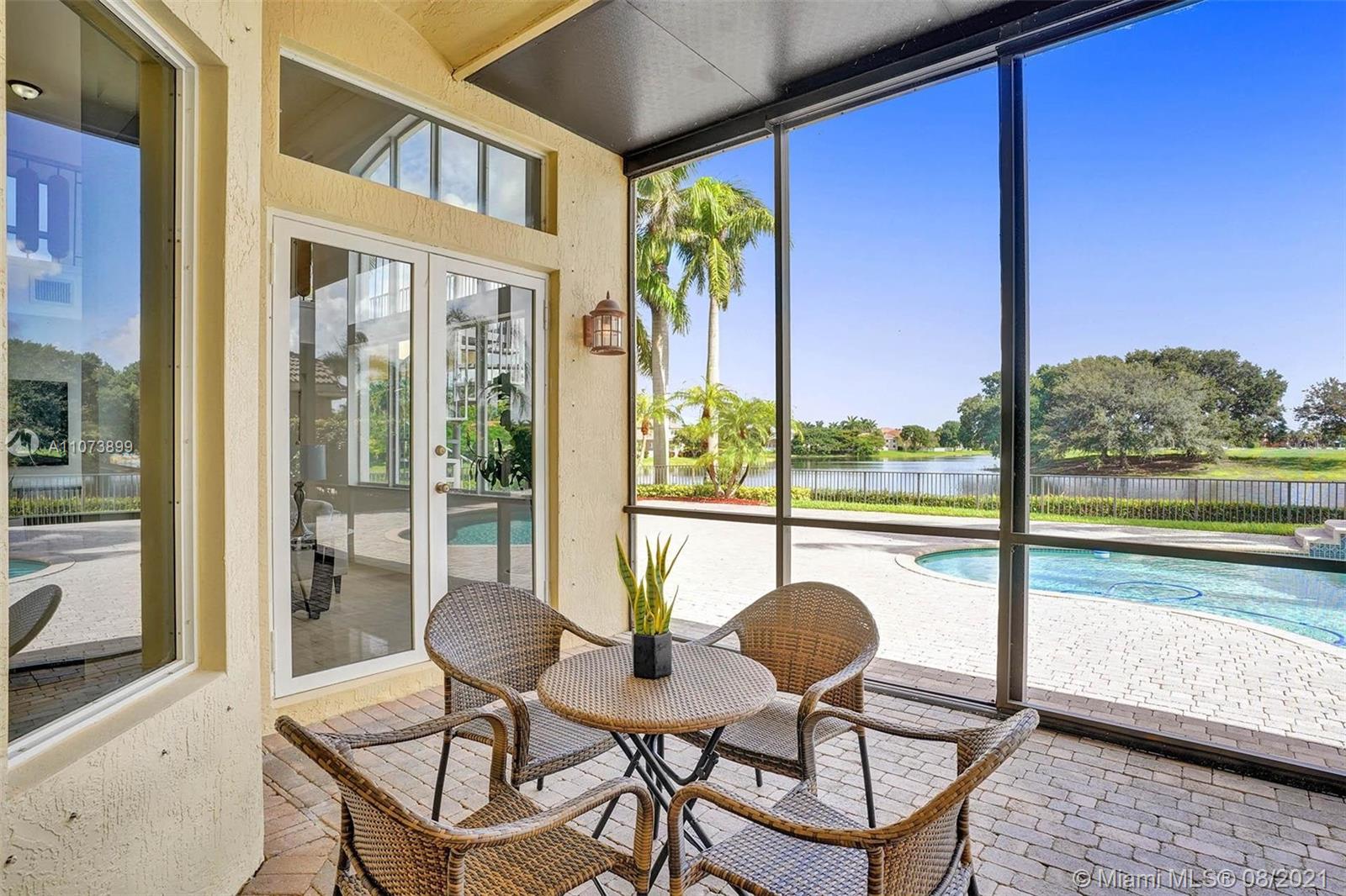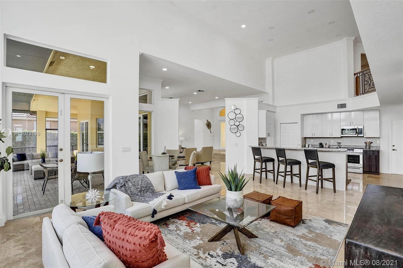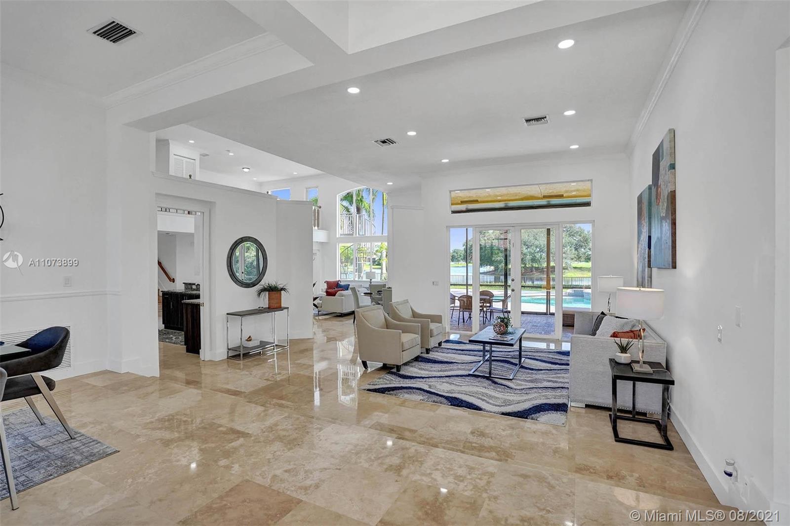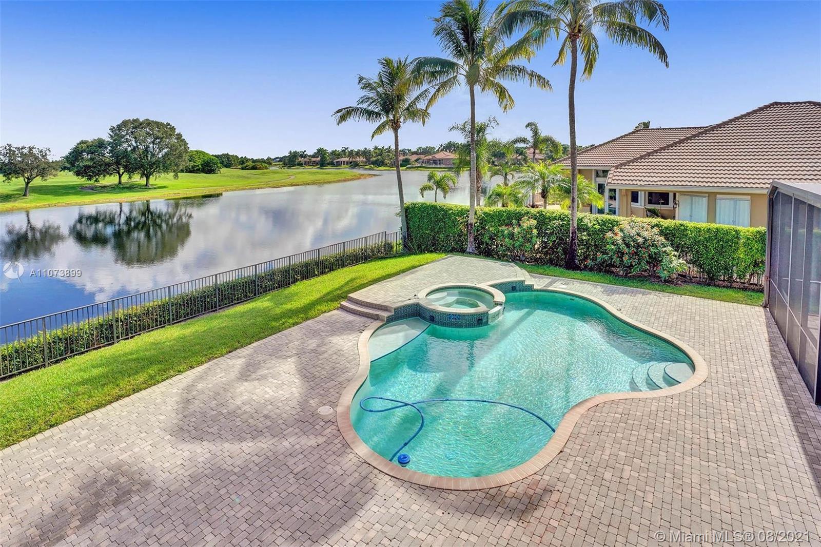 Talk about a VIEW. Incredible setback with oversized paver driveway located in Heron Bay at Long Cove. Privacy galore in this spacious 2 story home featuring travertine marble floors, volume ceiling, windows on water, and extensive crown molding. Brand New modern kitchen with stainless steel appliances and quartz countertops 2021. Owners suite first level with french doors to screened patio, pool, and fully fenced yard with view of golf and water. Newly renovated master bath. Secondary bedrooms 2nd level plus loft and balcony overlooking water and pool.