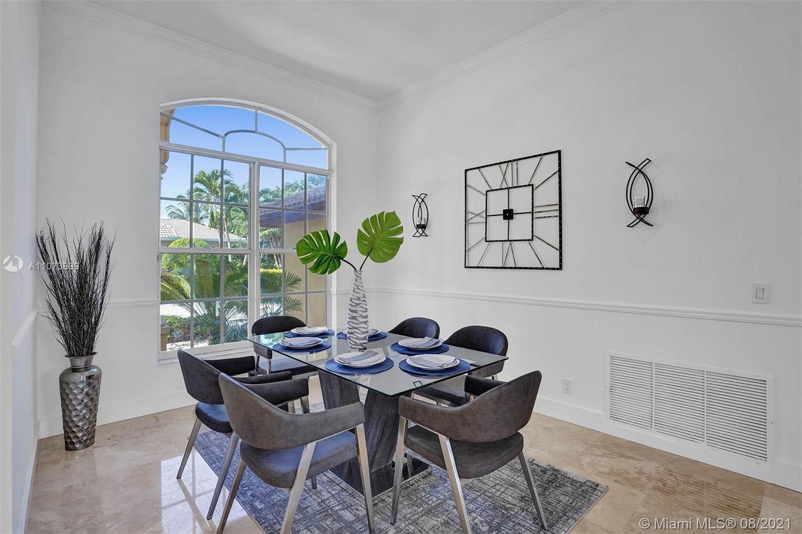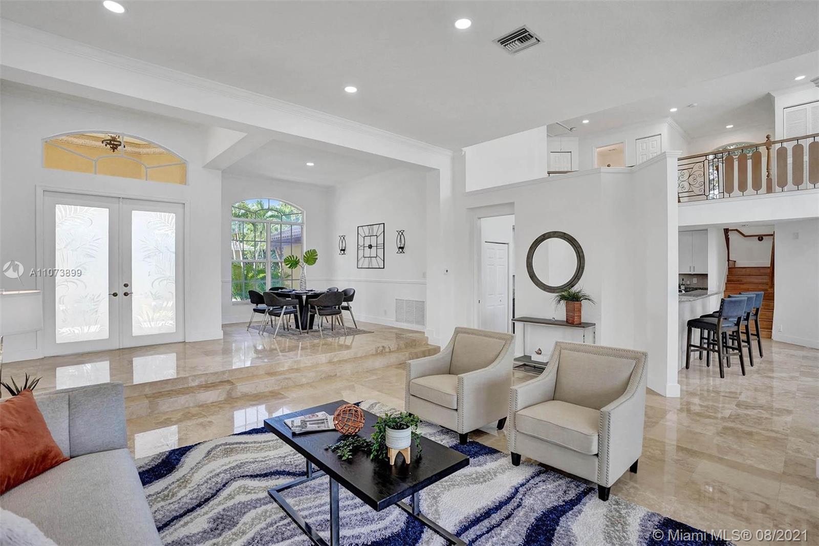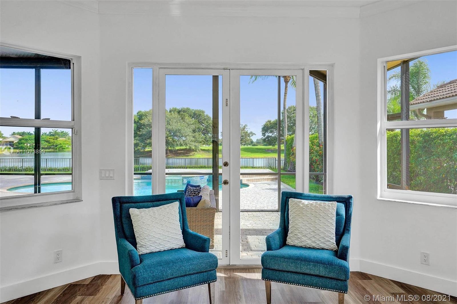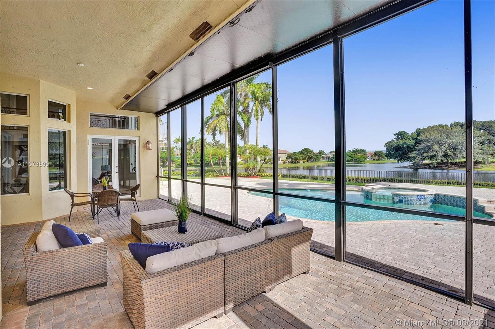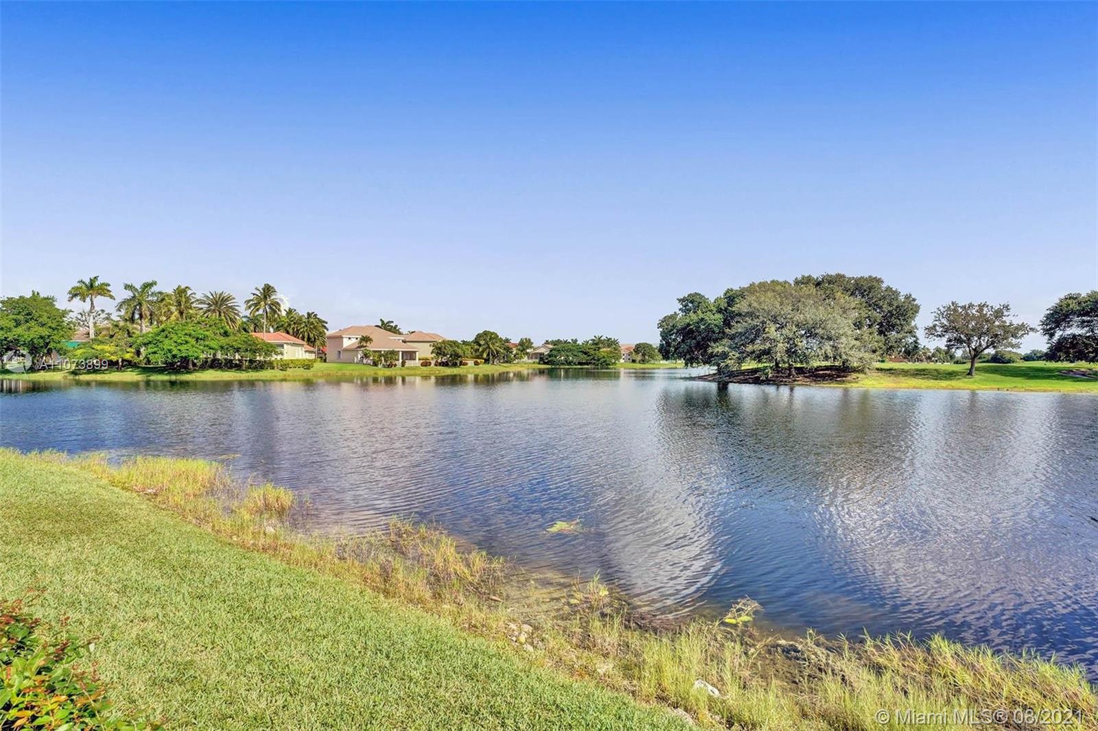 Talk about a VIEW. Incredible setback with oversized paver driveway located in Heron Bay at Long Cove. Privacy galore in this spacious 2 story home featuring travertine marble floors, volume ceiling, windows on water, and extensive crown molding. Brand New modern kitchen with stainless steel appliances and quartz countertops 2021. Owners suite first level with french doors to screened patio, pool, and fully fenced yard with view of golf and water. Newly renovated master bath. Secondary bedrooms 2nd level plus loft and balcony overlooking water and pool.