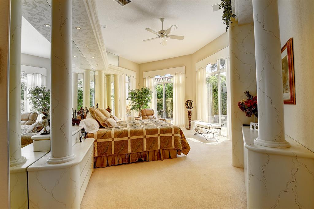 Enjoy privacy and quiet in this 3 bedroom, 2.1 bath plus den single story home. Soaring ceilings and an open design make this one of the most desireable floor plans under $1.0 million in Woodfield. Neutral tile throughout. 42'' cabinetry in the kitchen with natural gas cooking. Upgraded window treatments. The primary bedroom overlooks the pool and features spacious outfitted closets and a very large master bath. The pool area is perfect for entertaining. 2 zone air conditioners--1 is 5 years old and the other is practically brand new.