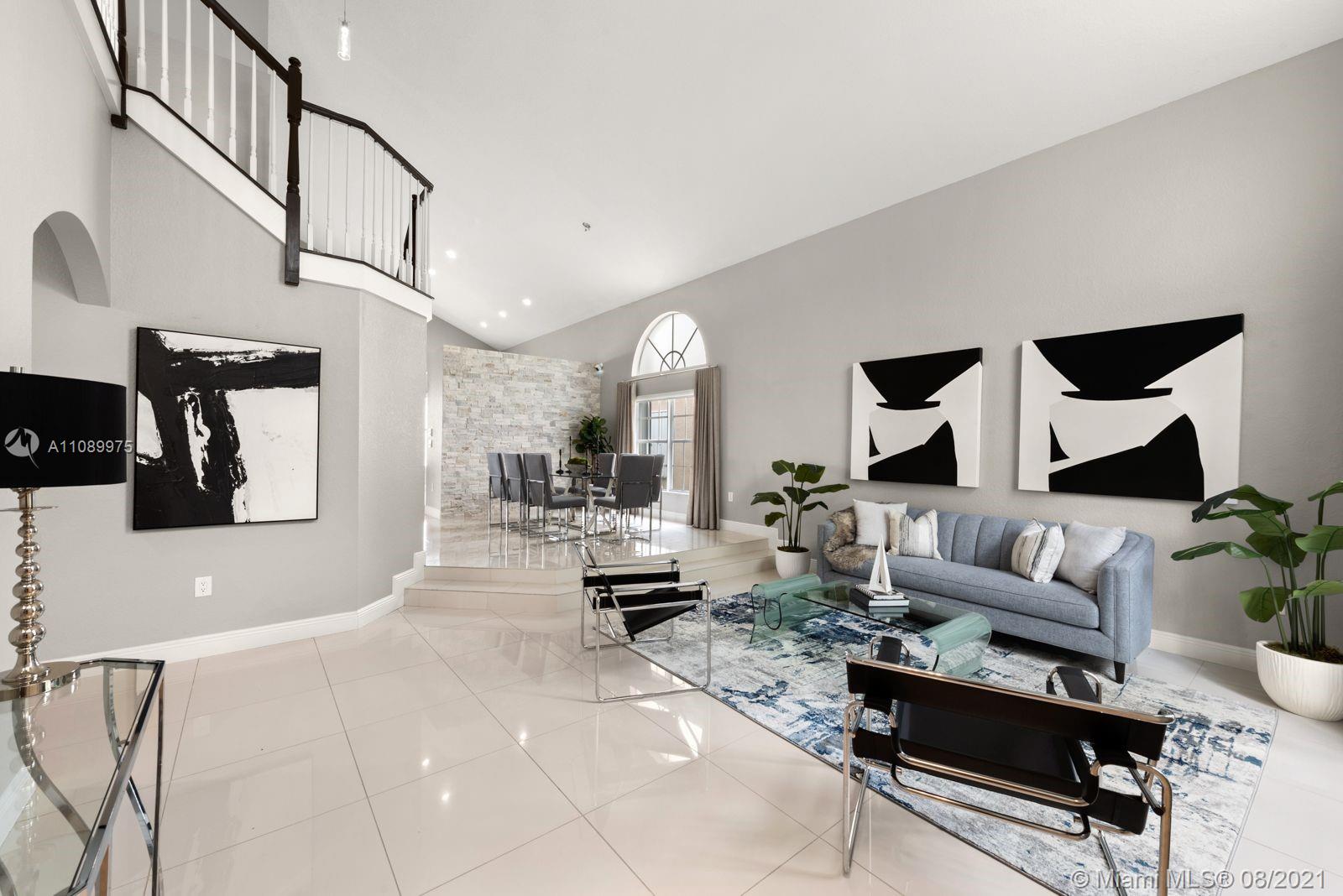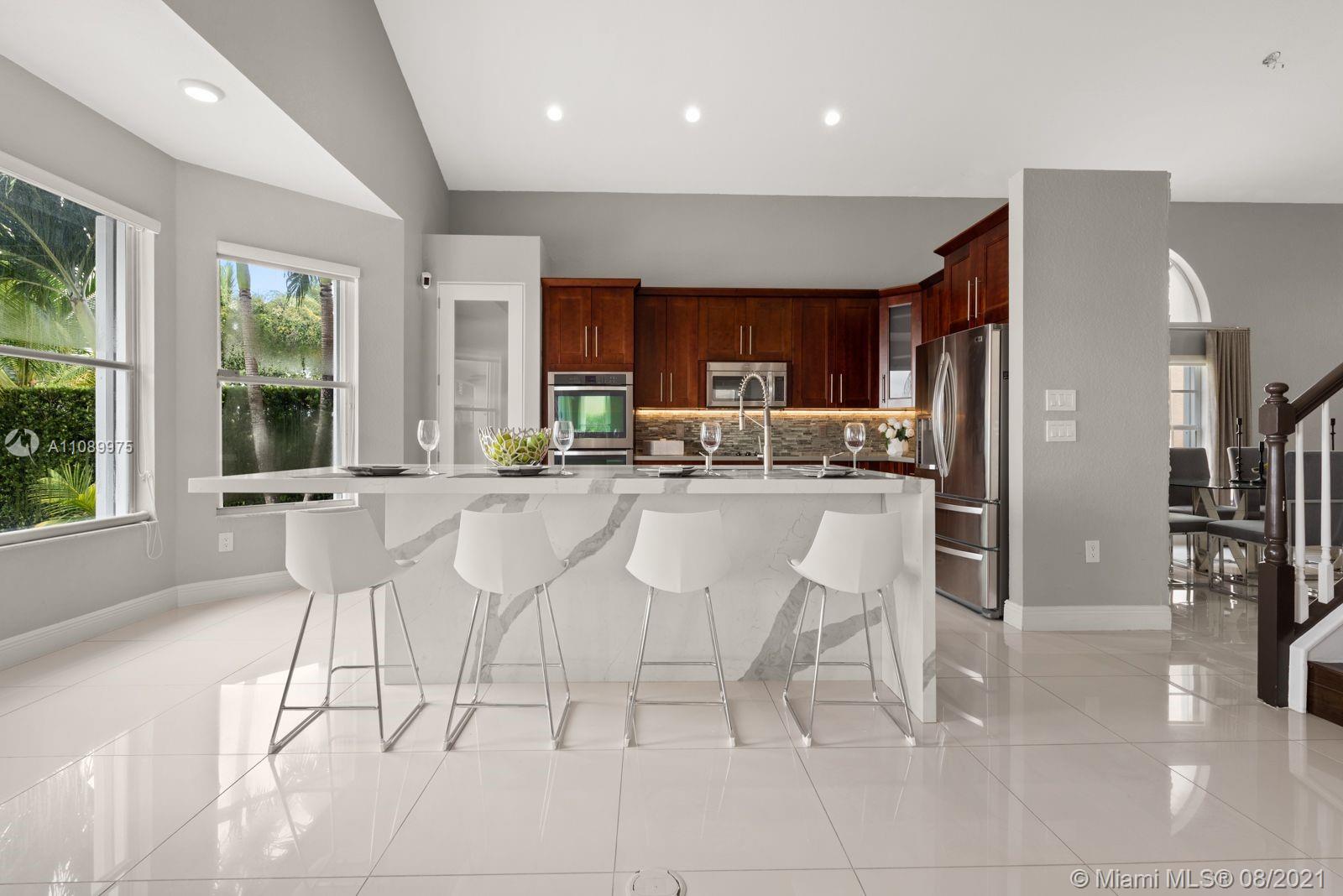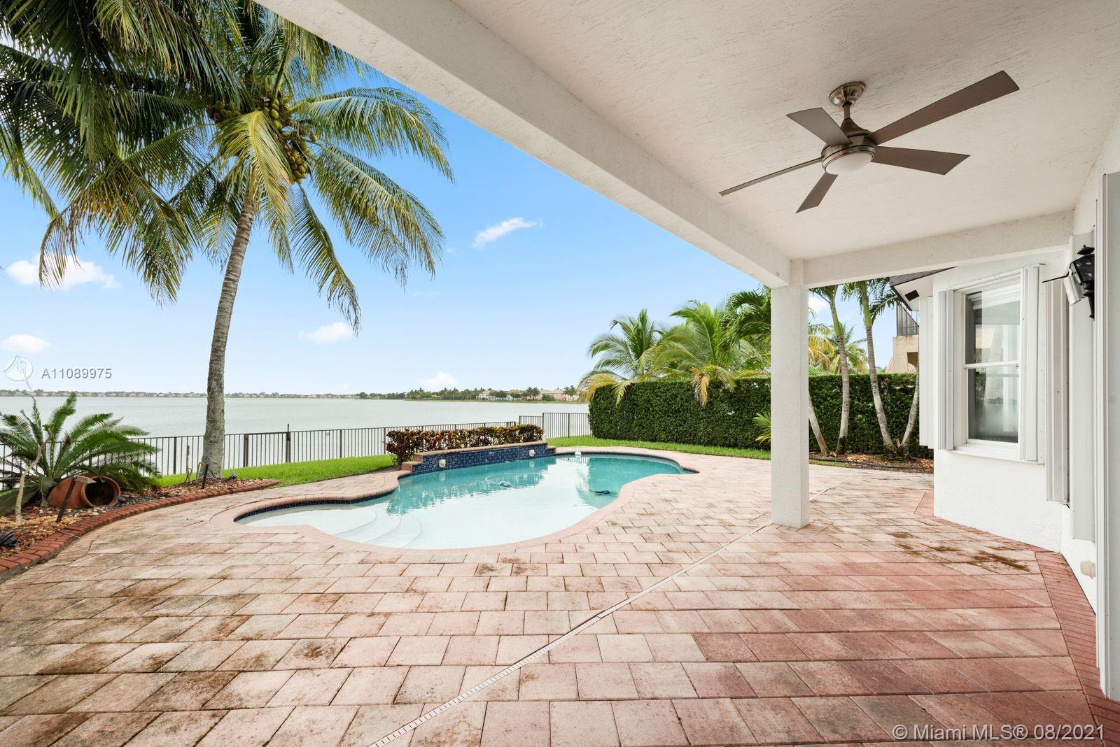Absolutely stunning wide lake views from this desirable Sunset Falls pool home. Enter into the formal living room with breathtaking high ceilings allowing in abundant natural light. Elevated dining area leading into the beautifully remodeled kitchen with an oversized island & quartz countertops. Enjoy endless pool & lake views from the large family room that leads out to the patio where you can enjoy one of a kind sunsets on one of the largest lakes in Miramar. The master has a sitting area, bathroom with huge walk in shower & custom closets. Huge master bedroom balcony perfect for morning coffee with a water view! Jack & Jill upstairs bedrooms & a bedroom with bathroom & half bath downstairs make for a perfect layout. Gated community with a pool, exercise room, tennis, basketball & parks