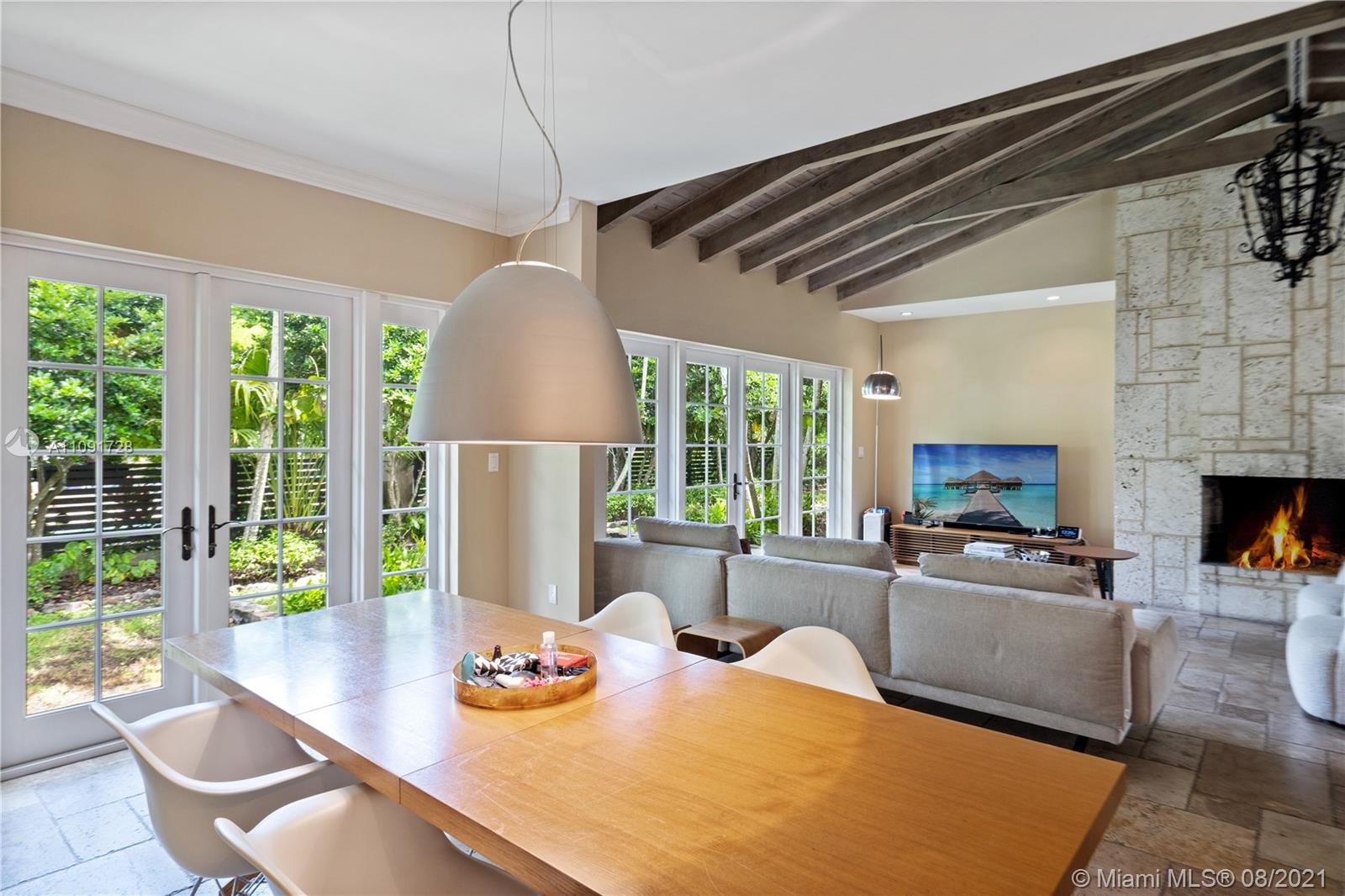 This stunning residence sits on a 15,000 Sq.Ft lot, rare to find in the Gables!! Beautifully designed with vaulted ceilings in the living room featuring a wood burning fire place. Tumbled Jerusalem Marble & hard wood floors. Open format kitchen with lots of cabinetry and storage space. Natural light in every room with impact glass windows, salt water pool. Great location on a beautiful tree lined street near Merrie Christmas Park!