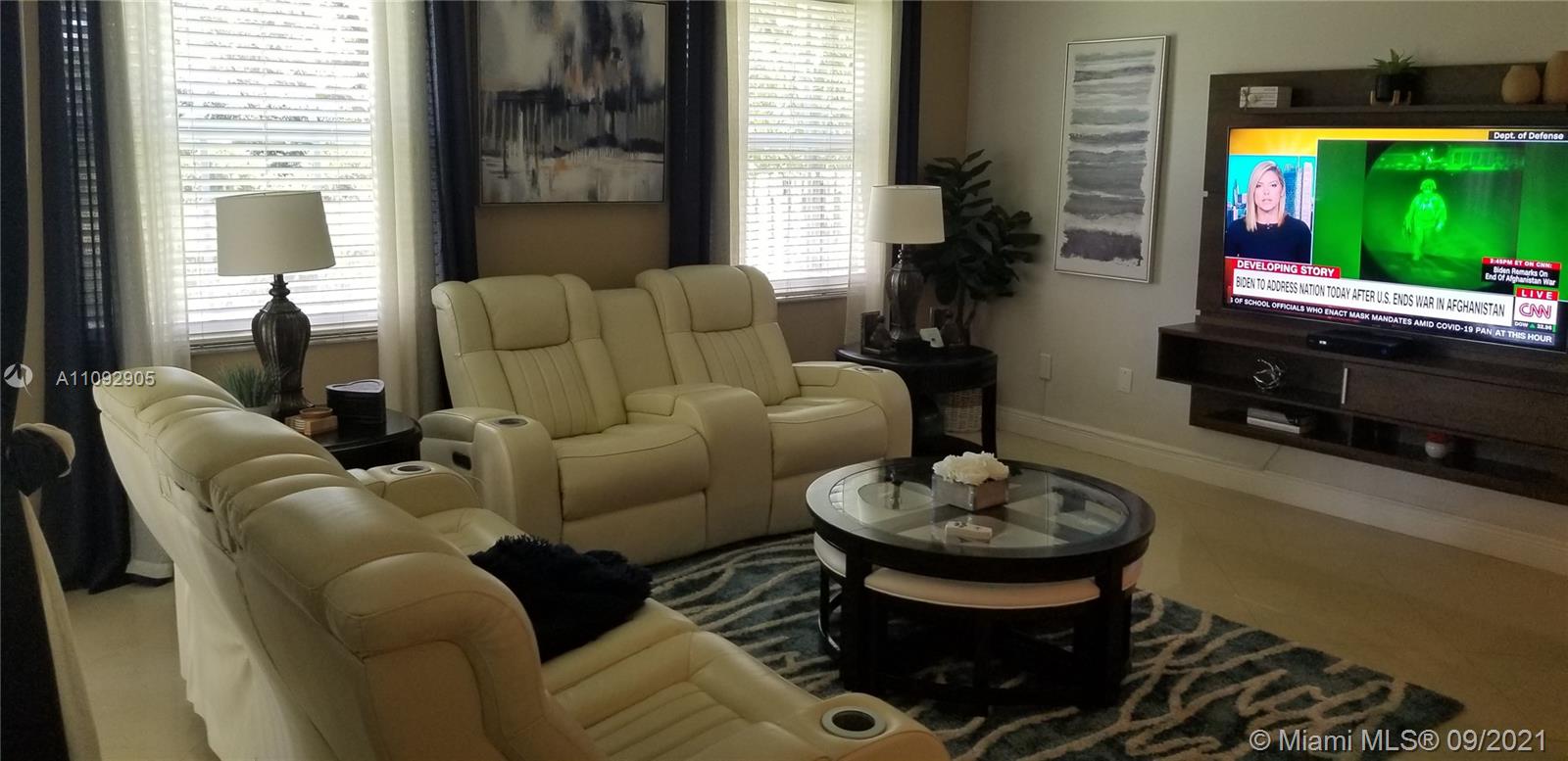 Gorgeous Home in West Miramar. Pride of Ownership shows in this home. Shows like a model. Enjoy quiet evenings on covered back patio with water views. This 5/3 two story home features 3 car garage with electrical outlet to charge an electric car. One Bedroom on first floor. Beautiful built-ins in Family room and Livingroom. This home is in a gated community with Olympic size pool with gym. tennis court, basketball court, and recreational space for parties & gatherings. Front lawn service and basic cable is included with HOA Fee. Priced to sell. Private showings only. Call today for your tour.
