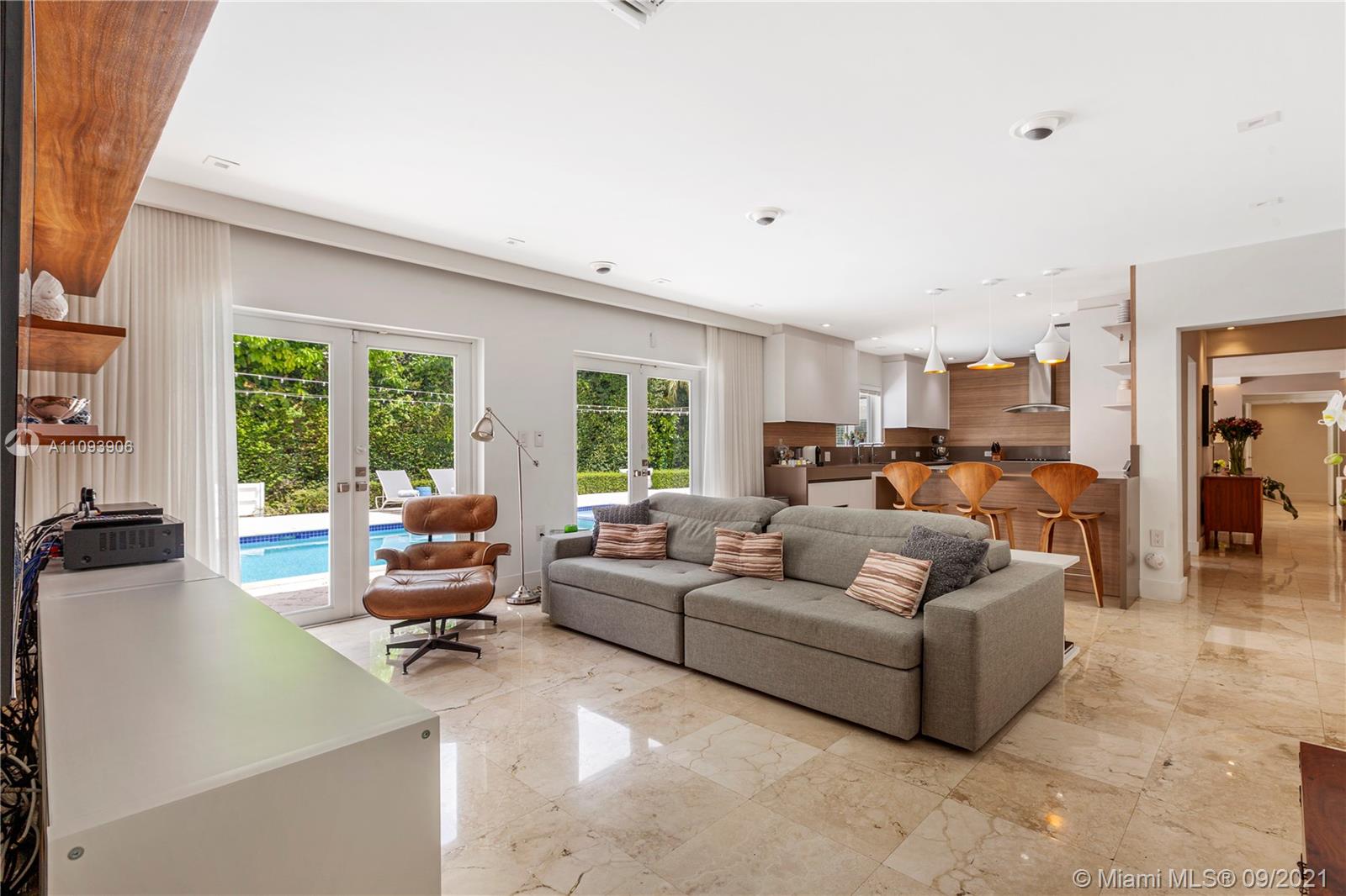 Stylish and Elegant one story home sitting on a 19,422 SF corner lot at a prestigious Coral Gables address. This tastefully completed renovated 5BD/6BA home features exceptional finishes like Ornare kitchen; high end appliances; recess lighting; linen curtains & plantation shutters; surround sound system; heated pool; generator; impact windows; marble and wood floors and more. New owner can start to enjoy this great turnkey house immediately. Very low running costs. Close to top schools, shops and entertainment. Ideally located for a healthy and active lifestyle.