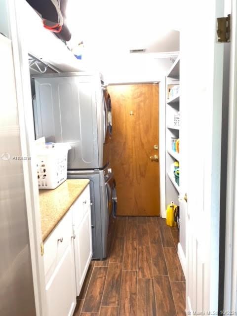 The home is located in highly desirable subdivision Jacaranda Lakes. It is on one of seven lots that have a double water view. Once you open the front door you see an spacious open concept and beautiful porcelain tile wood plank floors. The home has four bedrooms and 2 baths. All bathrooms have been remodeled. The master bathroom has a cabana style that goes right out to the salt water pool. The outside and inside of the home have been repainted 2021. The air conditioner is newer (2020). The saltwater water pool is very inviting. It leads out to amazing outside space that consists of a 16x12 wooded deck with benches. All centered around a brick fire pit and relaxing waterfall. Also outside is the outdoor kitchen and covered area. Hurricane windows and doors are prominent throughout.