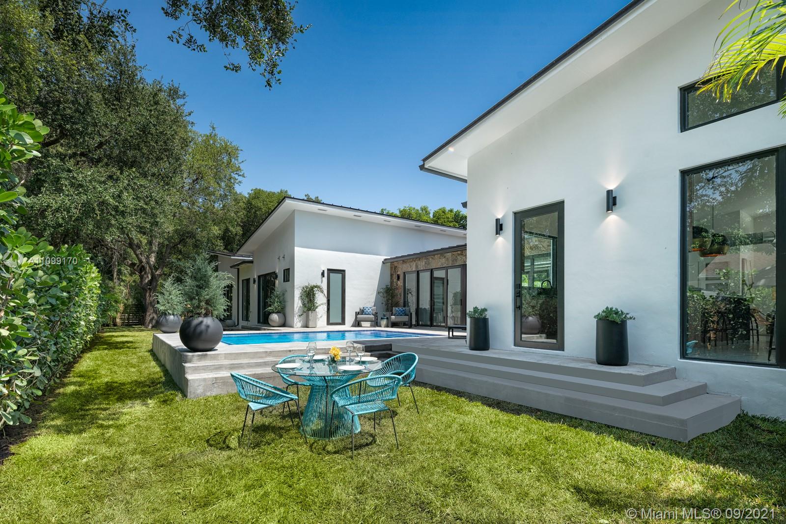 Introducing Dragonfly, the most iconoclastic new home built in Miami Shores. The Corbusier and Mies van der Rohe inspired pool home reveals “less is more” design- three planar forms, clean simple lines and honest use of materials, creating a rectilinear pedestal floating above the natural habitat. Unobstructed open free flow interiors wrapped in floor to ceiling impact glass walls and doors for abundant natural light. Triple single-pitched roofs create the iconic dragonfly form, with sloped soaring 16 ft ceilings and seamless indoor-outdoor living. Great features: luxe eat-in kitchen, artisan polished concrete floors, exposed industrial AC ducts, custom closet systems, designer baths and access to lush gardens from every room. For a truly unique non-traditional design, discover Dragonfly!