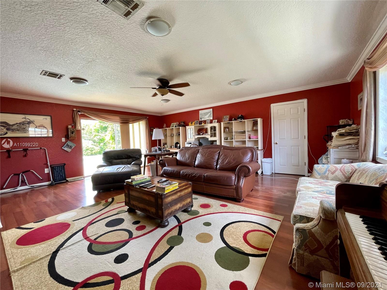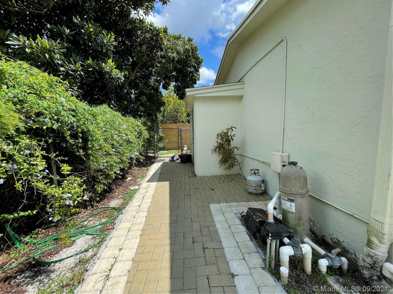 Don't miss out on this amazing single family pool home nestled in the quiet West Boca community of Palmetto Pines!! This home has 3 bedrooms with a fourth that can be used as a bedroom or office, and 2 bathrooms. The pool area is great for entertaining with complete privacy from the lush greenery, sun set awning, and a heated outdoor shower! There is a great fenced in spot on the side of the yard to house a variety of options, a home security system, and water sprinkler system. Home has a new AC and water heater, hurricane panels, hardwood floors, crown moldings, and plenty of storage space. There are two custom built storage areas in the back and storage units built into the garage. Low HOA!!! Just $33 per month!