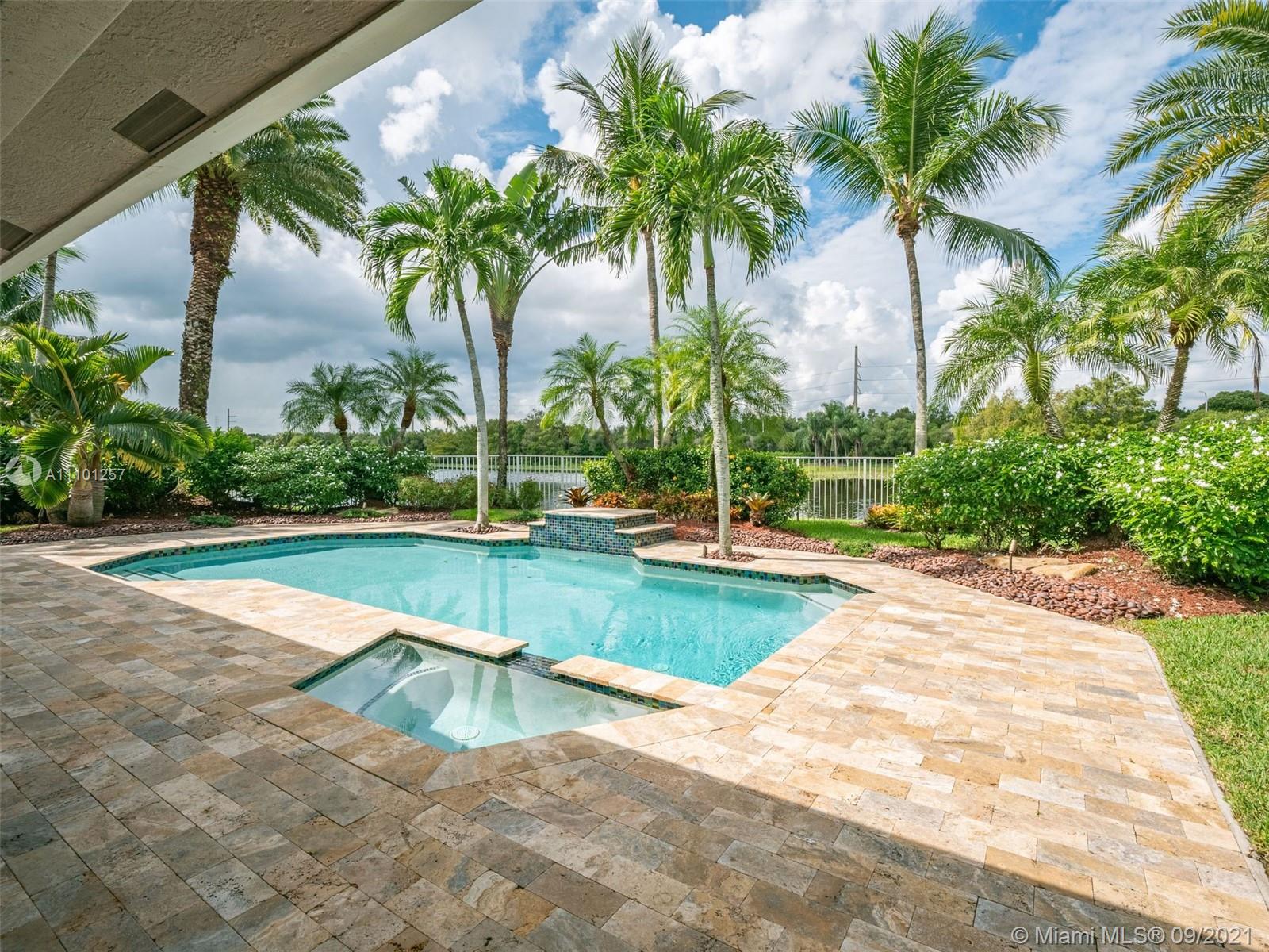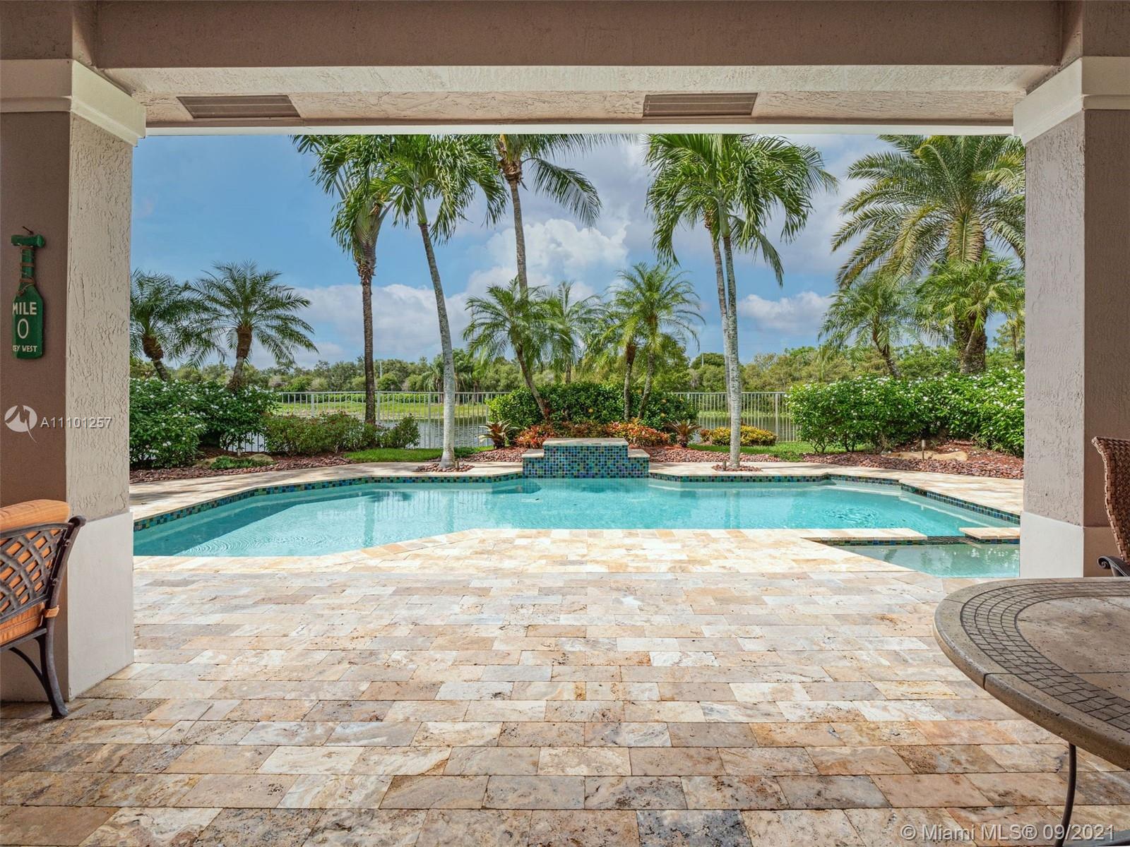 Stunning 2-story lakefront home in the exclusive Weston Hills CC - Hunter’s Pointe! Impeccably maintained, freshly painted & move-in ready. 4 bedrooms/4 full bathrooms/ office. 24 x24 Travertine floors, NEW designer kitchen w/ stainless appliances and custom marble table. LED lighting throughout, Hunter Douglas silhouette blinds and window treatments, lots of closets for storage, pre-wired surround sound & Ring doorbell. Hardwood staircase as well as the second story flooring. Magnificent backyard lush landscaping, LED landscape lighting & spectacular sunset views. NEWLY remodeled resort-style heated, saltwater pool with waterfall & spa. Outdoor wet bar w/ lights, refrigerator, speaker wiring & television. Live like you’re always on vacation! Accordian shutters. 3-car garage. A+ schools