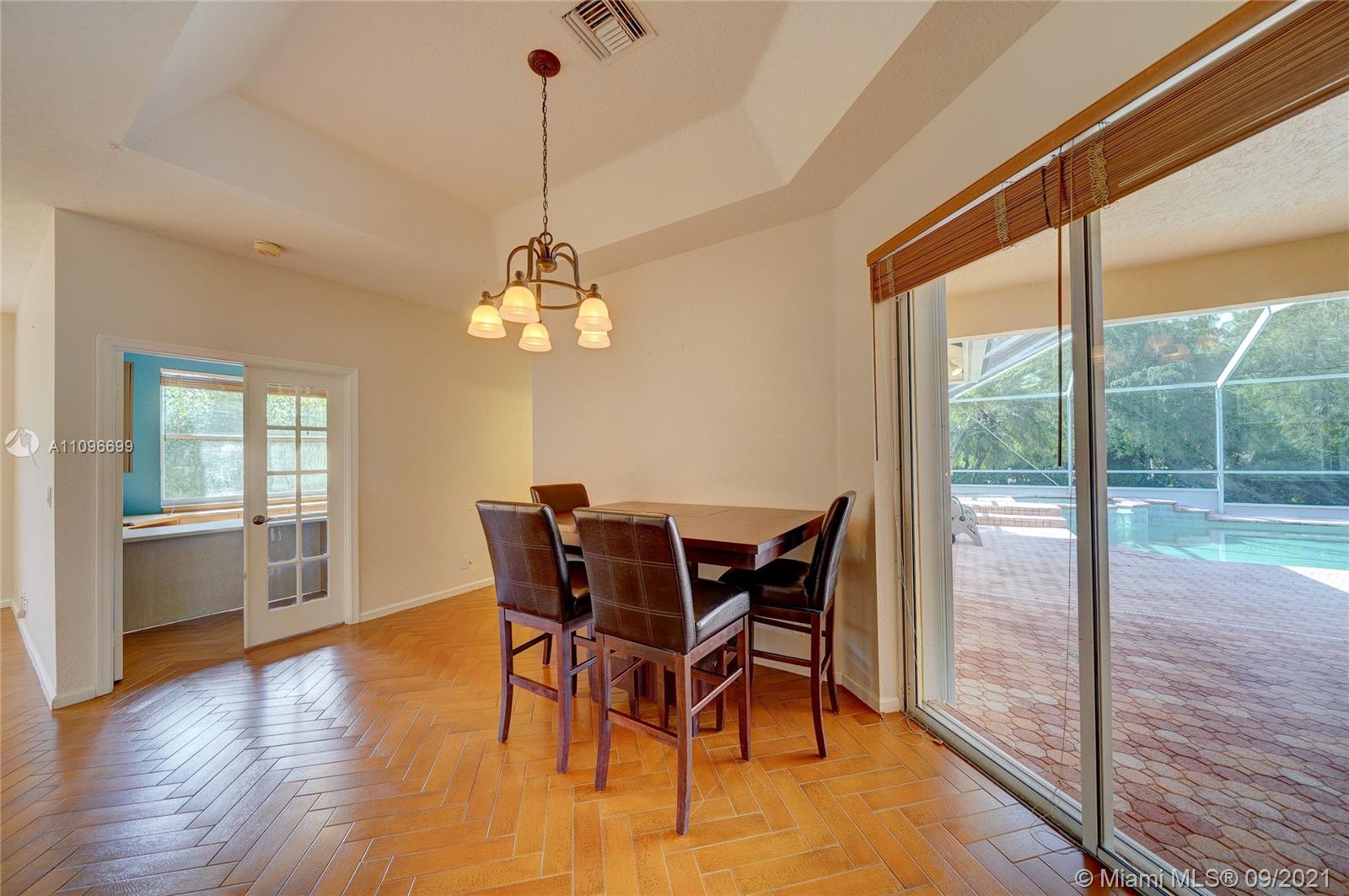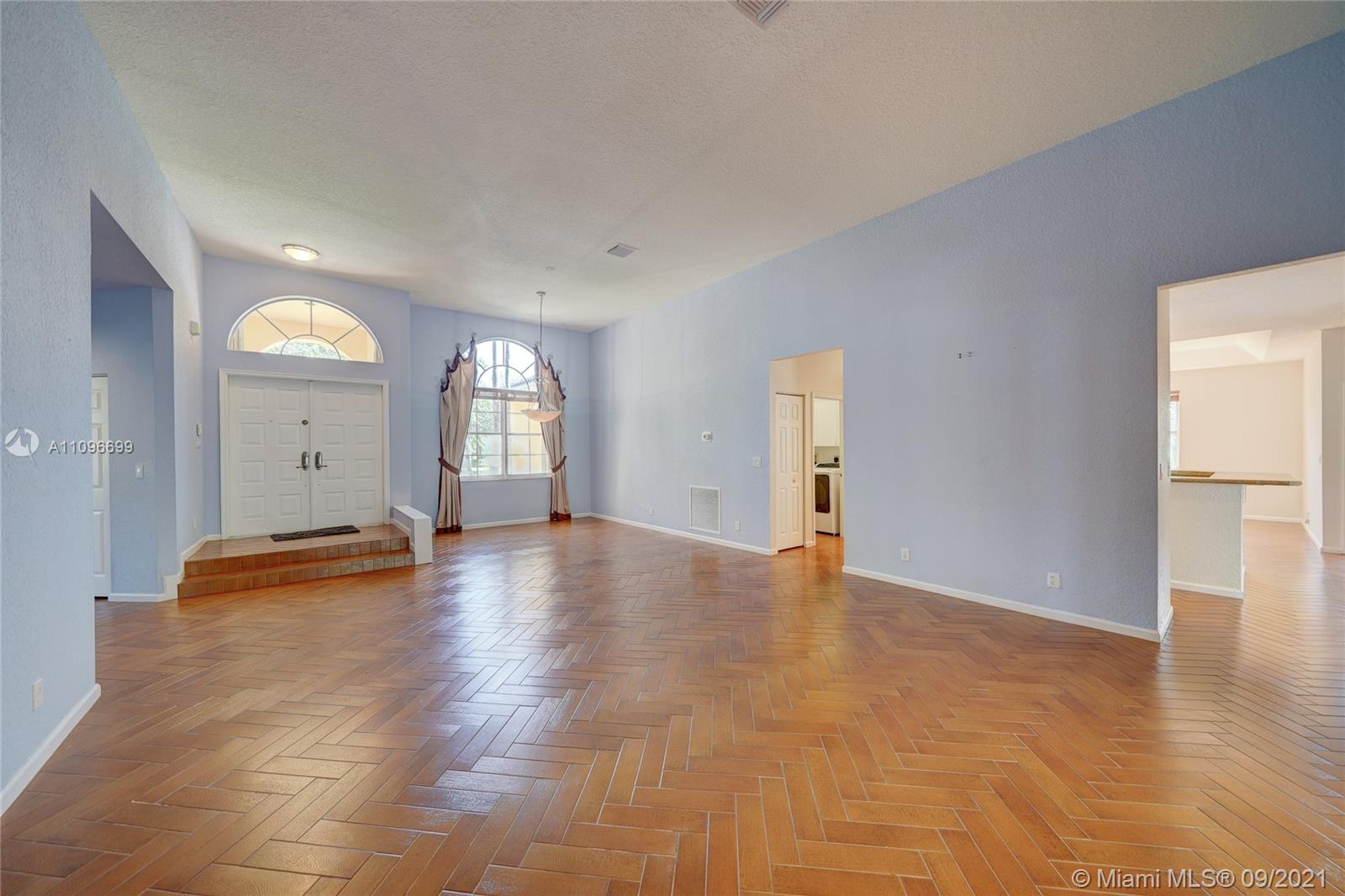 Rarely available home in the guard gated community of Country Glen. Sought after split floor plan in this 5 bedroom 3 bathroom home on over a quarter acre of land. Gorgeous neutral herringbone tile floors in all main living areas, and 5th bedroom. Soaring ceilings in the living and dining room. Oversized master suite with tile flooring, and dual closets including large walk-in. Master bath features dual sinks, and separate tub and shower. Open kitchen overlooks the spacious family room. Big secondary bedrooms with laminate flooring, and one with en-suite. Expansive covered patio overlooking the screened in pool, and canal. Accordion shutters, and plenty of amenities in the community including child playground, tennis courts and basketball.