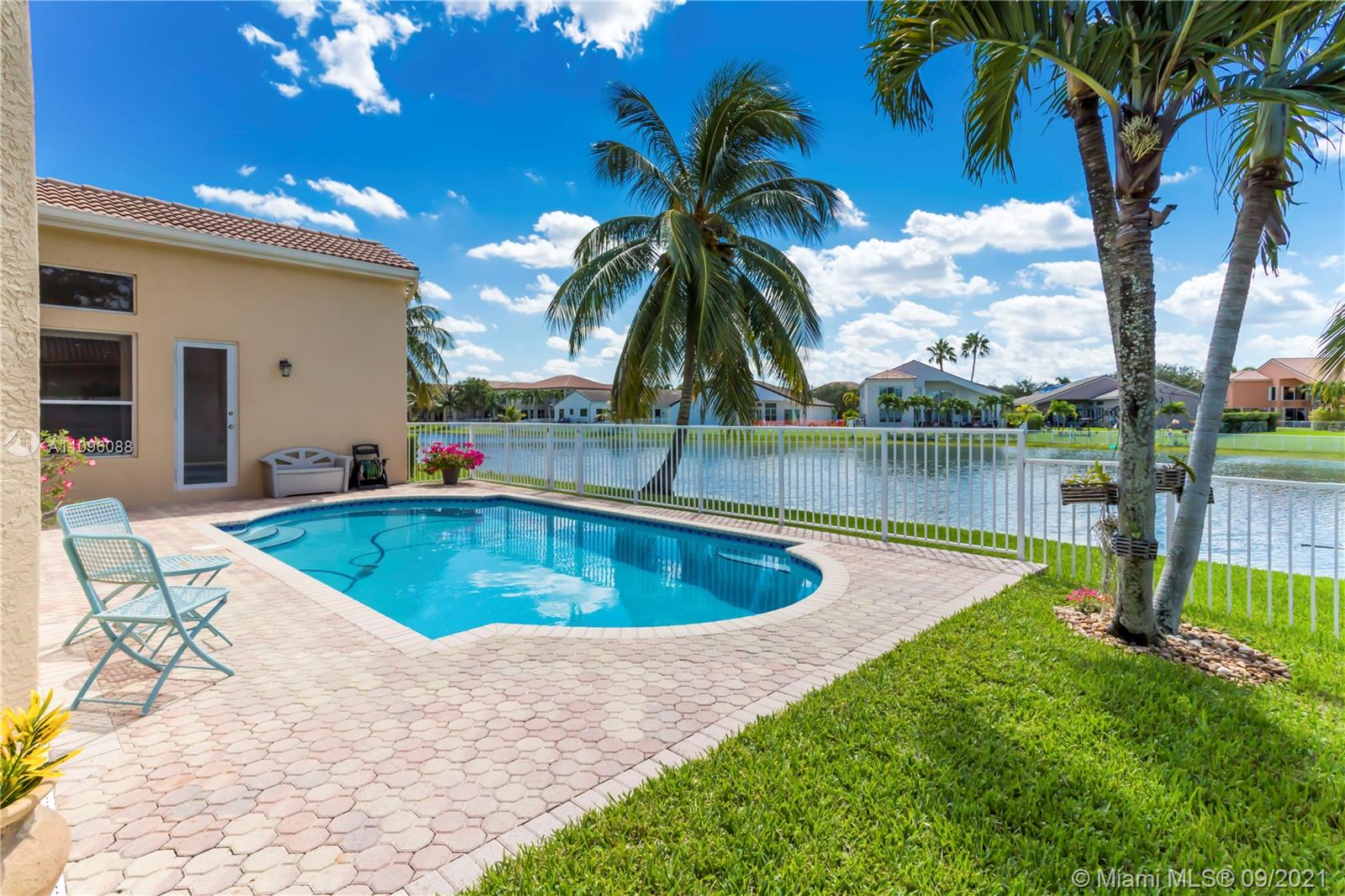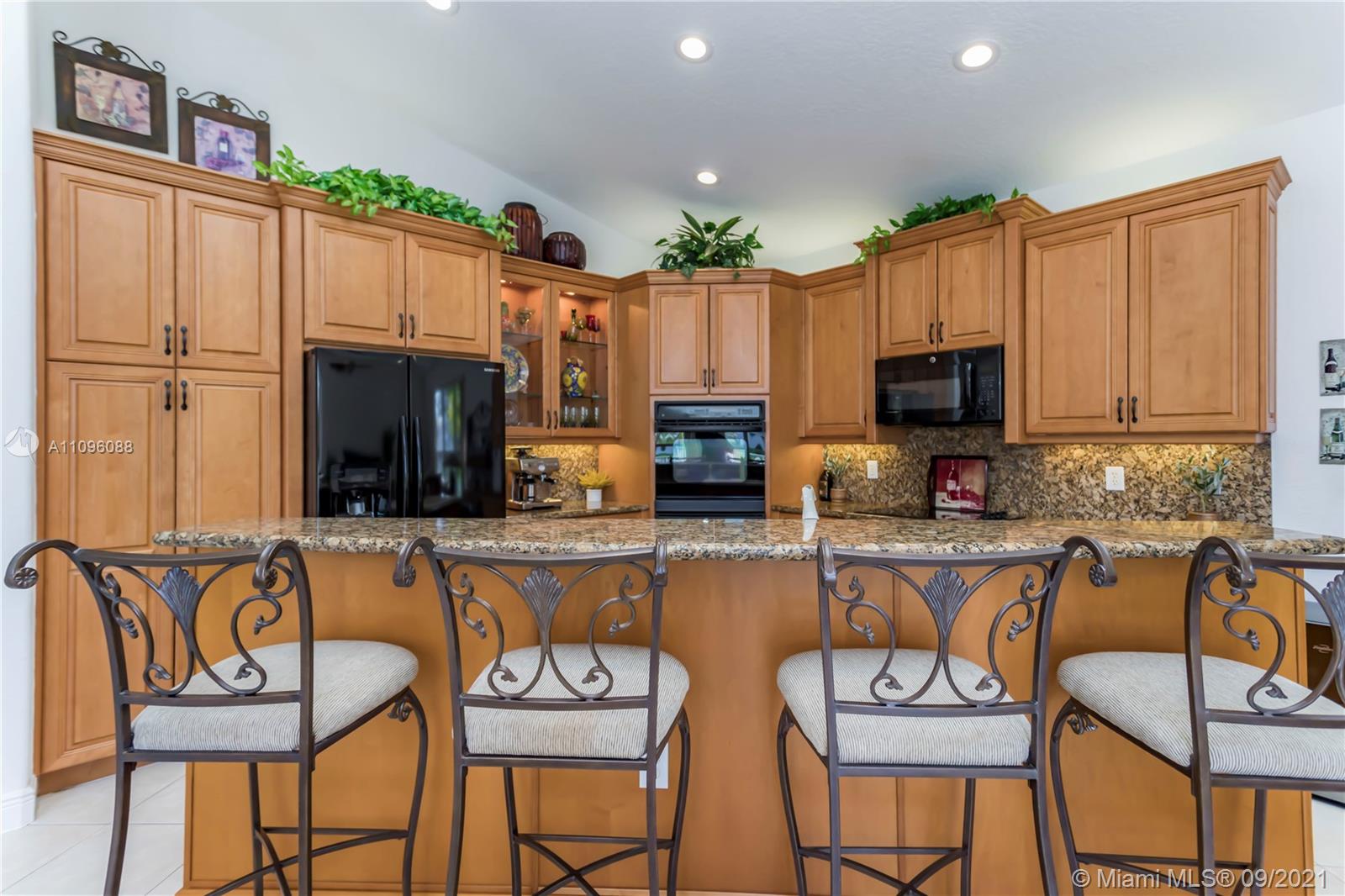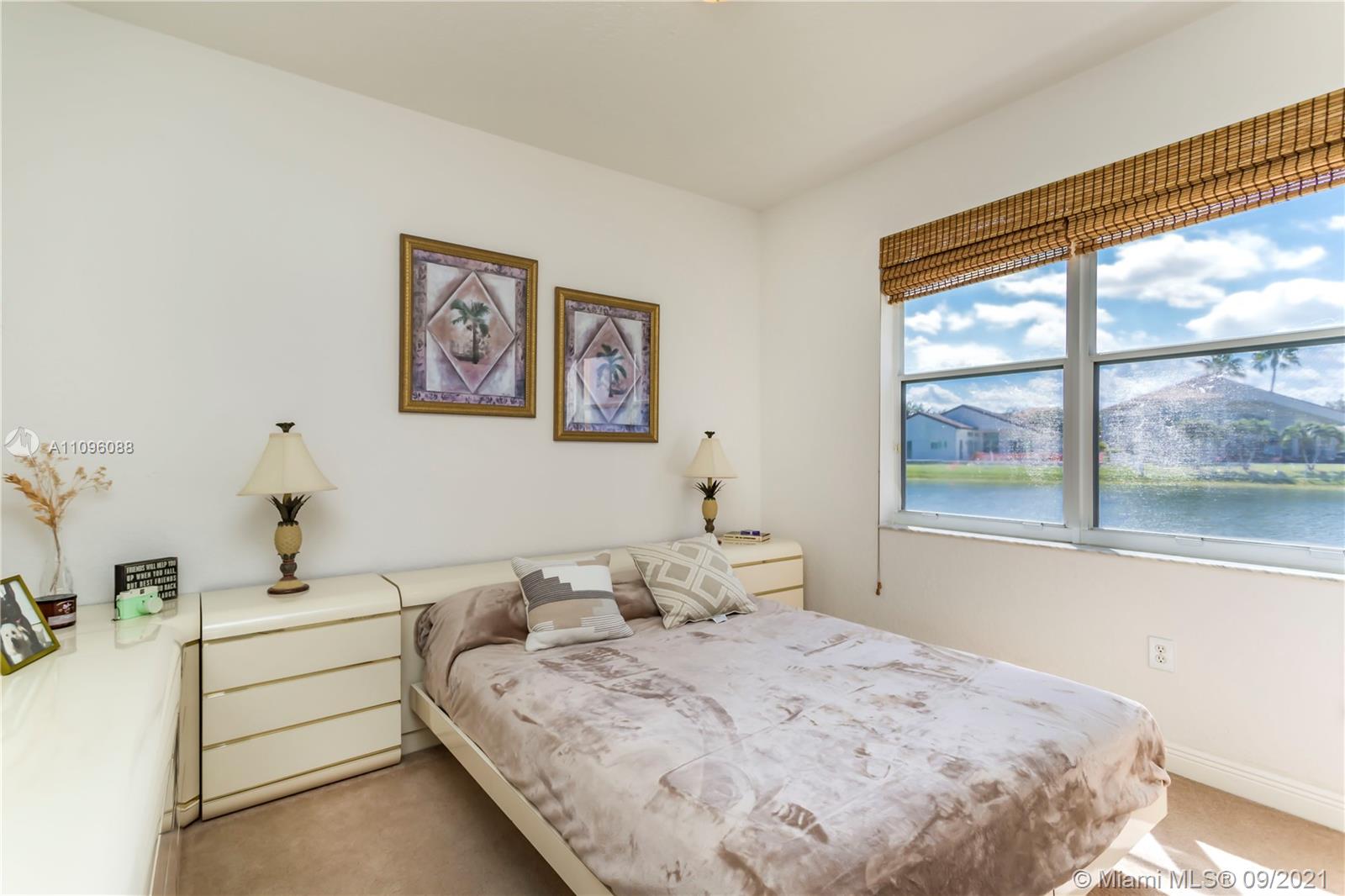 Welcome to the Sofia model, a sought after one-story home in the stunning resort community- Sunset Lakes. Upon entering, you're embraced by the sunlight shining throughout, center of the home features an elegant living room w/patio doors leading to the patio & pool area. Walking thru you'll notice dramatic coffered ceilings, inviting arched doorways w tasteful architectural accents. A warm inviting upgraded kitchen w adjacent breakfast nook are equipped w/extra storage, double oven, custom wood cabinetry, & granite counters. A true 5 bedroom w/a triple split plan, gives everyone private space to enjoy. Master suite is located on the west side of the home, w stunning pool & lake views. The custom oversized pool was recently resurface. Freshly painted exterior. This home is not one to miss!