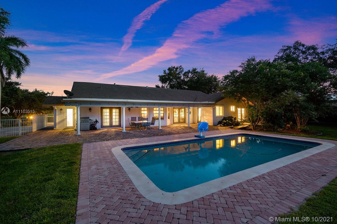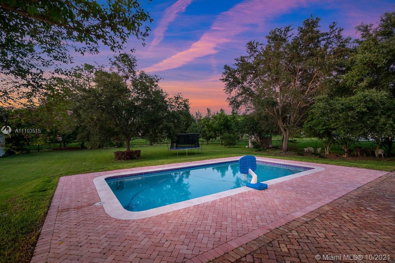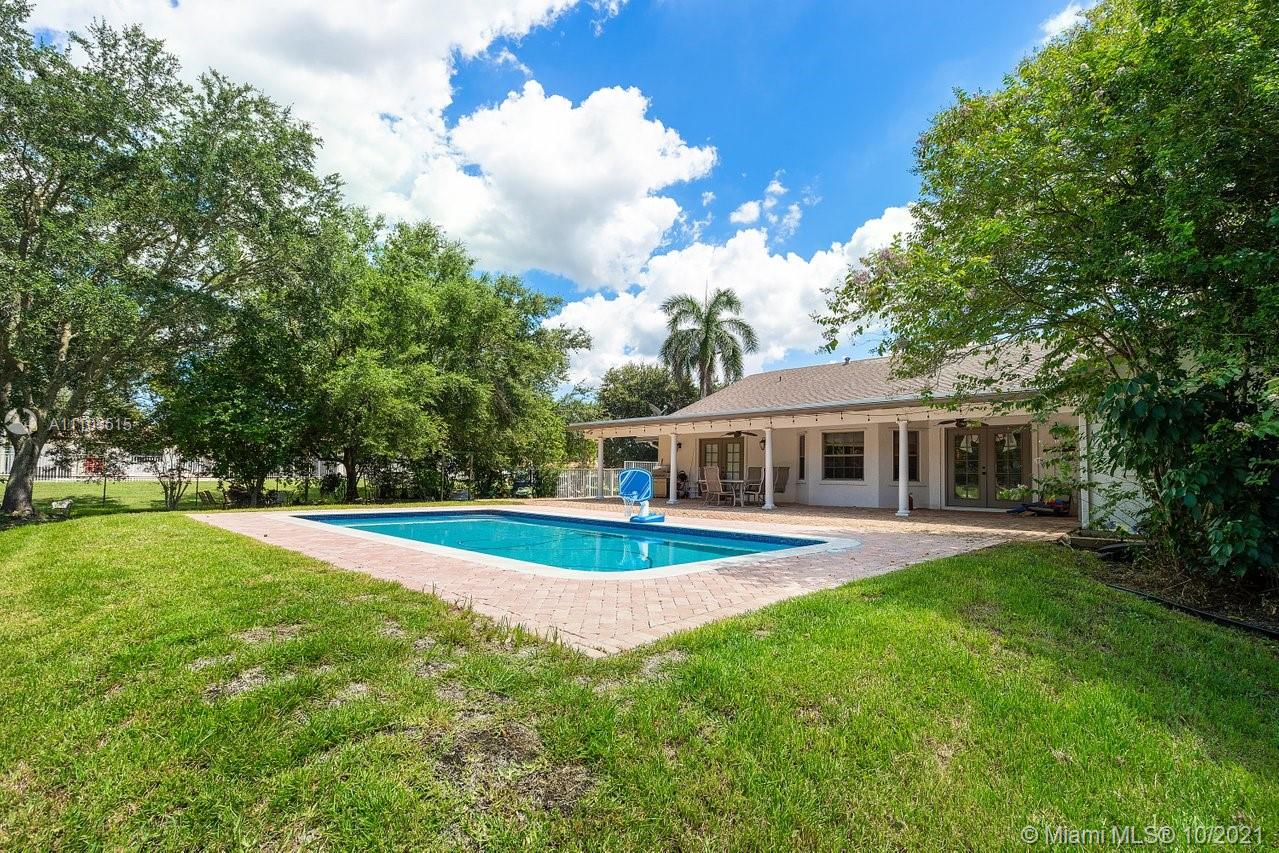 Live the Lifestyle! 4 BR 3 BA 3069 SF SW Ranches waterfront with new pool, separate in law entrance for 1/1 with split bedroom floor plan. Finished with High end Interior features. Huge Chicago bricked patio over looking pool. 1.27 fenced acre. Lush landscaping with avocado and mango trees. New water system. Private cul de sac. Lg Master w/ stunning spa like bath with jacuzzi tub, subway tile and marble. Walk-in closet. French doors lead to small private patio off Master BR. Beautiful trim work, chair railing, custom cabinetry and combo of travertine and real wood floors. Open Kitchen overlooking family room and dining room. Wood cabinets granite countertops. Front formal living rm/office with built in cust cabinetry. Home is in top A rated school district. Build a barn bring your horses!