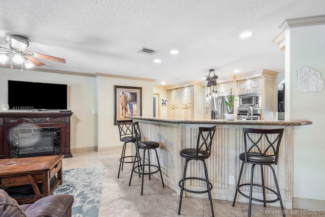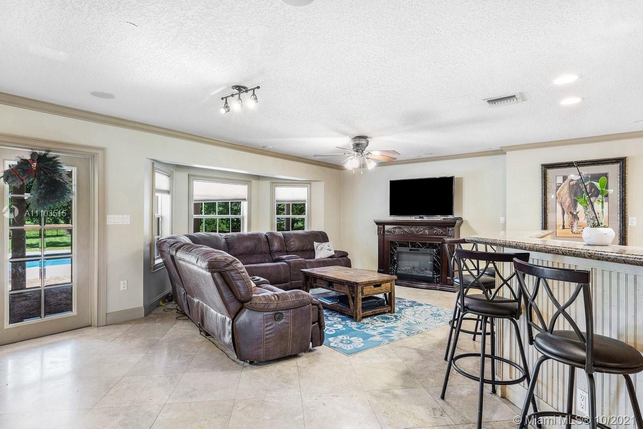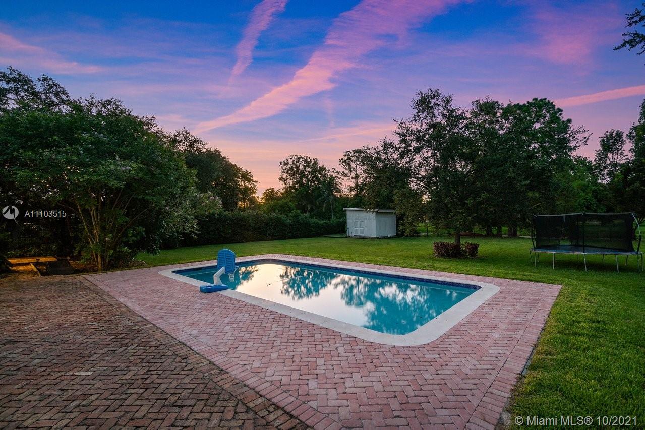 Live the Lifestyle! 4 BR 3 BA 3069 SF SW Ranches waterfront with new pool, separate in law entrance for 1/1 with split bedroom floor plan. Finished with High end Interior features. Huge Chicago bricked patio over looking pool. 1.27 fenced acre. Lush landscaping with avocado and mango trees. New water system. Private cul de sac. Lg Master w/ stunning spa like bath with jacuzzi tub, subway tile and marble. Walk-in closet. French doors lead to small private patio off Master BR. Beautiful trim work, chair railing, custom cabinetry and combo of travertine and real wood floors. Open Kitchen overlooking family room and dining room. Wood cabinets granite countertops. Front formal living rm/office with built in cust cabinetry. Home is in top A rated school district. Build a barn bring your horses!