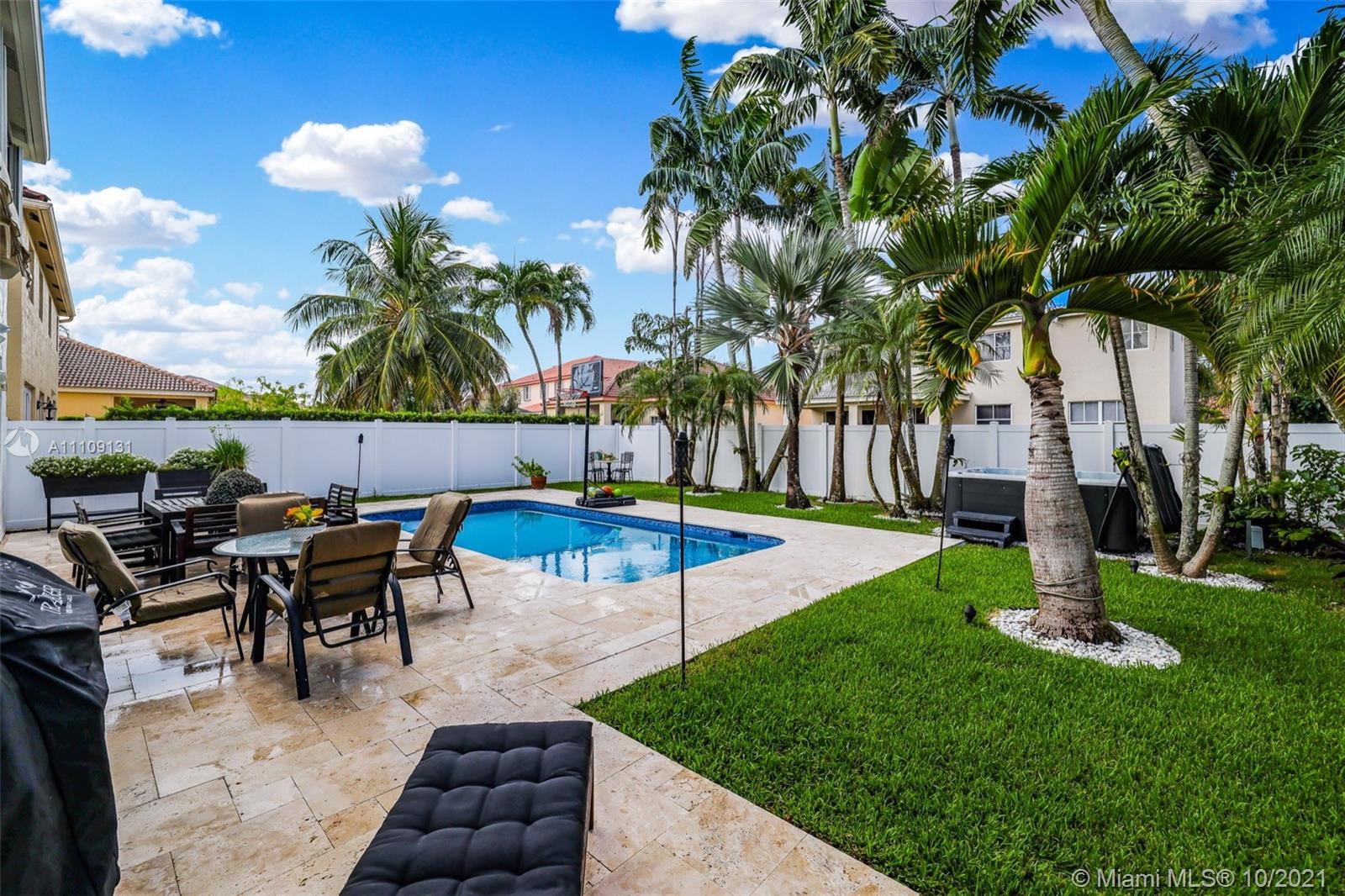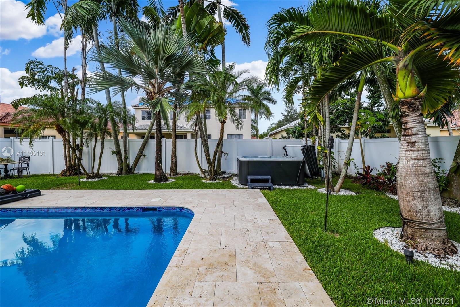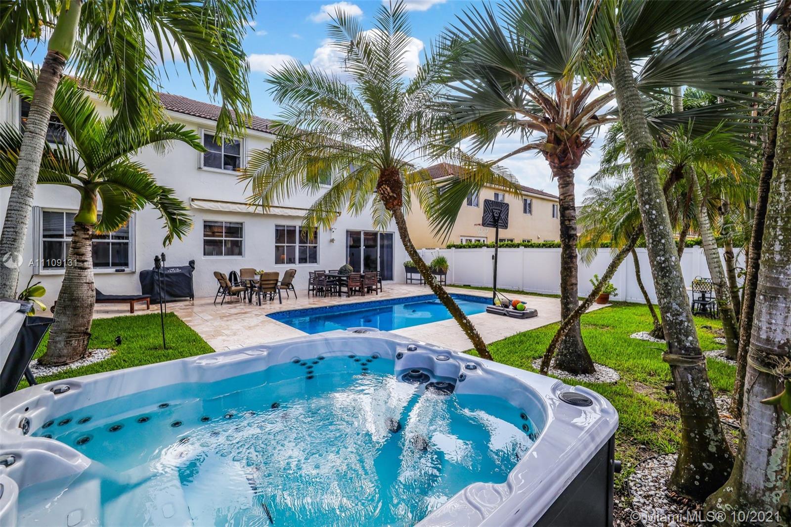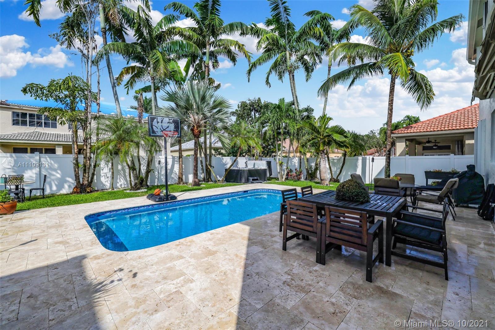 Welcome Home! Amazing Home in gated community The Meadows. Bright open lay out with high ceilings, renovated kitchen in 2016 with white cabinets and Calacata Gold quartz. Family room has a lot of light overlooking pool area with amazing palm. Renovated pool, travertine pavers and a hot tub. LVF flooring on main areas. 5 bedrooms, 3 full baths. Garage doors are insulated and were replaced in 202. Newer Air Conditioner and New Age cabinets in the garage. Community offers pool, playground and sports court. Gator Run Elementary School, Falcon Cove Middle School, Cypress Bay High School.