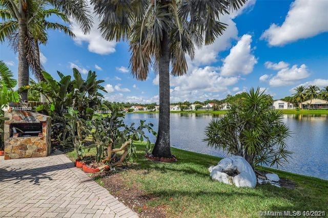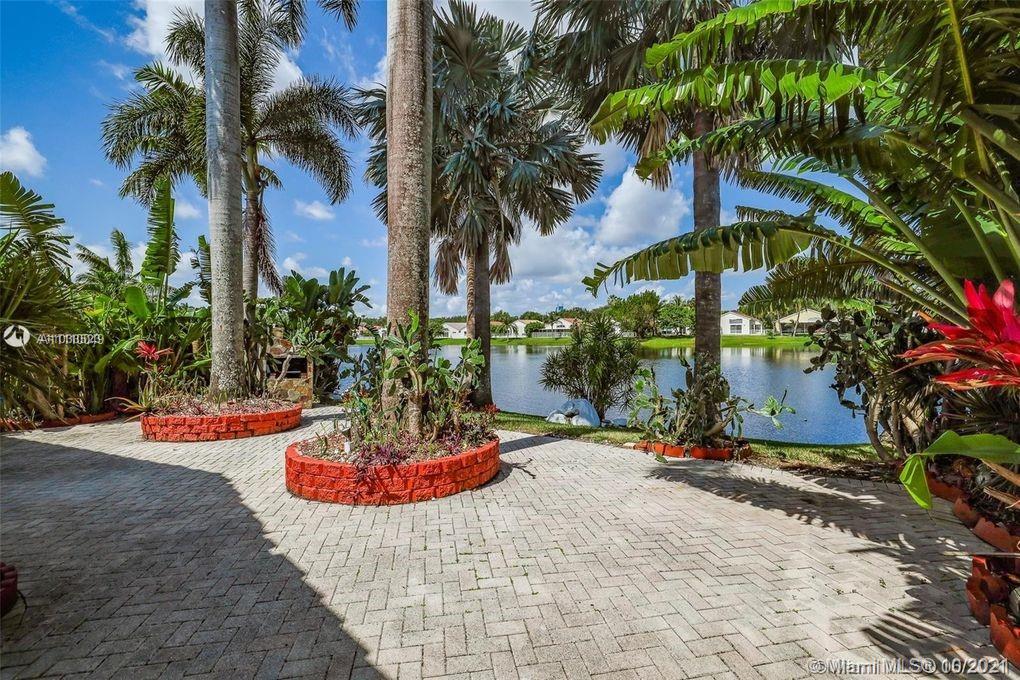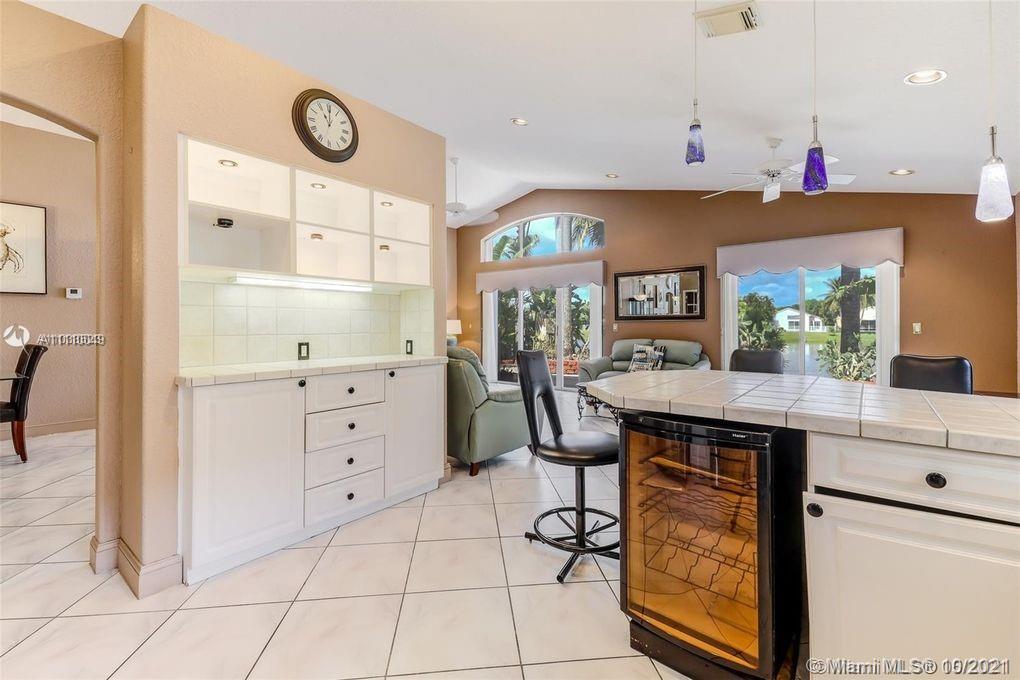 This house sits on a lake with spectacular sunset views across the water. One of the bedrooms has been converted to a comfortable home office, complete with built-ins. The eat-in kitchen features a wine cooler and a lot of cabinet space.The A/C is approximately 4 yrs. All window coverings have accordion shutters.stay with the house. extra cabinets in the 2 car garage.