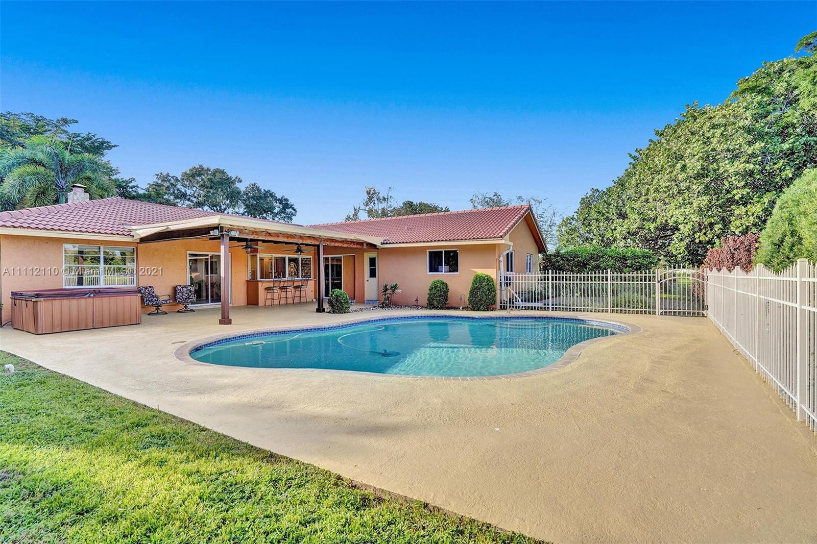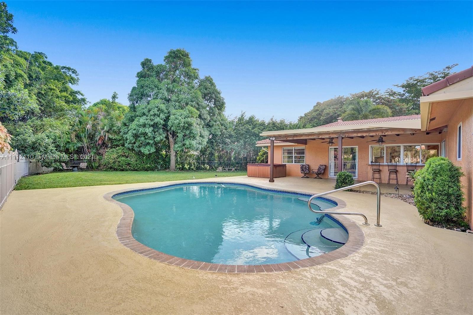 Spectacular property! Huge waterfront yard with amazing privacy located at the end of a beautiful tree lined cul de sac. Meticulously maintained. Multiple fruit trees including orange, starfruit, jackfruit, moringa and avocado. Beautiful views from every window. Charming automated landscape lighting surrounding the property and the oversized freeform, salt water pool and large jacuzzi. Whole house carbon water filtration system. Fully fenced large portion of the yard. Stunning kitchen with custom cabinetry with Juparana Arandis granite countertops. Advantium speed cook and Blomberg wall ovens. Brazilian cherry wood floors and a working fireplace are calling for the holidays! Freshly painted inside and out. Prewired for home theater. Make this home your very own private resort.
