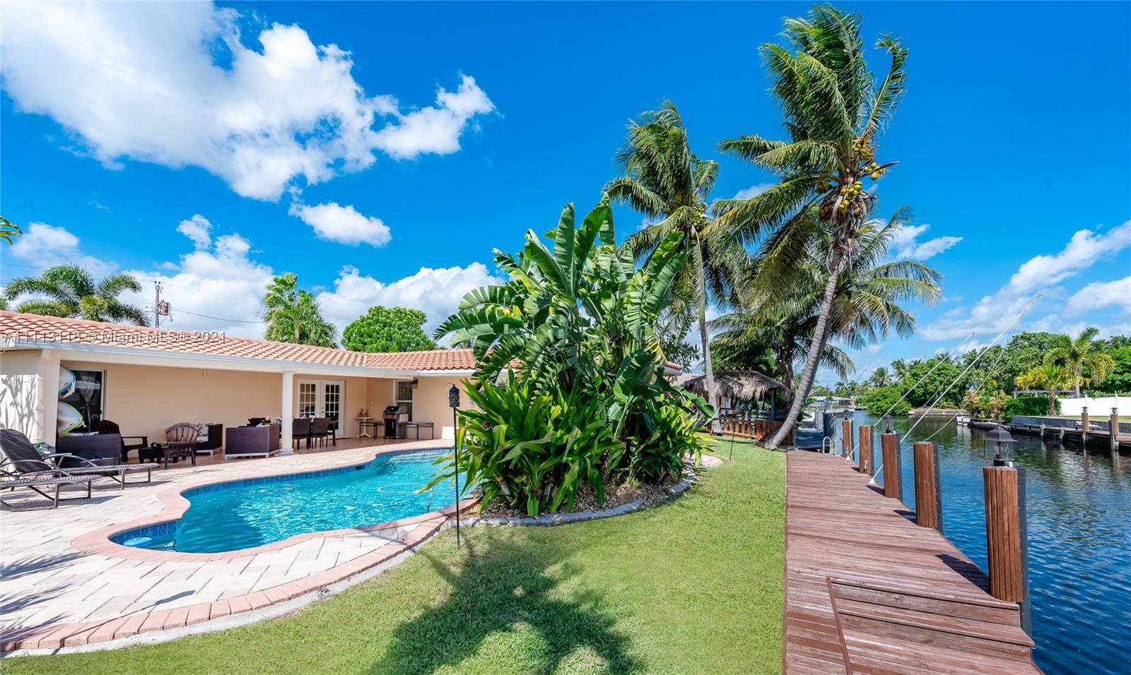 Stunning Waterfront home 3BR/2BA with Ocean access. Private 75'dock with davits, electricity and lights. Plantation shutters and French doors that allow for plenty of light. Lush Landscaping throughout and an incredible terrace, patio and paved pool/spa deck where you can enjoy the South Florida Sunshine. Modern kitchen, SS appliances with access to charming pergola covered patio area. Separate laundry room and storage area. This is the last house for sale in this amazing quiet location. With private 24/7 security. NO HOA.