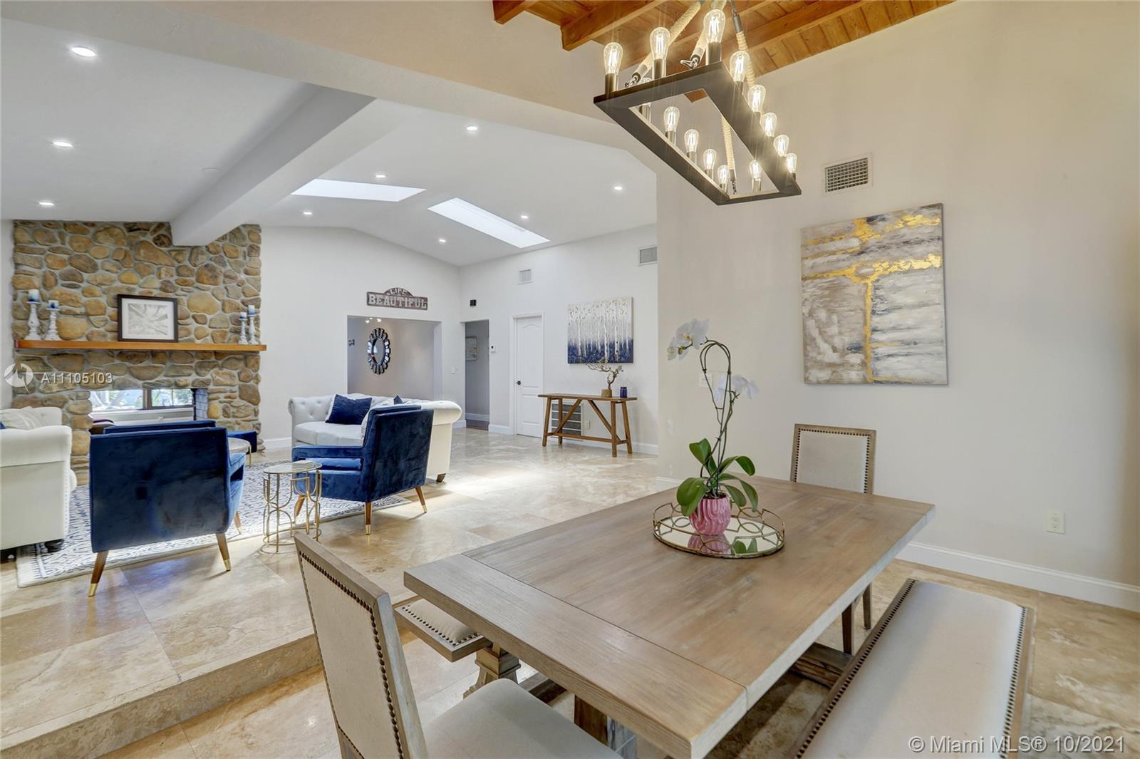 Immaculately maintained & beautifully updated 4 bed ranch in desirable gated, Bal Harbour. Entertainers home w/ gorgeous vaulted beamed ceilings lined w/ tongue & groove wood, large bright open concept & spacious family room & double sided stone clad wood burning fireplace & skylights. Updated Chef's kitchen w/ Granite, Stainless, Gas Range, Double Ovens, new counter depth refrigerator. Updated baths & room for 3rd bath to be built. Marble & New Wood floors. Large wrap around fenced outdoor space, Pool w/ baby gate, Travertine Deck & Pergola. 2 zone AC (one from 2021), partial Impact Windows & newer Roof. Large corner lot w/ circular driveway & 1 car Garage. Walk to the Restaurants, Shopping, Whole Foods, Lululemon, Shake Shack, Barnes & Noble, Starbucks & Bike to beach!