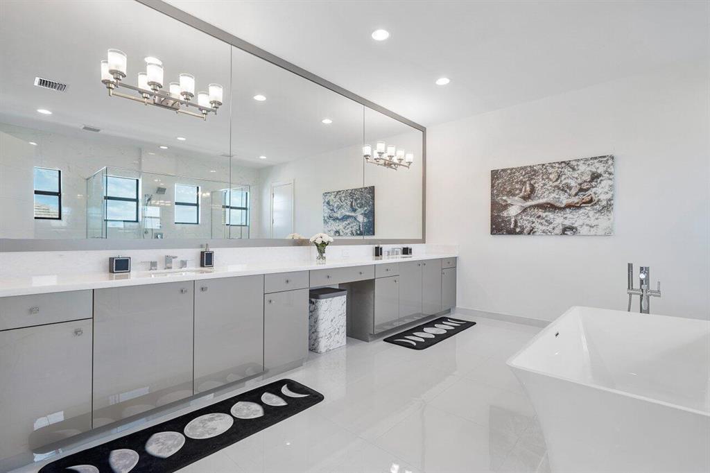 New transitional contemporary home in the community of Boca Bridges built in 2020. This gorgeous 5 bedroom home is situated on a generous lot with lake views and features a designer chef's kitchen with quartz counter tops, subzero fridge and double wolf ovens, porcelain and hardwood flooring throughout, wet bar, large pool with spa,upstairs loft, and sizable clubroom for entertaining. Other features include two 2 car garages, interior and exterior security cameras, motorized shades throughout the home, and so much more.