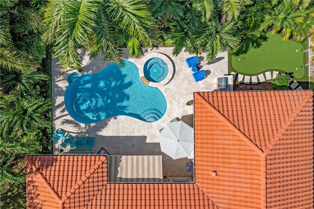 Estate style pool home w putting green & custom poolside BBQ on private, landscaped corner lot w 2019 roof and updates throughout. Triple split bedroom layout, volume ceilings, raised foyer, formal living/dining, spacious eat-in kitchen w newer appliances & induction cooktop opens into large family room. Huge Master Suite/bath w walk-in closets. Newly refreshed resort style yard w pro-caliber practice putting green, new resurfaced diamond bright pool w travertine deck, new pool pump, new heater & spa. Covered patio with retractable sun shade. Newer AC, exterior paint. Buyer pays one time $790 capital contribution at closing.
