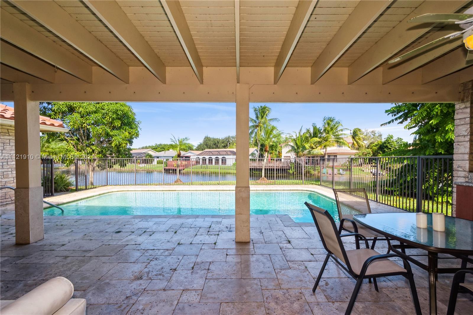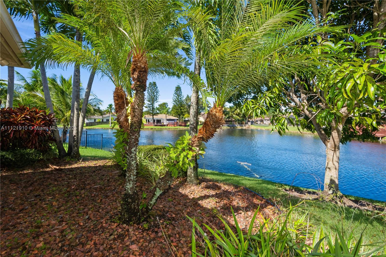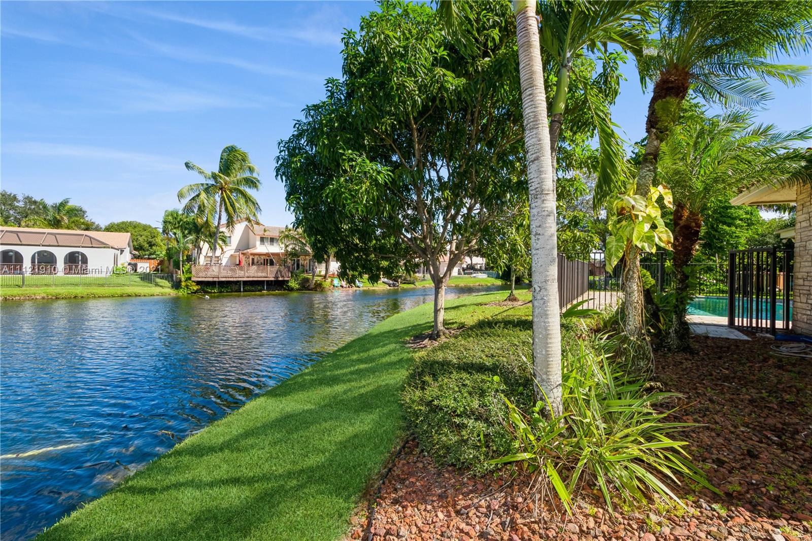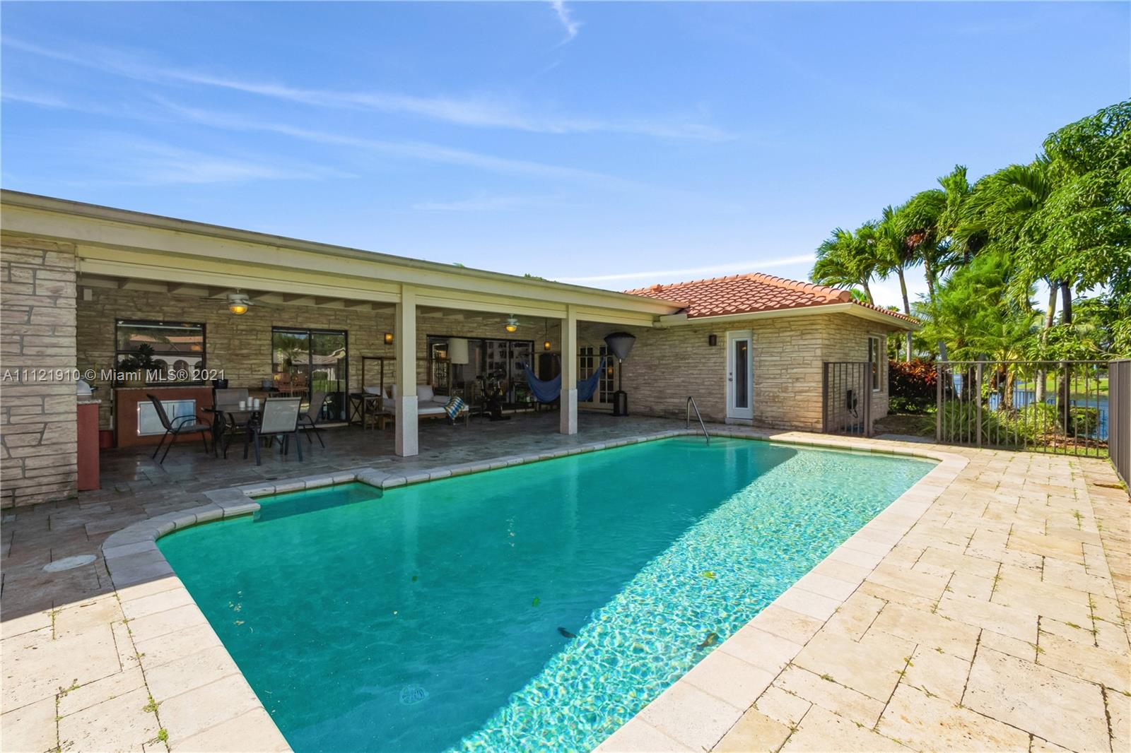 Private tropical oasis! Tucked away on a peaceful side street in desirable Jacaranda Lakes, this stylish lakefront pool home is close to everything. Enter and be wowed by the stunning stone accent wall, newly remodeled kitchen w/quartz counters and SS KitchenAid appliances, XL main suite with double walk-in closets and French doors to patio. Main bath has separate vanities, step-down shower, and a Jacuzzi tub with a spectacular lake view. Relax or entertain poolside day or night on the covered patio with outdoor kitchen. Enjoy the mature mango trees, lush palms, and fragrant ylang-ylang. Well-maintained and move-in ready. Transfer switch for generator, smart lighting, lake-fed irrigation upgraded 2018, much more. MUST SEE!