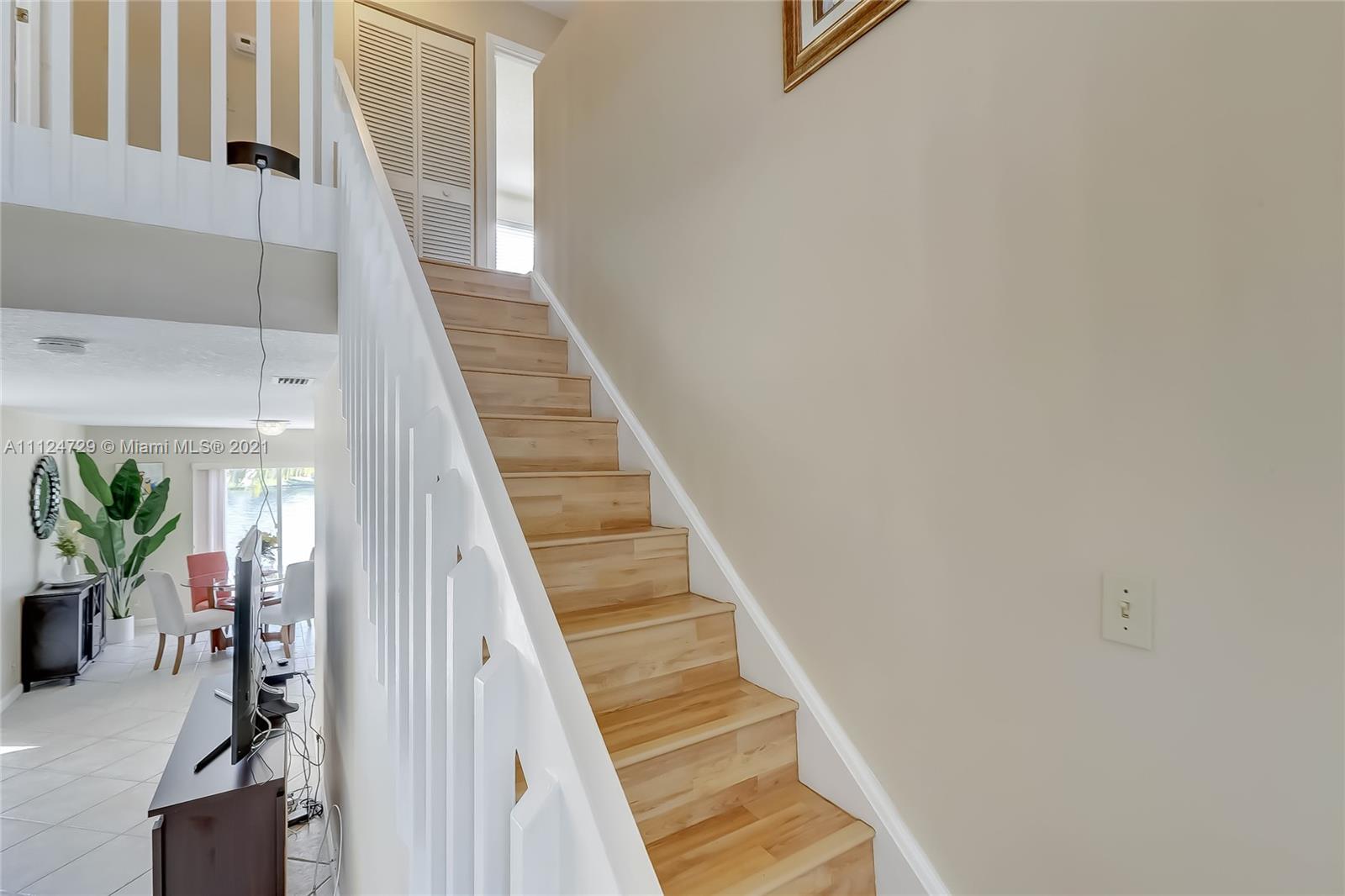 Magnificent well-maintained single-family home located in the desirable area of Plantation subdivision Fountain Springs & sits on a beautiful lake front lot. This elegant single-family home offers a spacious open plan that radiates with natural lighting. It houses 3 bed/2.5 bath. The immaculate master suite includes his & hers sinks, soak tub,relaxing shower stall & walk in closet. Downstairs has an open concept kitchen complete with quartz countertops, pantry, lots of storage & tile flooring. Upstairs has all beautiful laminate wood flooring, hurricane shutters & tankless water heater. The property has fruit trees. The fantastic backyard is your private oasis which captivates a spectacular tranquil open lake view that provides a tropical relaxing feeling for incredible entertainment.