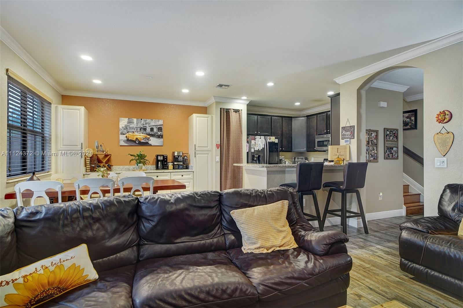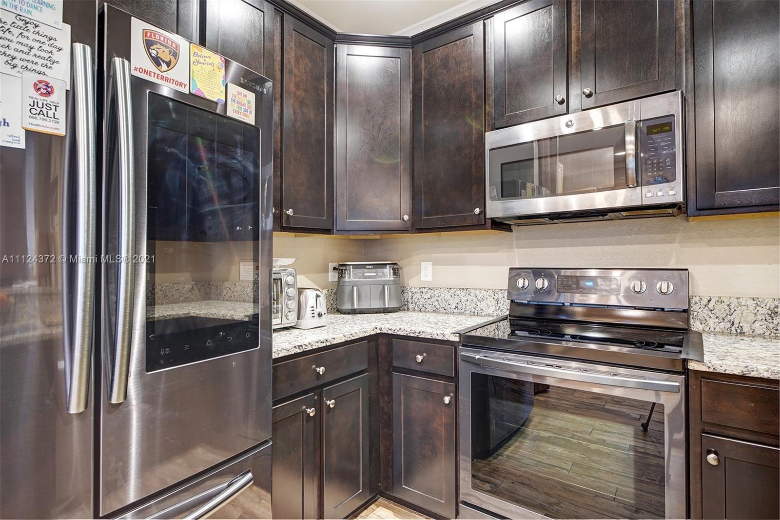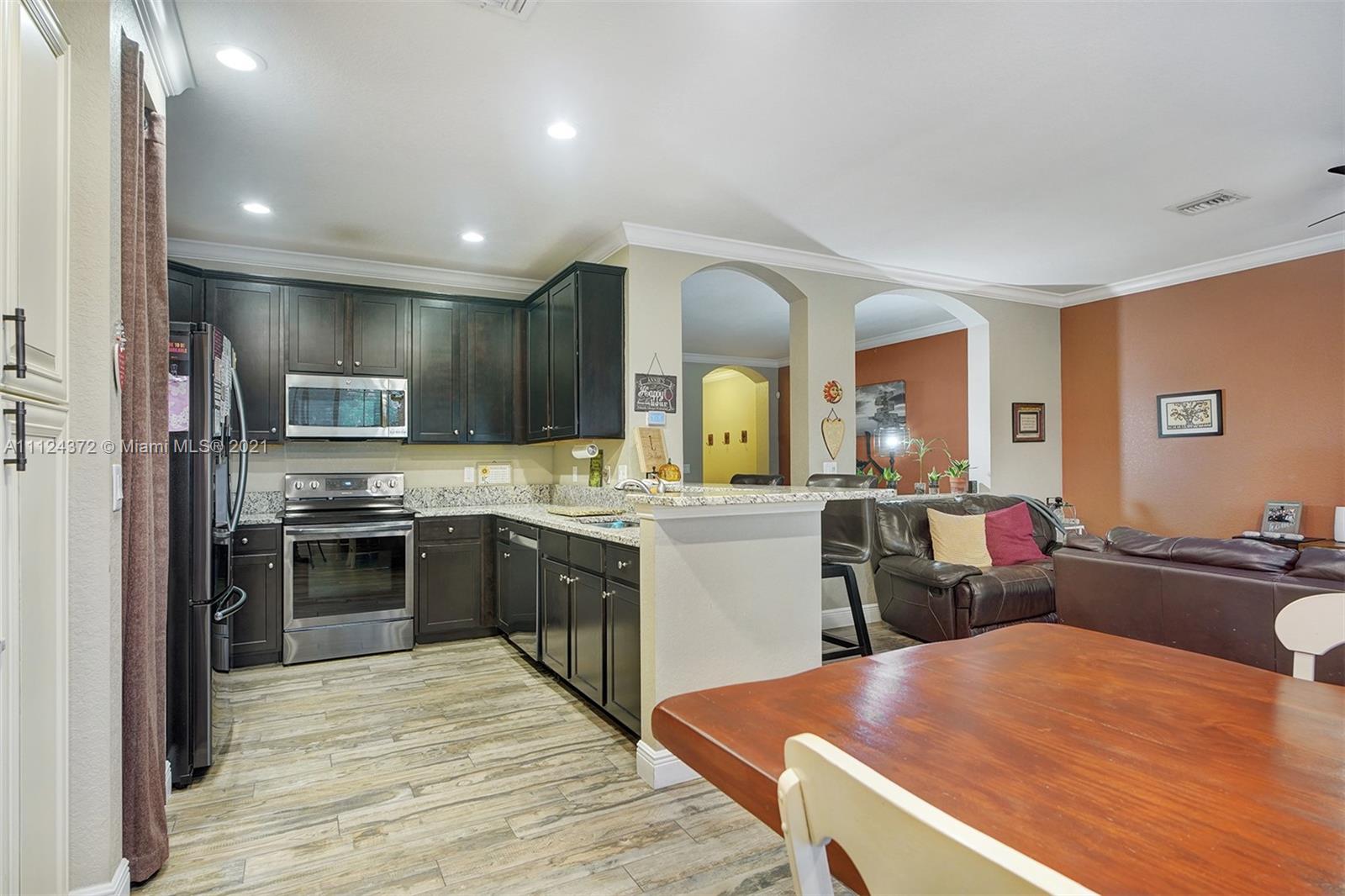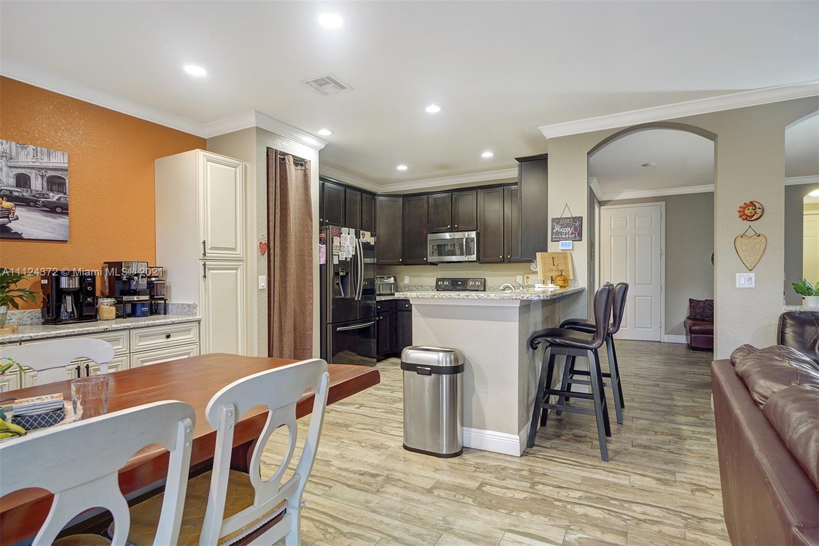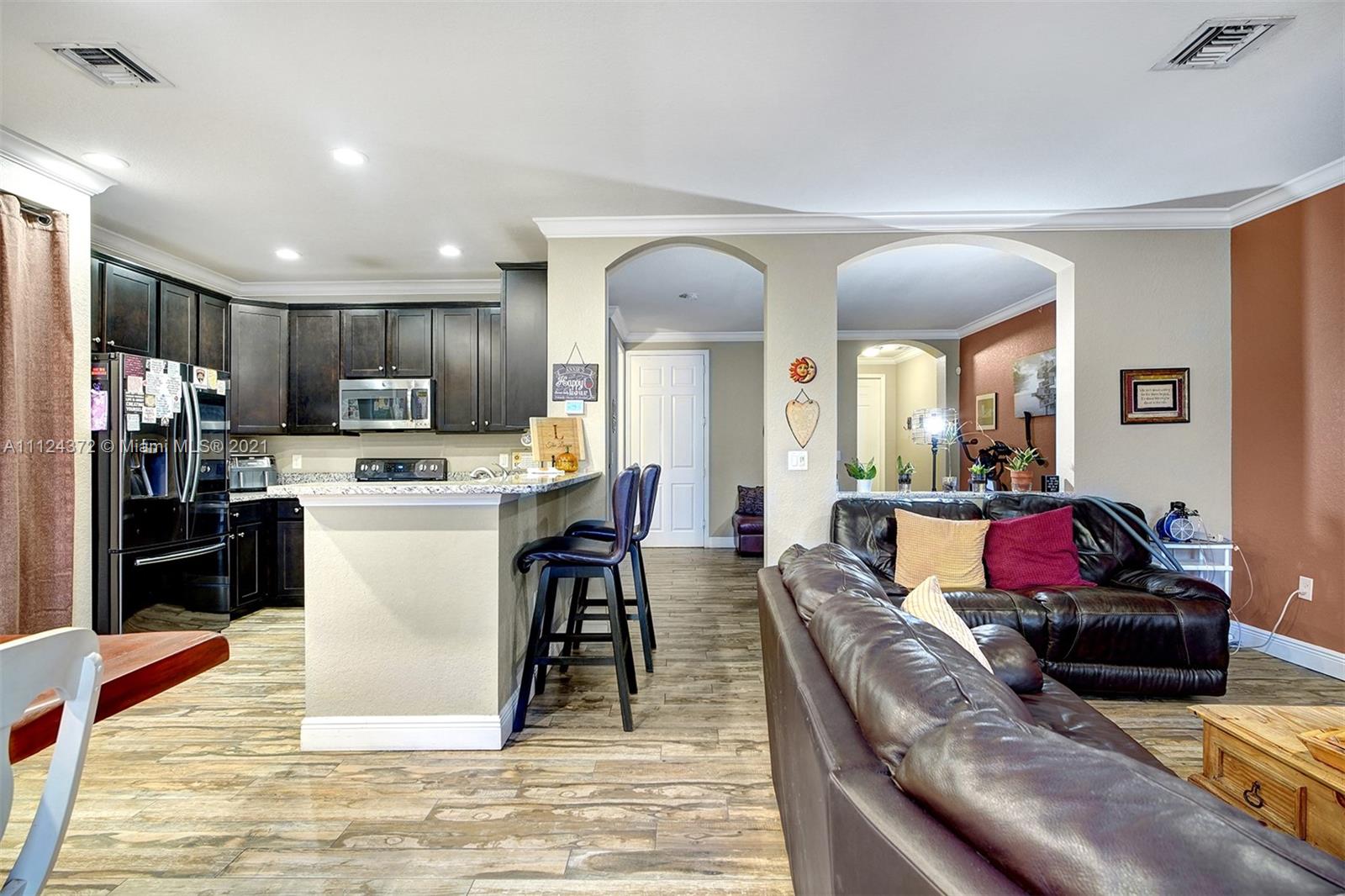 Check out this newer 4/3.5 Townhouse in highly sought out luxurious Vaquero Trails gated community in Davie; energy efficient upgrades galore from all new higher end appliances to LED lights/fans and new AC '21. Community resort like pool is steps away from this home, making it extremely convenient. Beautiful wood-like porcelain tiles and Victorian crown molding throughout both first and second floor give this home a warm feel. Dining Room includes added custom cabinetry with granite counter tops for even extra storage from the upgraded 42" cabinets in the kitchen. Hard wood stairs with recessed LED lighting lead you to the 4 bedrooms, which includes a 2nd suite with walkin closet and full bath in addition to the Master bedroom/office suite.