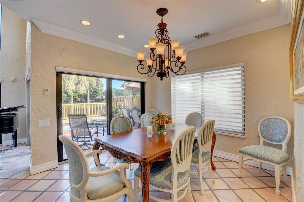This is one of a kind, move in condition single family 2 car garage home with water views through mostly all hurricane rated windows and /or sliders except the bathrooms. The updated eat-in kitchen/family room has GE Profile appliances, Thomasville cabinets topped with granite counters designed to satisfy a gourmet chef. The dining room with crown molding has its own designer chandelier and is the perfect space to present a feast for 8 guests. Entertain your guests in a living room with 2 story soaring ceilings and a ten by twenty foot architectural window and and magnificent chandelier. You ca n access the salt water, heated pool through sliding glass doors. Once outside, enjoy gorgeous water views. There is a blue tooth stereo system throughout. Enjoy your privacy