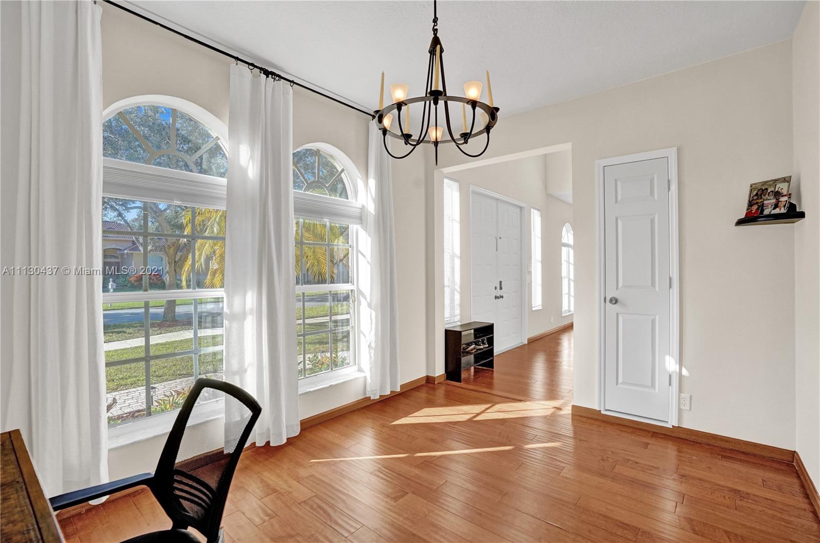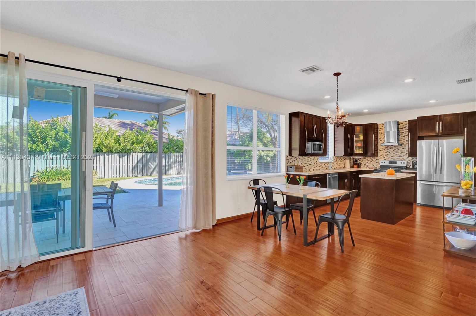 Enjoy outdoor living & beautiful pool views - your own private oasis! This gorgeous gated community 4 bed, 3 bath home features a fully remodeled kitchen, stainless steel appliances, tastefully upgraded baths, wood flooring throughout 1st floor & soaring volume ceilings for a light & bright home! Option for a 5th bedroom downstairs to complement 1st floor full bath. Outdoors, entertaining is easy with an expanded covered travertine patio (2020), huge oversized fenced yard and newly resurfaced pool (2021). Fruit trees include mango & avocado. New impact sliding glass door (2021) & hurricane shutters! Roof resealed (2021). Great location in the heart of Pembroke Pines, close to excellent schools, shopping, dining, parks, highways & transportation!