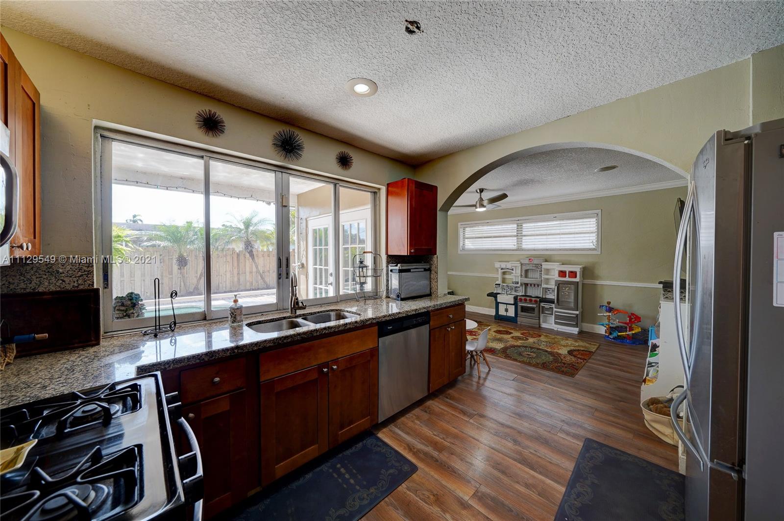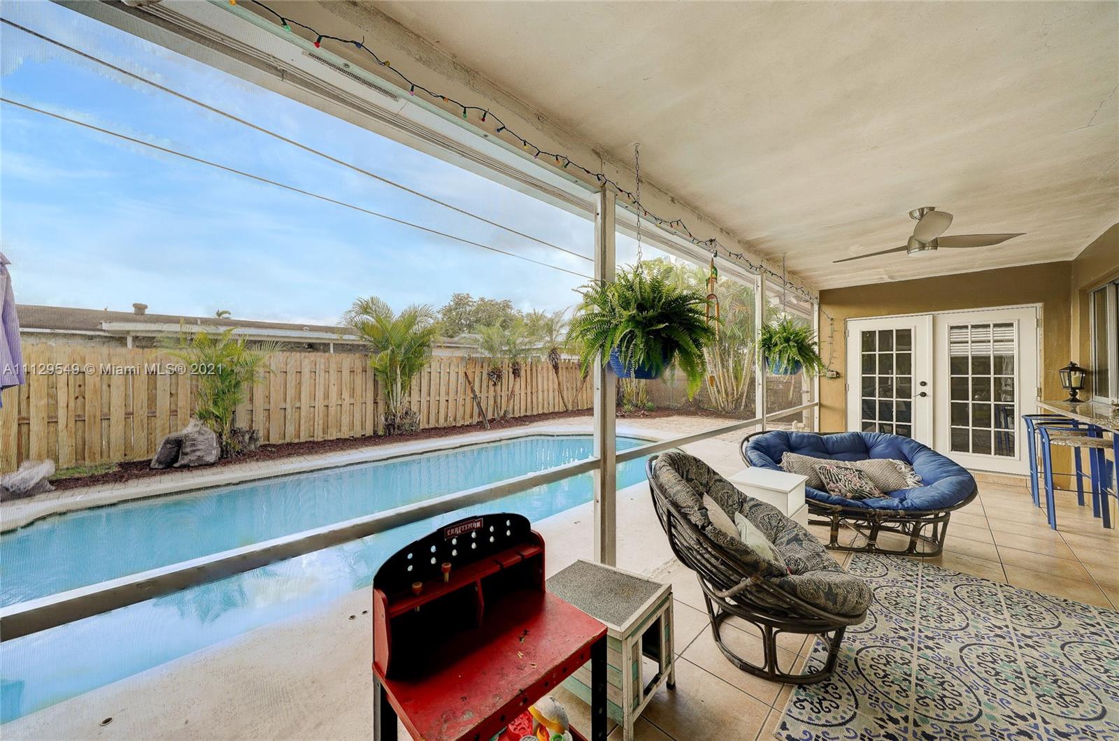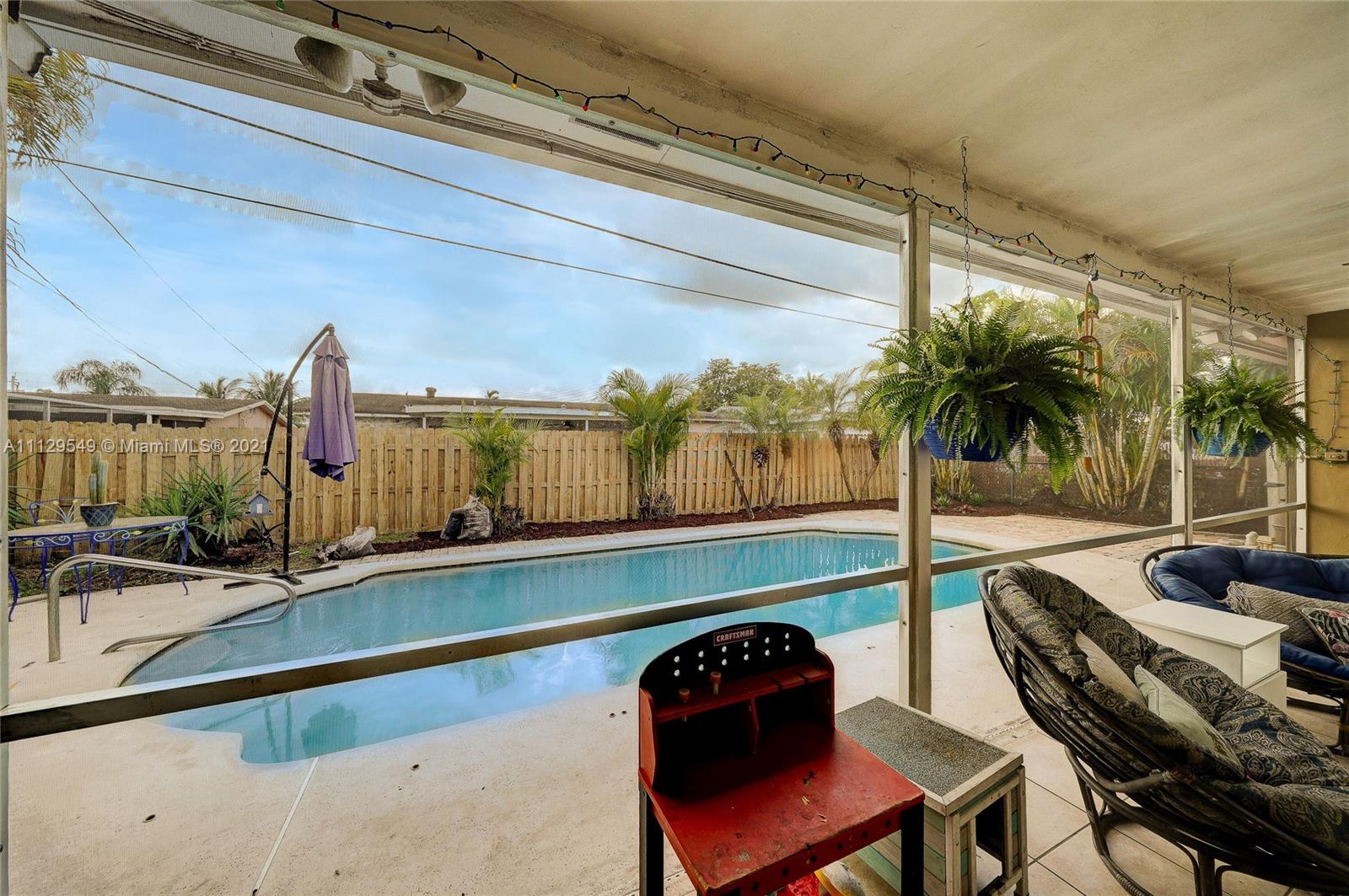 Welcome to this beautiful 3/2 in Sunrise. Front protected with High Impact Doors/Windows, Panel Hurricane Shutters on the rest of the home. Commercial Grade Faux Wood Laminate Floor, Knock Down Ceilings & Recessed Dimmable Lights. Dual Zone Speakers for indoor/outdoor Entertainment. Kitchen updated with Granite Counters and modern appliances, Stove and Outdoor Grill connected to City Gas. Newly screened tiled patio with Bar Top pass with Kitchen, New Built-In Grill and Mini-Fridge. Backyard beautifully landscaped, concrete and paved brick surrounding the pool, equipped with a Energy Efficient Variable Speed Pump. A/C Unit, roof, gutters, water heater, washer/dryer are all in excellent condition. Safe and Quiet area, just minutes from Restaurants, Major Shopping Malls and Highways. No HOA.