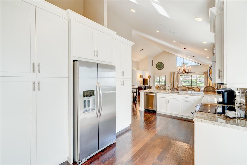 Beautifully remodeled 3 bedrooms, 2.5 bathrooms, single family home with a GORGEOUS lake view! Open concept Kitchen and living area which enables you to enjoy the great lake view. Kitchen features newer cabinets, ss appliances and granite countertops. Large main bedroom with custom made drapes, vestibule leading into walk in closets, ensuite bathroom with his + her sinks, walk in shower, lighting mirror and cabinetry throughout. Private guest suite with dressing area, plantation shutters, and a newly designed bathroom. The 3rd bedroom/office is a beautifully designed quiet work/rest space.