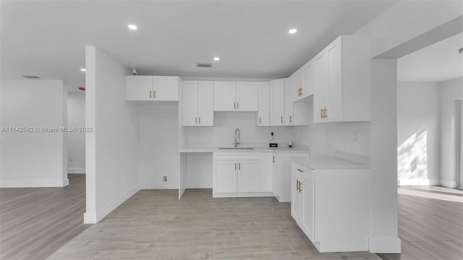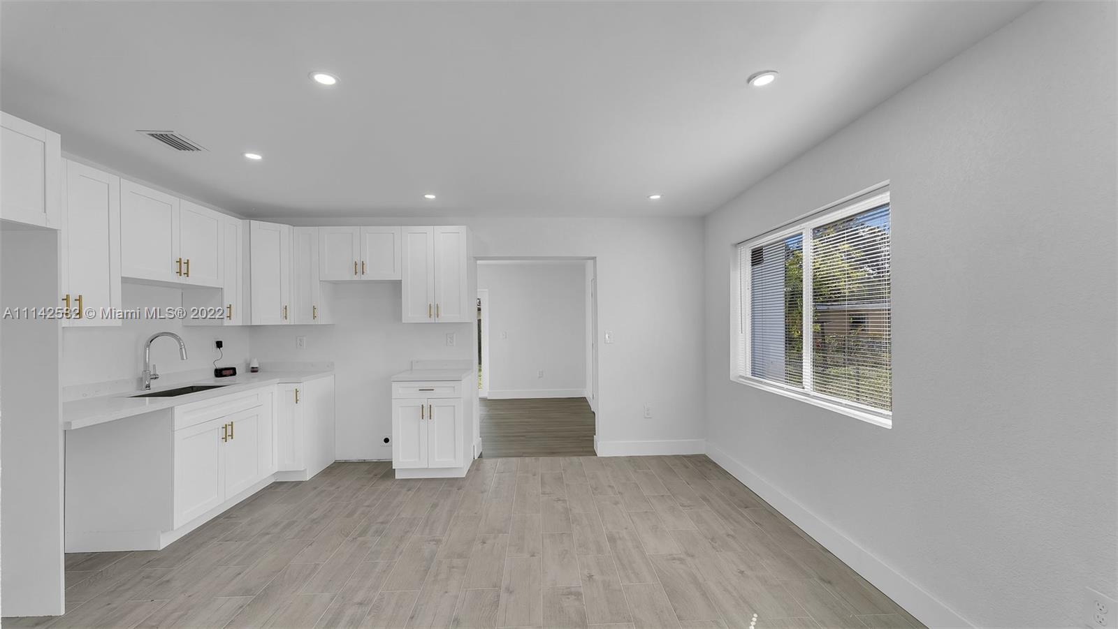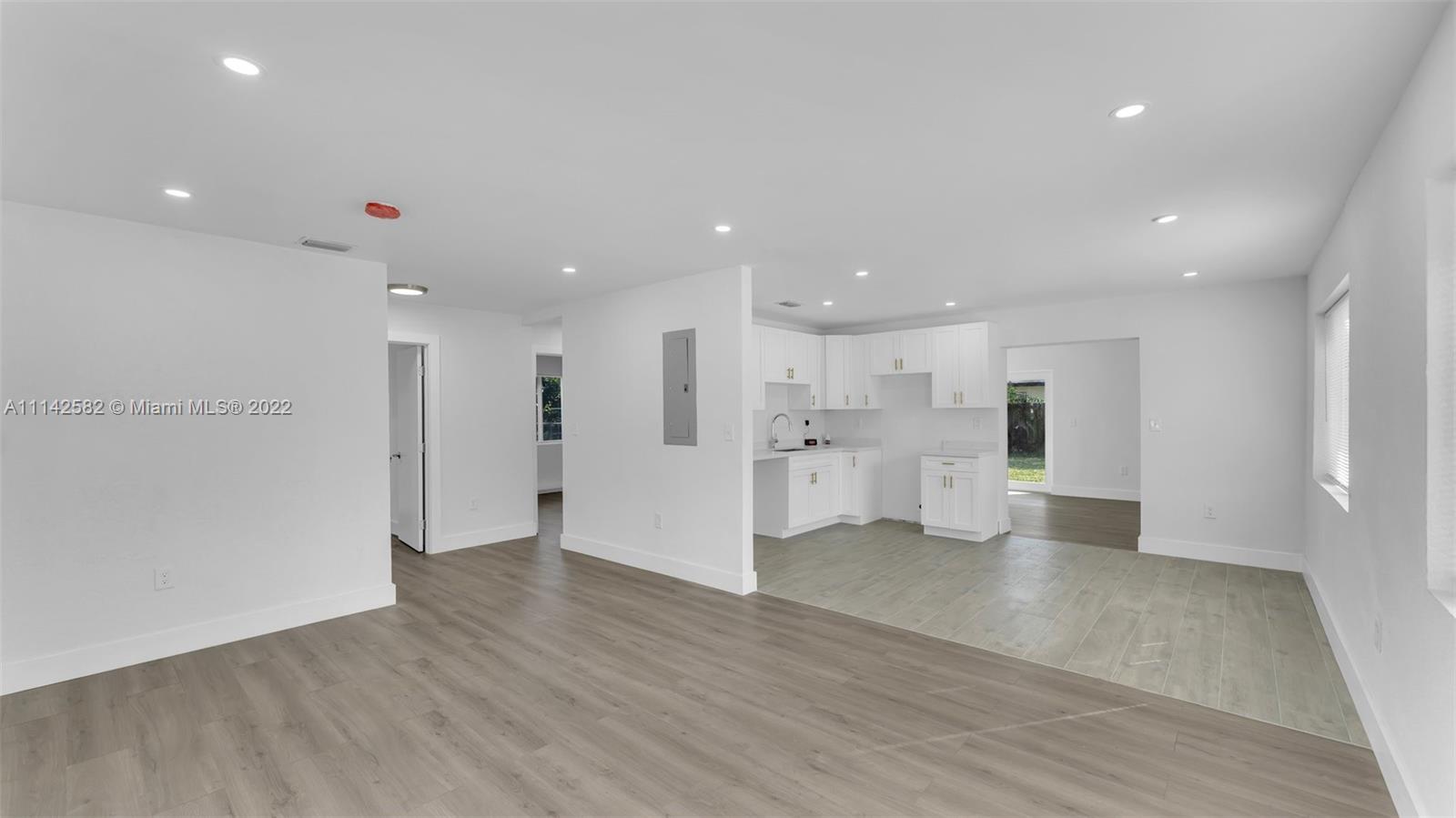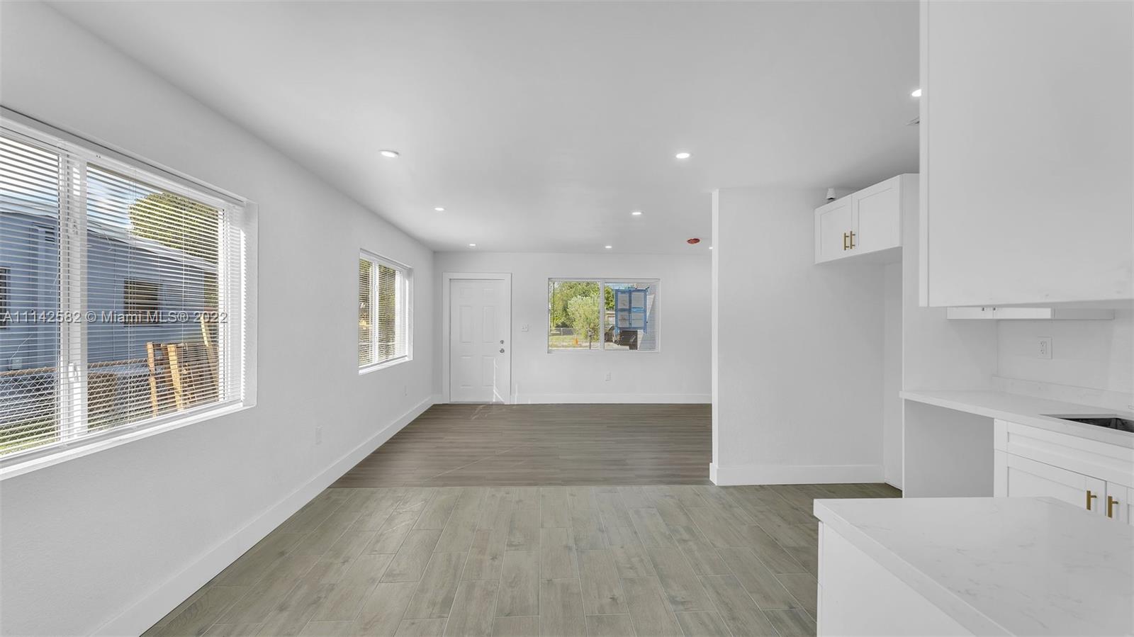 New roof, new impact windows and doors, new kitchen cabinets and countertops, new ceramic floors in the kitchen area and laminate floors in rest of living area, new baseboards, interior doors, interior and exterior paint, knockdown walls, smoke alarms and recess lights, living room, dining area, and family room, enclosed laundry area, new grass all over the property, this property is completely move in ready.
