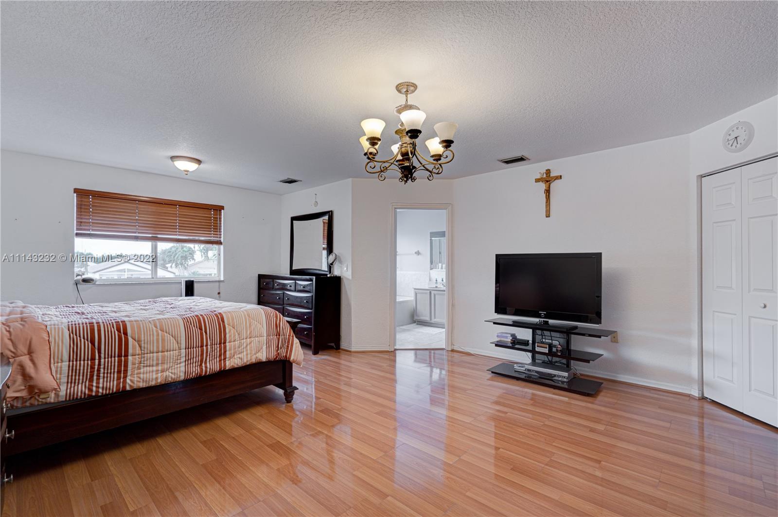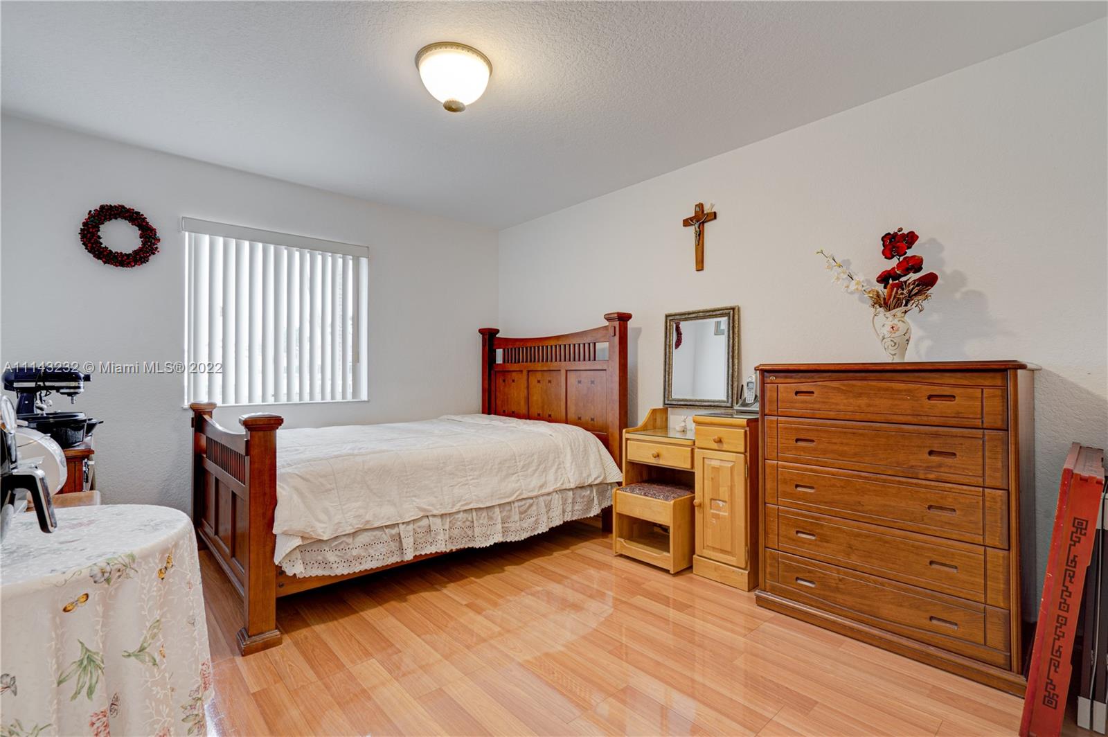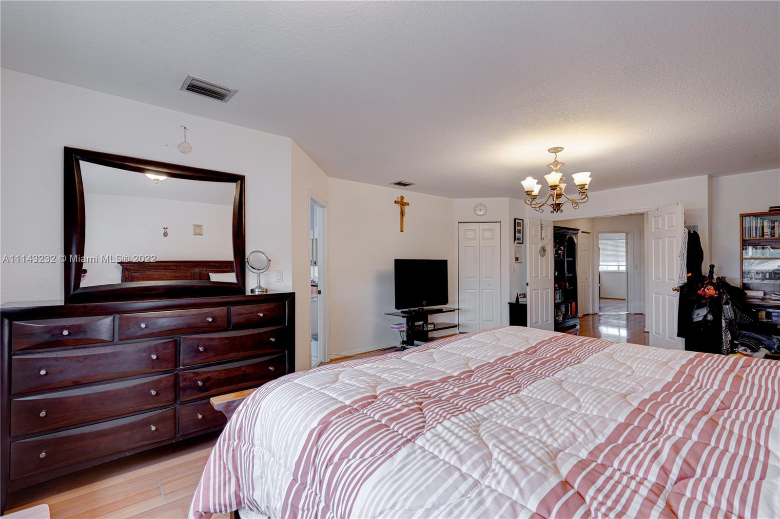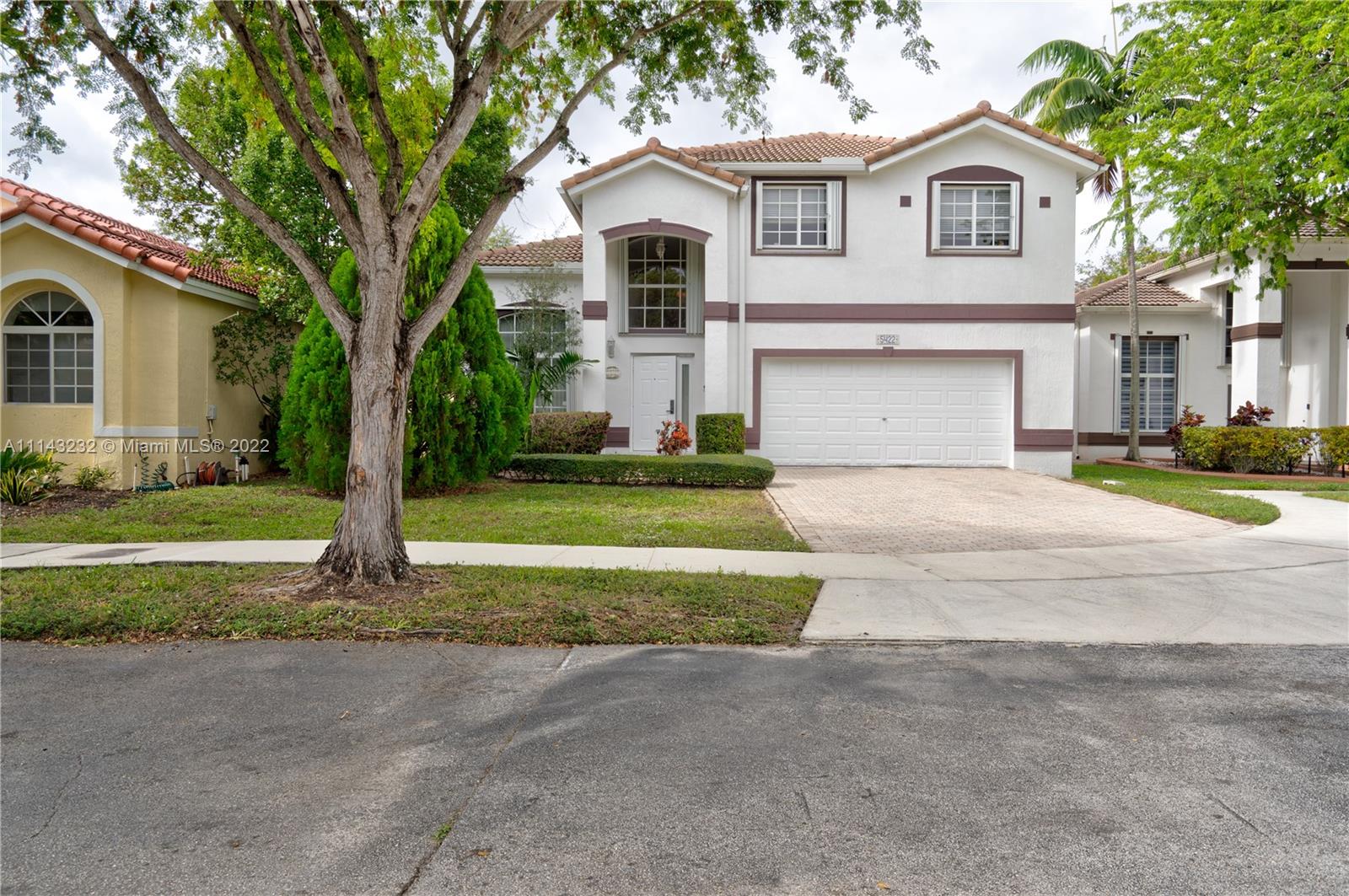 Inmaculate house ready for a family, located in a gated community "Doral Gardens", open concept layout, large kitchen area, enclosed patio with a lake-view, very well kept laminated wood floors, extra large master bedroom, one bedroom downstair, 2 car garage.