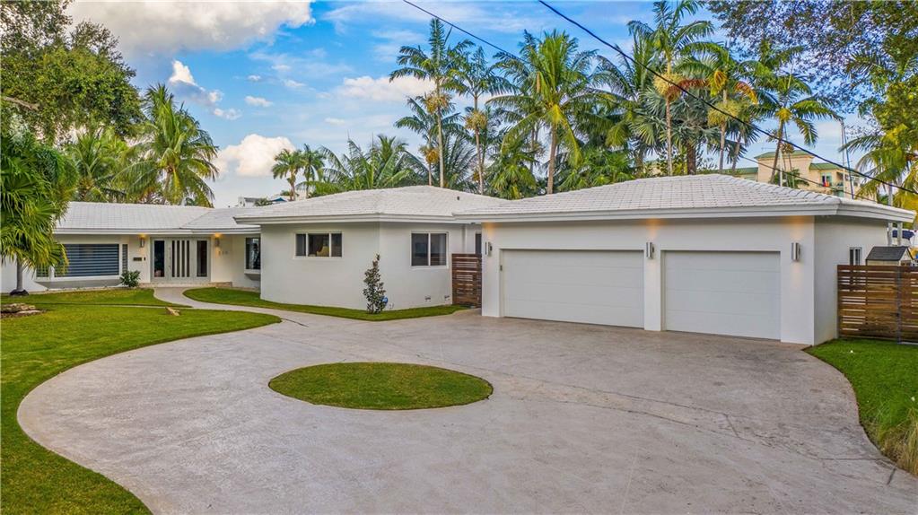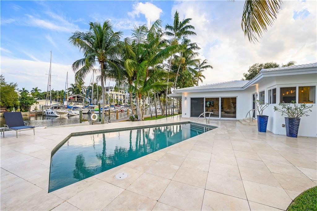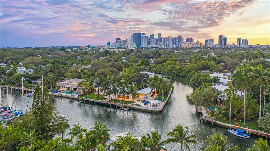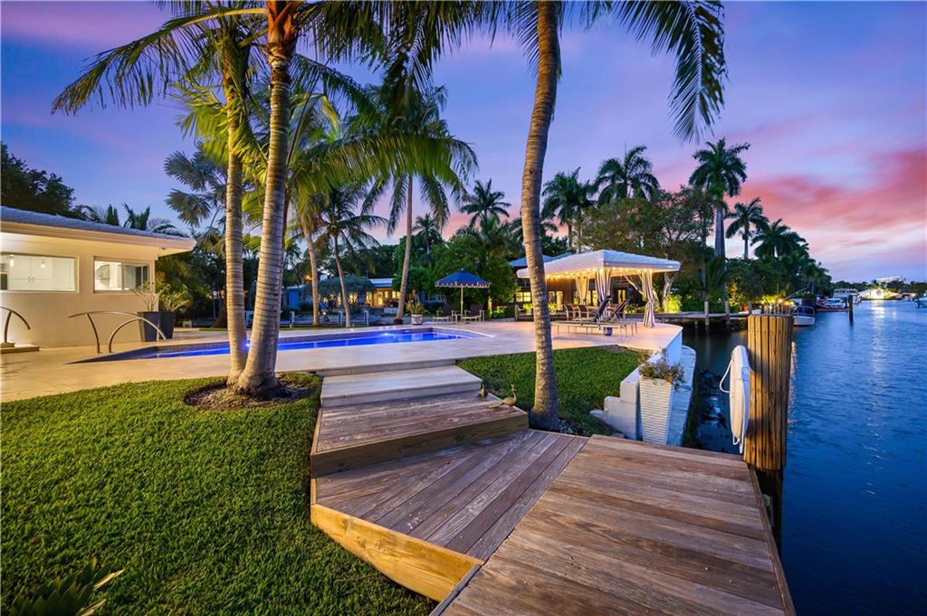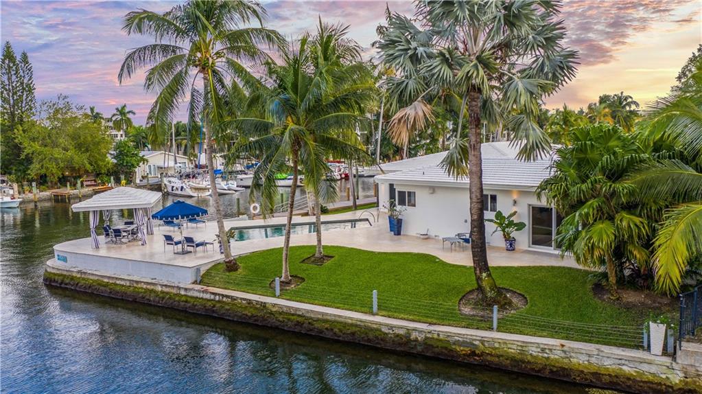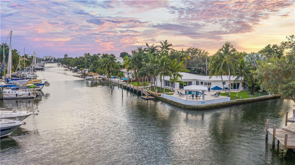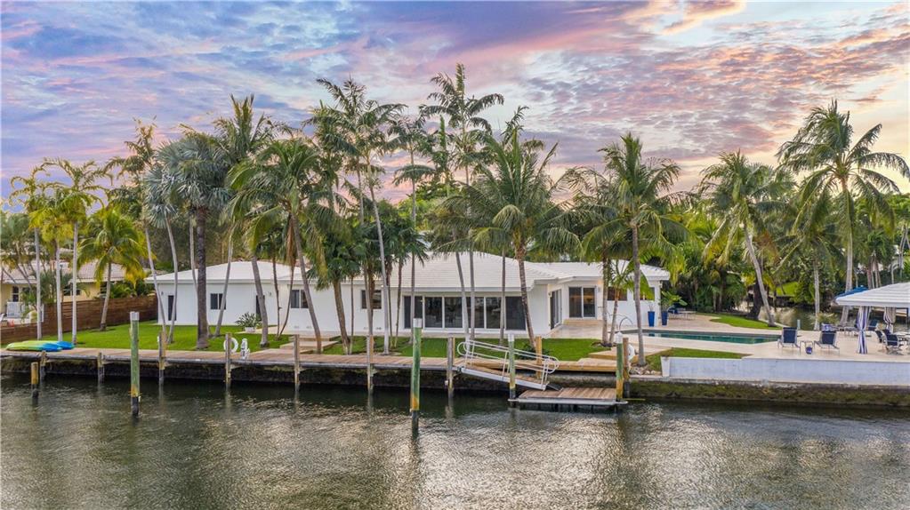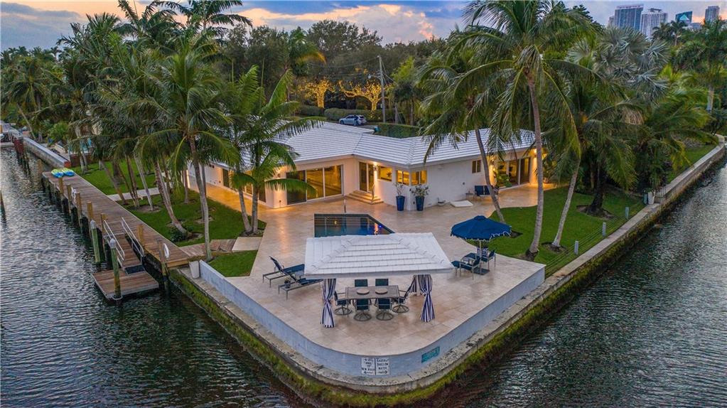 Park-like North Gordon's premier point property encompasses over 16,000 square feet & no-fixed-bridge water front of over 240 feet with 162 feet along the wide, deep Karen Canal. A recent multi-level ipe dock also has a float platform. Sleek Mid-Century architecture is updated for the 21st Century including re-built roof, newer electrical and plumbing systems and all impact-rated windows and doors. The sunken living room has volume ceilings. Walls of sliding glass merge outdoor and indoor living featuring water views from all public areas. Travertine patios surround the re-done, heated pool and water facing gazebo. In front, a crescent drive leads to an oversized three car garage with additional storage and laundry room with a dog wash. Very walkable to parks and Las Olas dining.