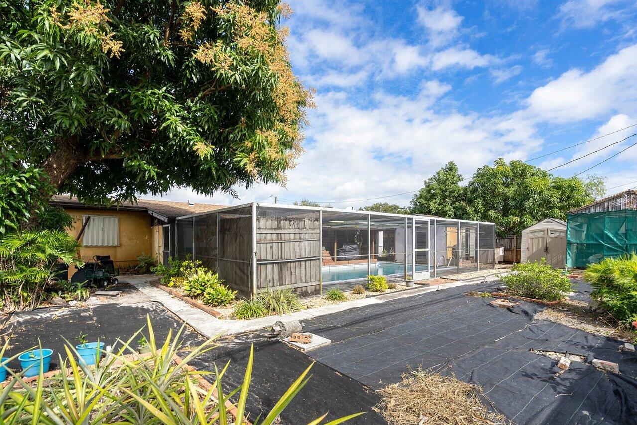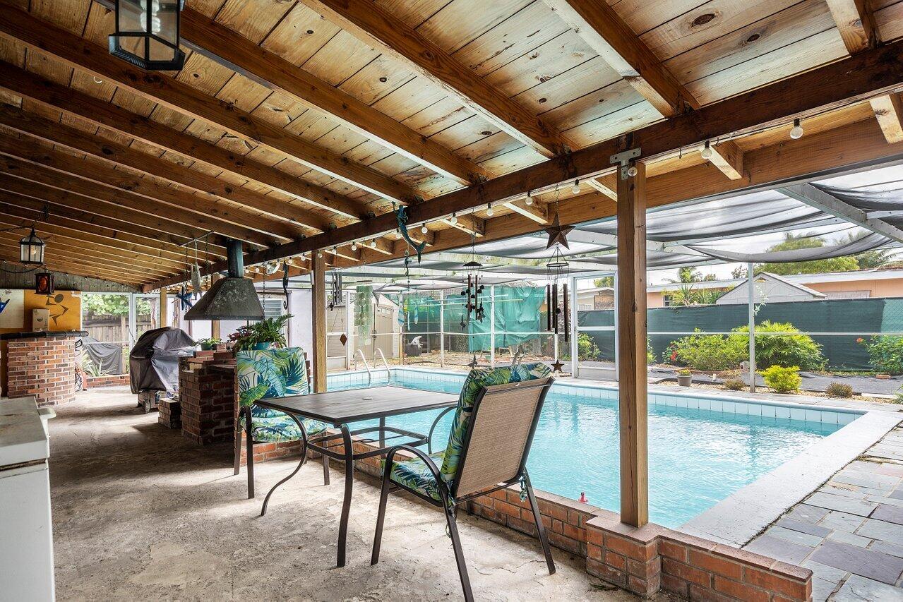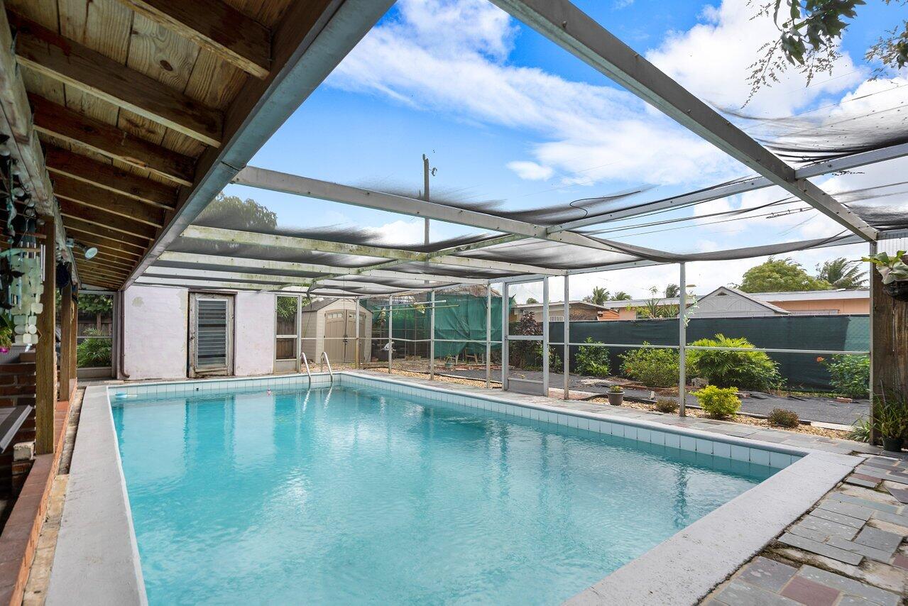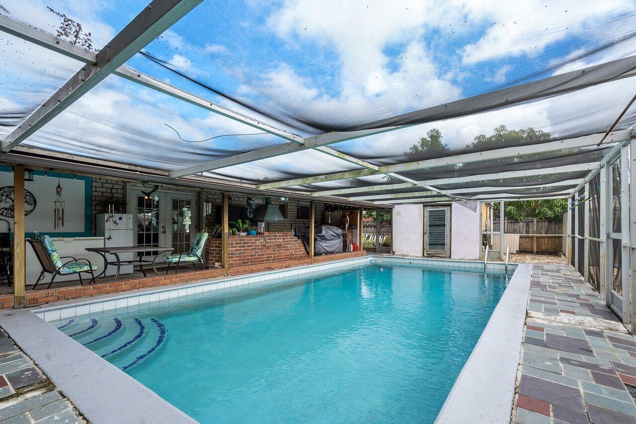 Rare three bedroom two bathroom home w/pool! Large Lot. This quiet residential street offers you the convenience of all shopping, restaurants, and major highways while still not feeling the hustle and bustle of town. Pool resurfaced 2018, Water heater 2020, Roof 2017, window shutters 2021. Shed in the backyard and endless potential
