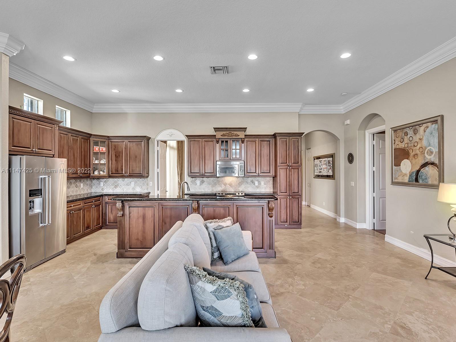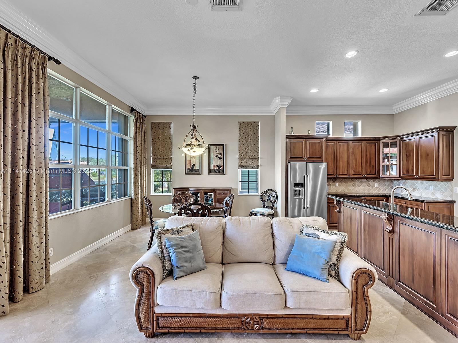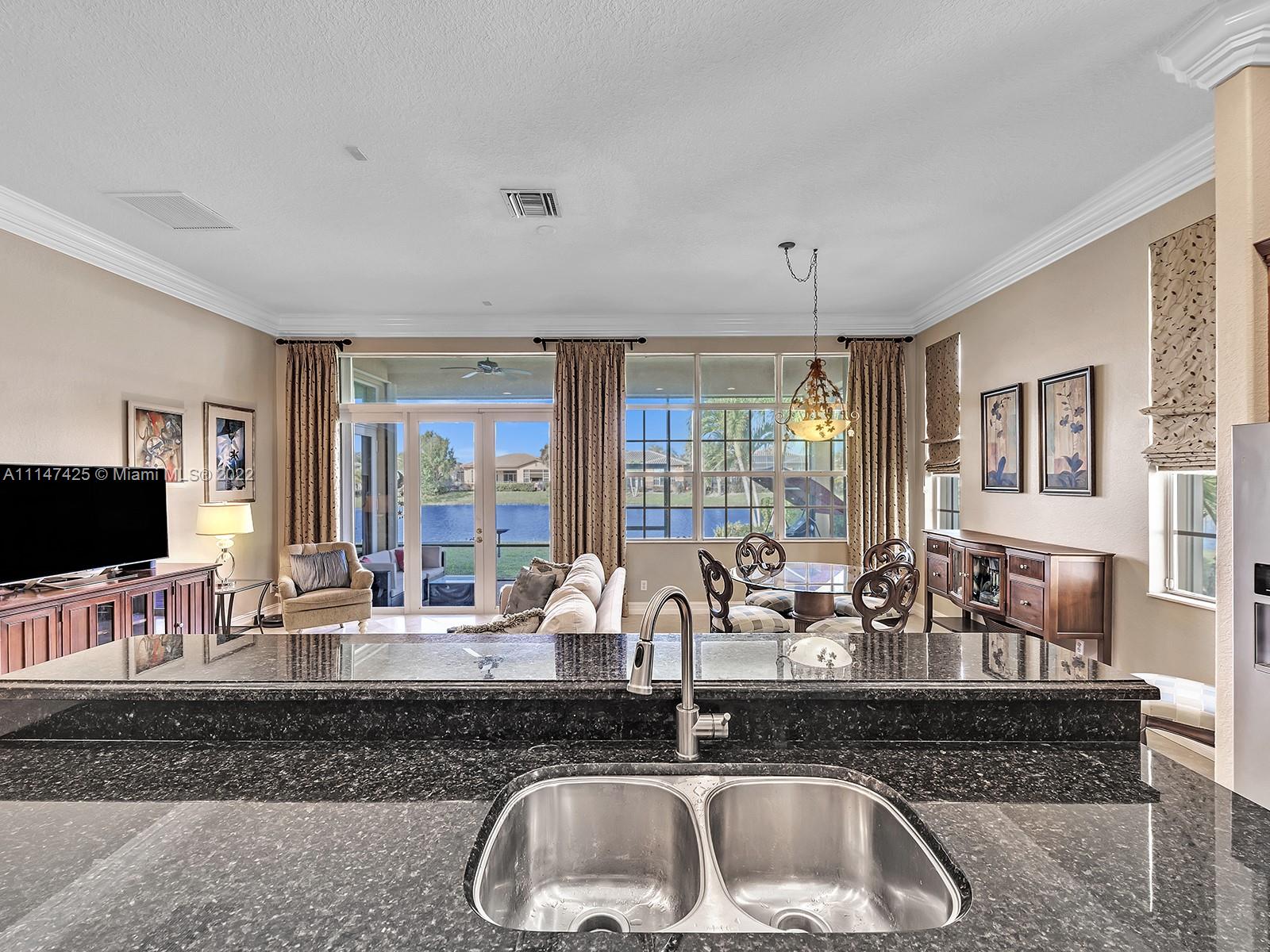 Stunning 3 bedroom 2.5 bathroom (plus large bonus room) one story home set on beautiful waterfront lot. Enjoy serene wide lake views while relaxing on the covered, screened and paver patio. The interior features chef's kitchen with wood cabinets, granite counter tops, stainless steel appliances overlooks the spacious great room with family and dining areas. Additional details include marble and wood flooring, triple crown molding, split bedroom plan and master bedroom with sitting area. Accordion shutters. AC 1 yr new. Guard gated community with 2 resort style clubhouses, 14 tennis courts, playground, basketball, 3 gyms plus many more amenities. Live the Florida Dream!