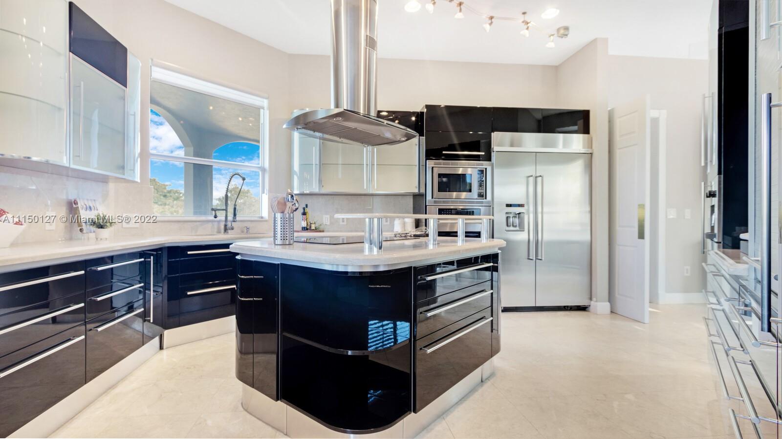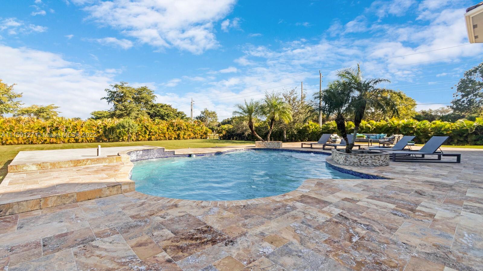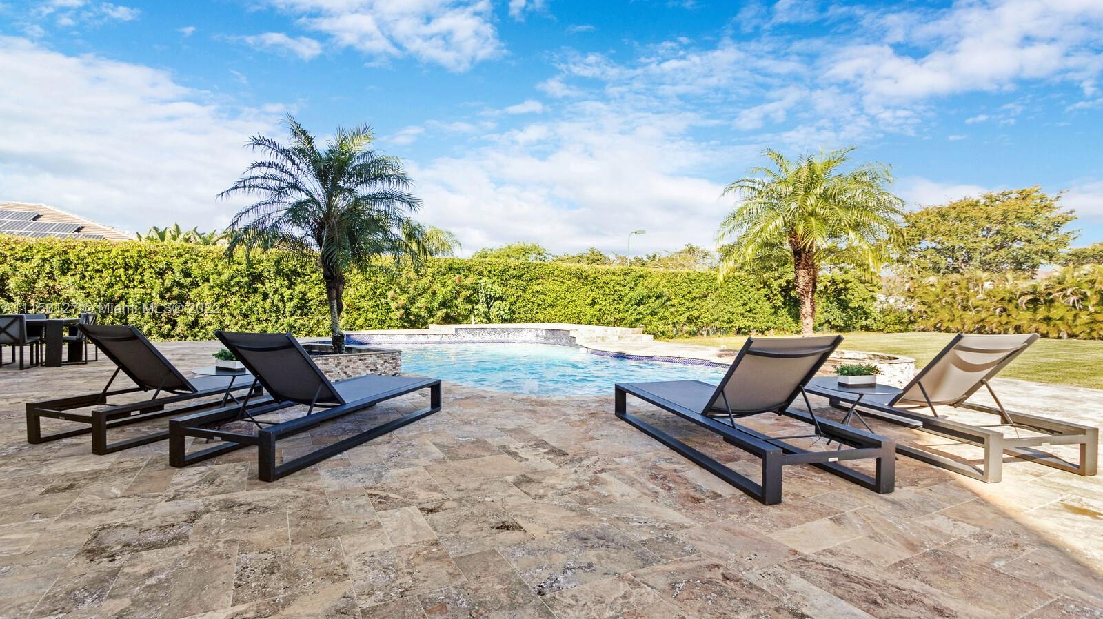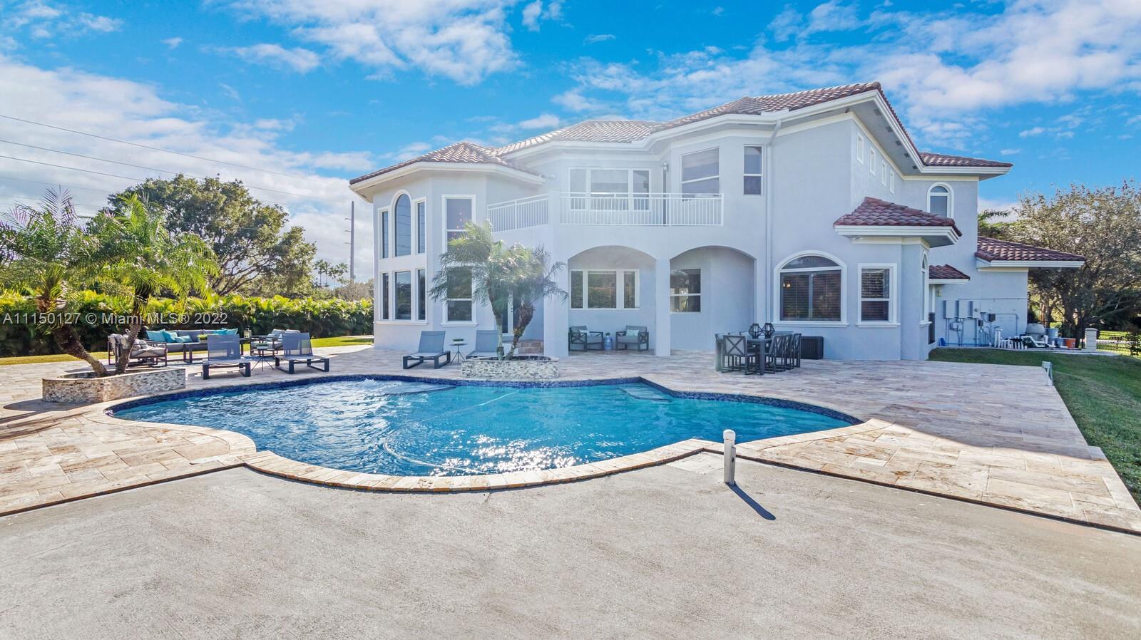 Custom built home including 5 bedrooms, 4.5 baths and a loft area with designer finishes. The entrance to this beautiful home includes a grand porte-cochere, a circular driveway, 3 car garage, and impact windows throughout. The walkway up to the grand double steel door entrance is lush with landscaping. Upon entering you will notice the luxuriously high vaulted ceilings bringing a beautiful flow of serenity. The marble foyer offers a direct view of the expansive backyard and resort style pool. The master suite features an oversized sitting area, walk in closets with built in cabinets, which is located on the first floor. Thermador appliances including a coffee station, walk in pantry, center island with cook-top and hub, double oven, and a bar area. New 2 zone A/C units installed 2020.