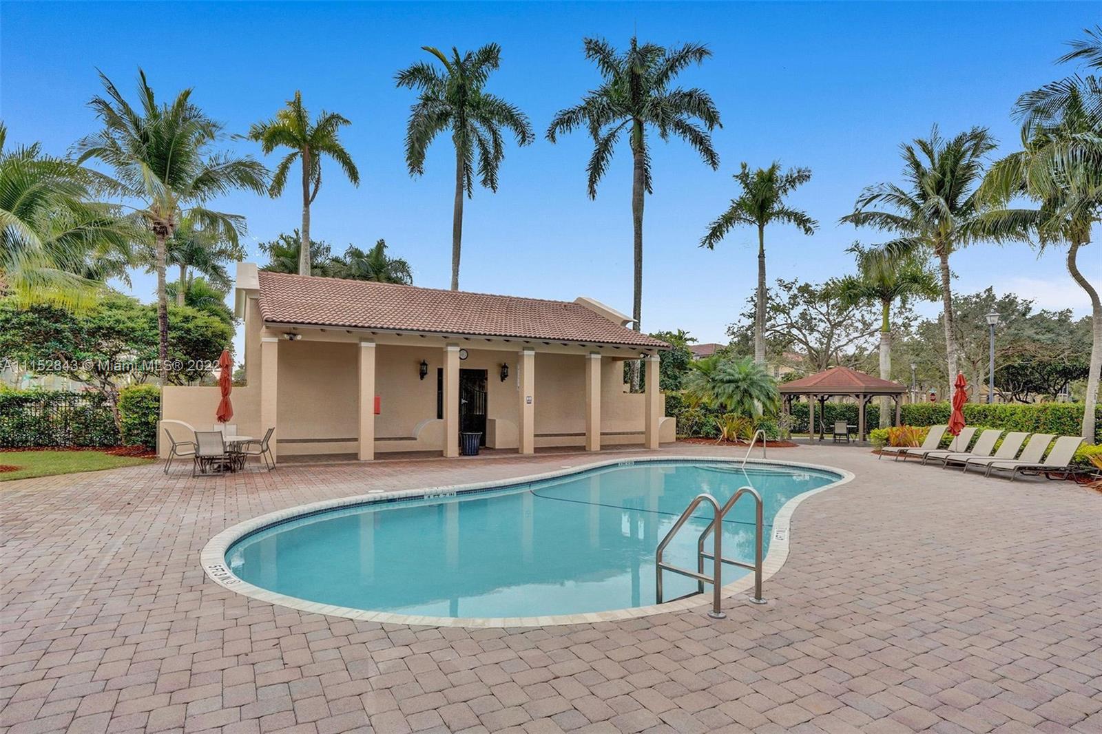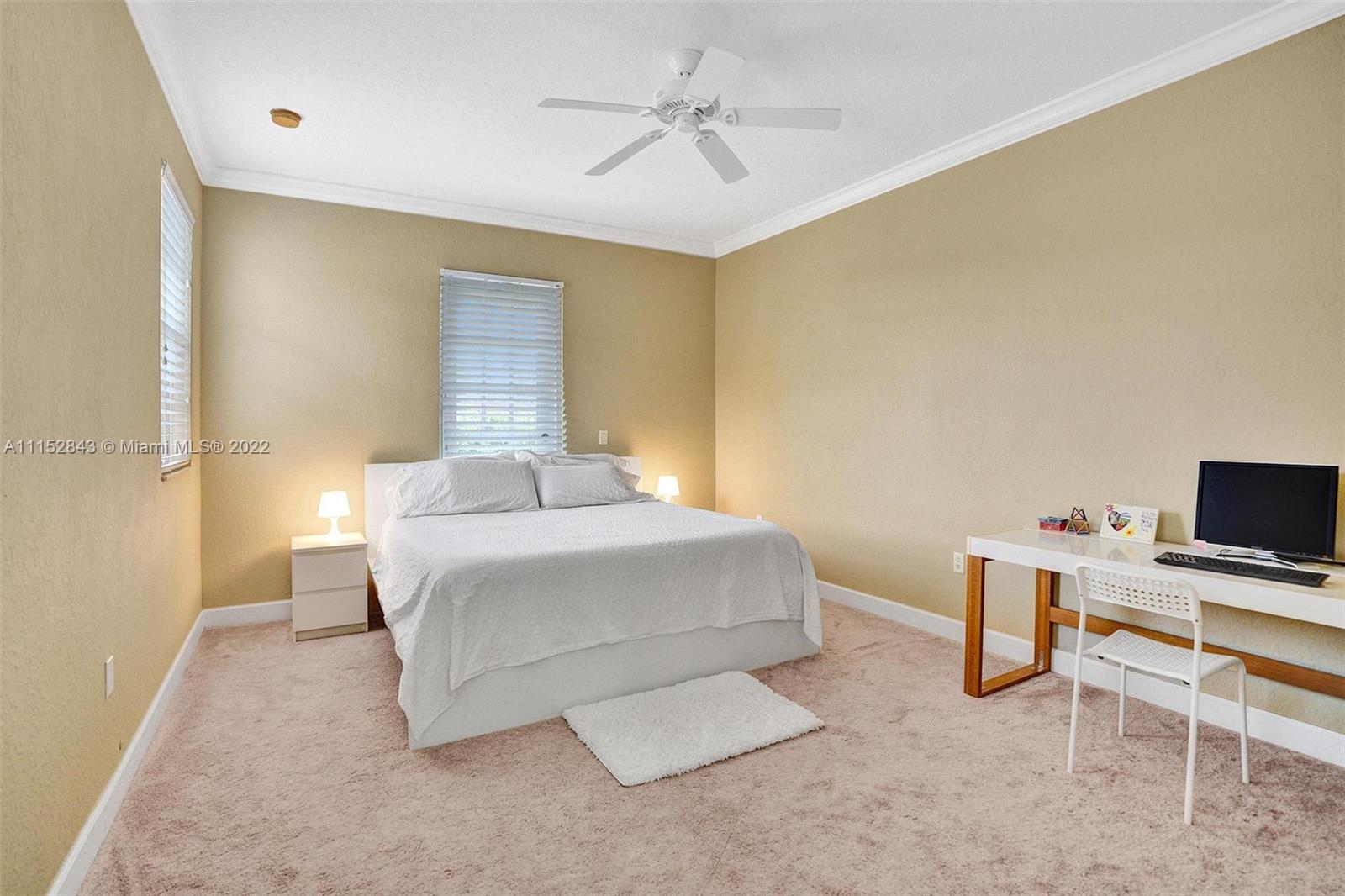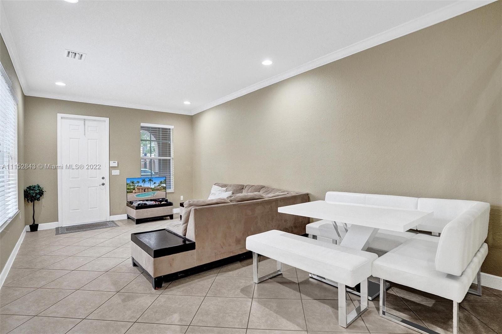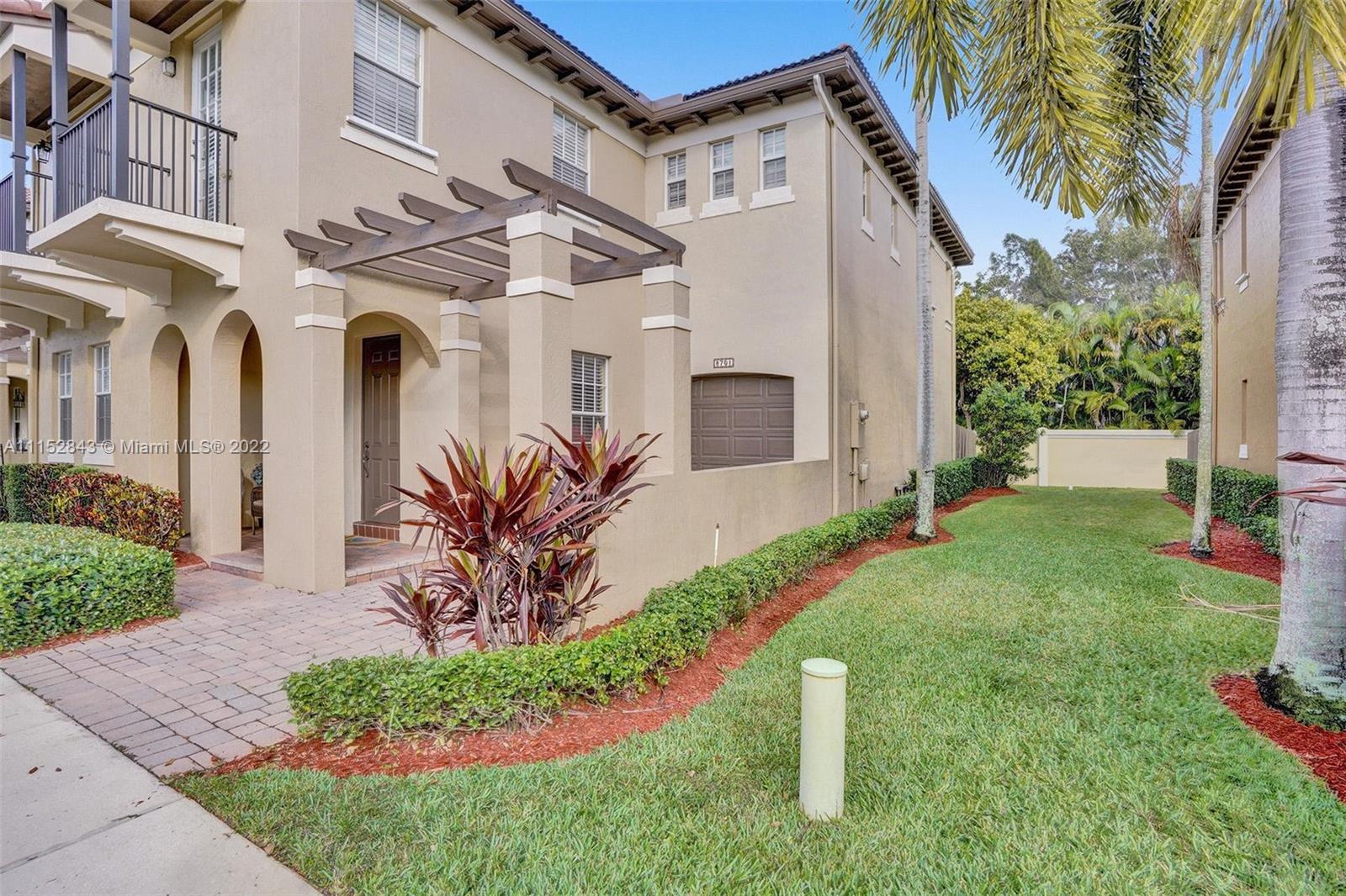Clean 3 bedroom 2.5 bathroom corner home with crown molding in this quiet boutique community. Granite countertops, 2 large walk-in master closets, master bath has separate shower, double sinks, and a large soaking tub. It also has a 1 car garage, driveway space for 1 and additional guest parking. The HOA fee includes front exterior landscaping, pool service, common area maintenance, basic cable and alarm system. Cimarron amenities include the community pool and playground and is also zoned for A-rated Schools in Davie. Community repainted in 2021.