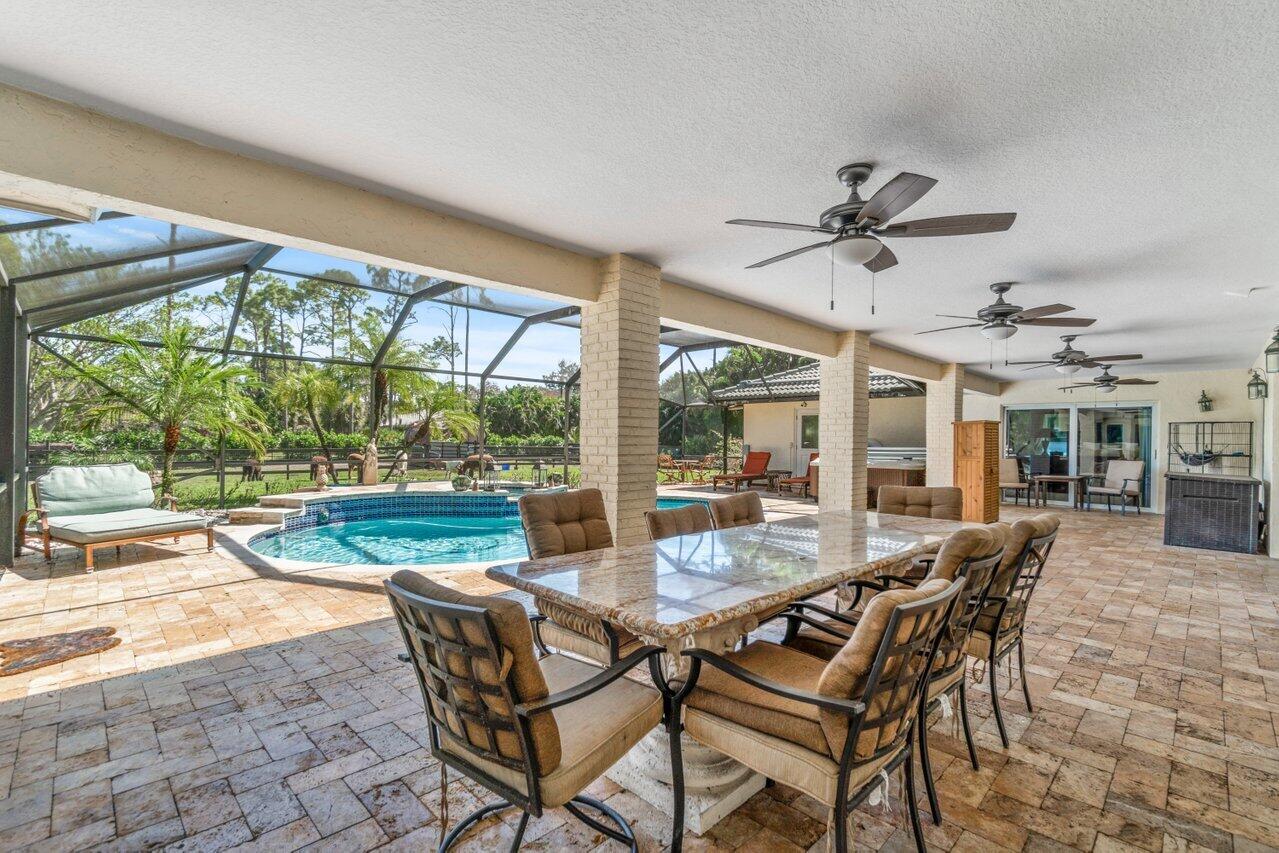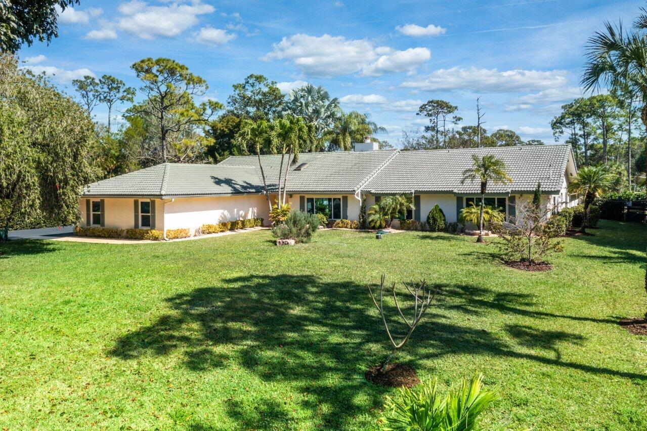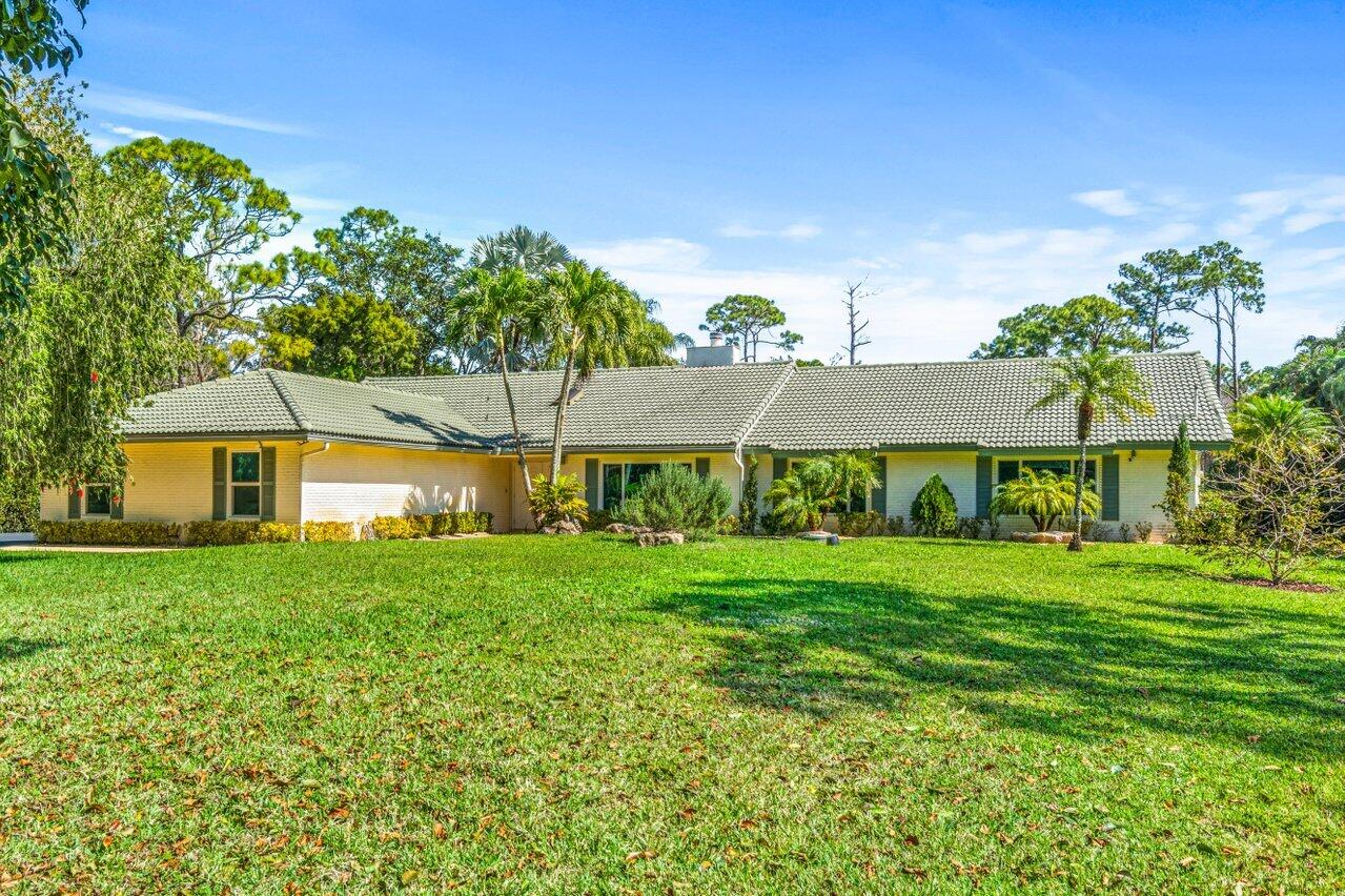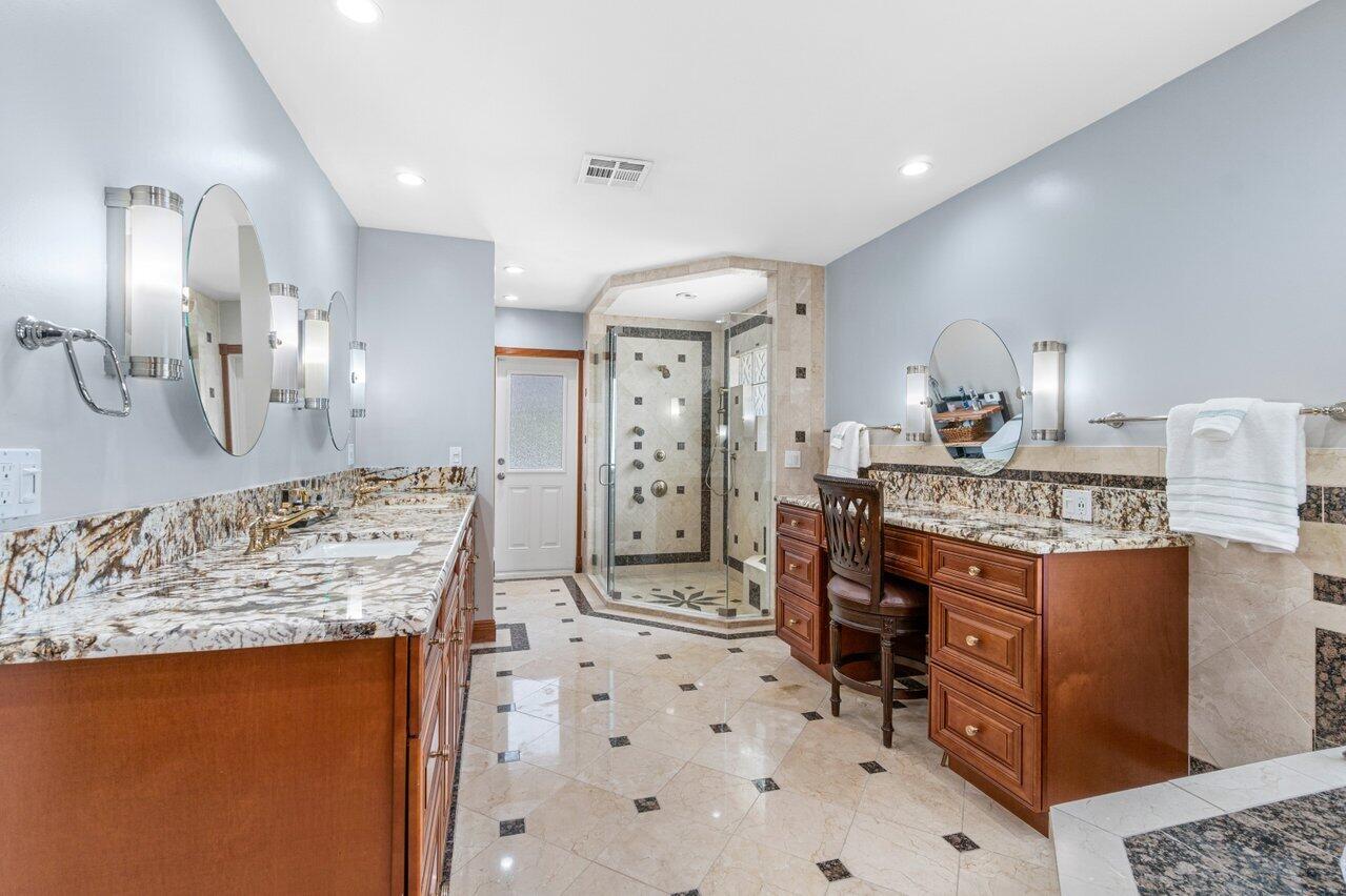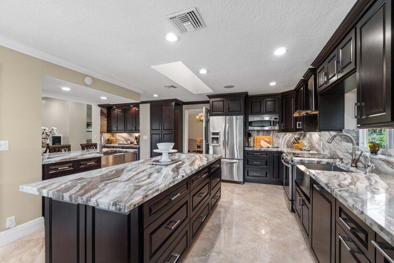Plenty of room to roam in this true 5 bedroom, 3.5 bath sprawling ranch with an open concept floor plan situated on 1+ acre in highly desirable Pine Tree Estates*Newer remodeled gourmet kitchen with custom solid wood cabinets boasts quartzite counters and backsplashes, SS appliances, 2 large farmhouse SS sinks, bountiful storage*Living areas have vaulted ceilings, skylights, marble and new wood floors in LR and BR's*Large family room and living room have dual sided wood burning fireplace*Spacious Primary BR suite has huge custom closet built ins*Primary bath with double sinks, separate makeup station, whirlpool tub, shower with jets*4 additional BR's all generously sized w/ built in closets. 1 BR has en-suite bath with shower, perfect for inlaws or guests*