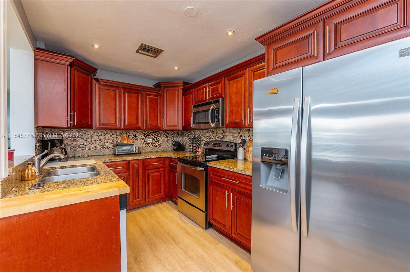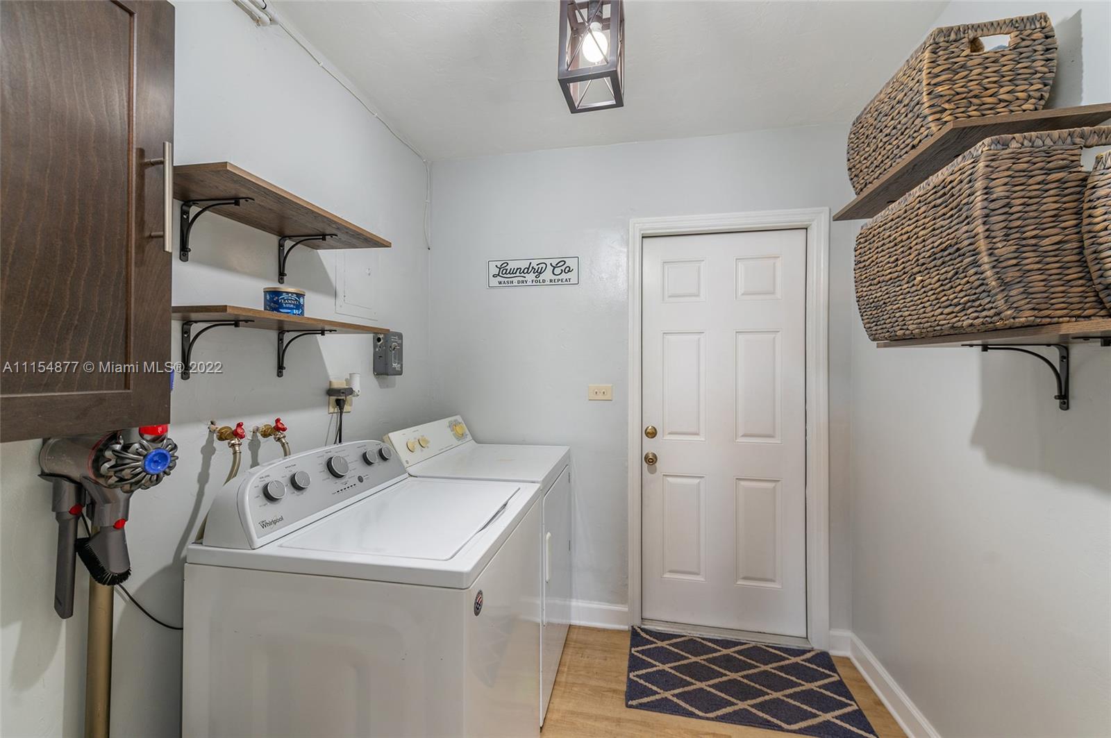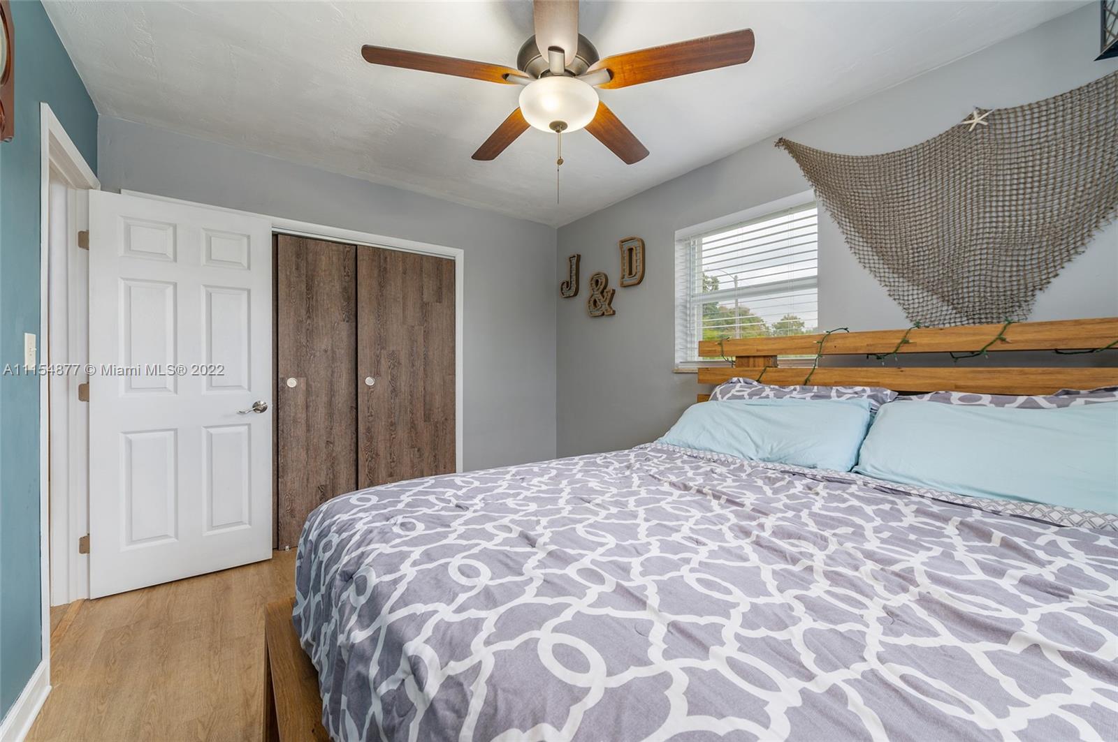 Beautiful 3/1 converted to a 2/1 to create a larger living room space/family area. New closet doors in bedrooms. Roof is 1 year old, accordion shutters throughout home and AC is 2 years old. Kitchen includes granite countertops with mosaic tile backsplash and stainless-steel appliances. Bathroom just remodeled this year, with brand new tile shower. Home was freshly painted 3 years ago, laminate flooring throughout. Large fenced in backyard with enough room to park vehicle or boat on either side. Stone walkway leading to large deck perfect for outdoor seating and BBQ. Full size washer/dryer in laundry room. This home also features security camera surveillance system for the next buyer.