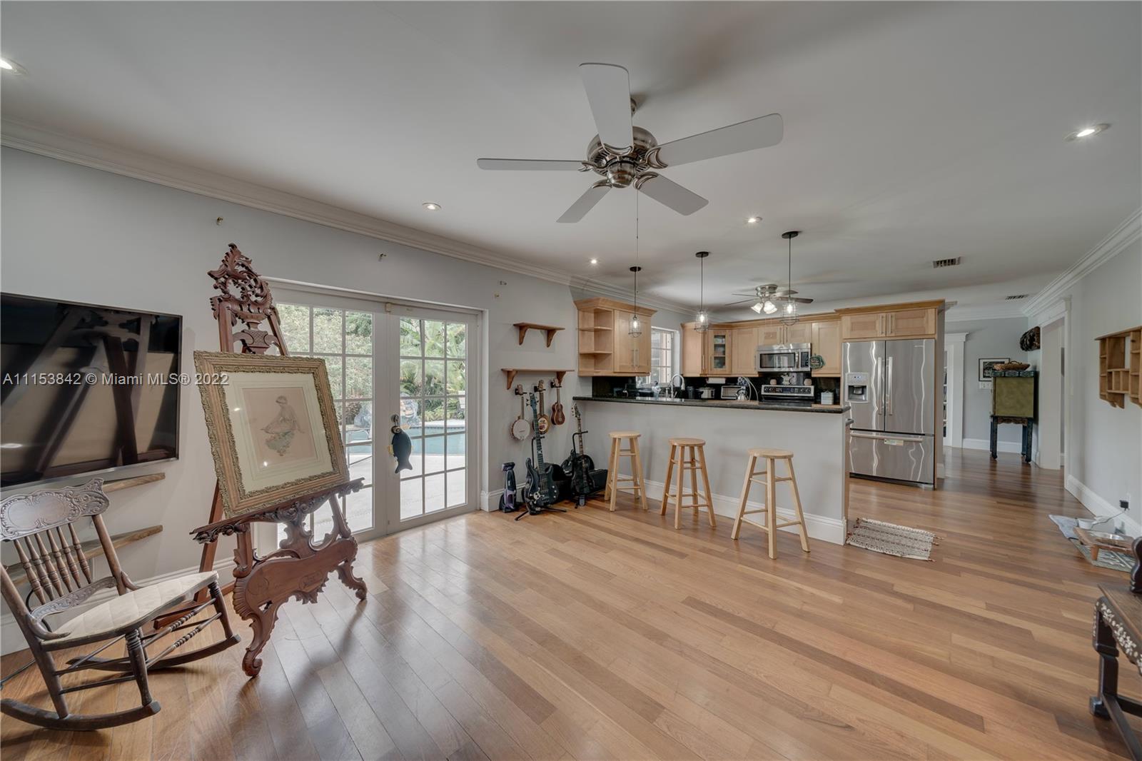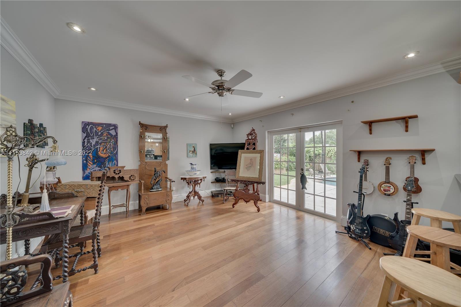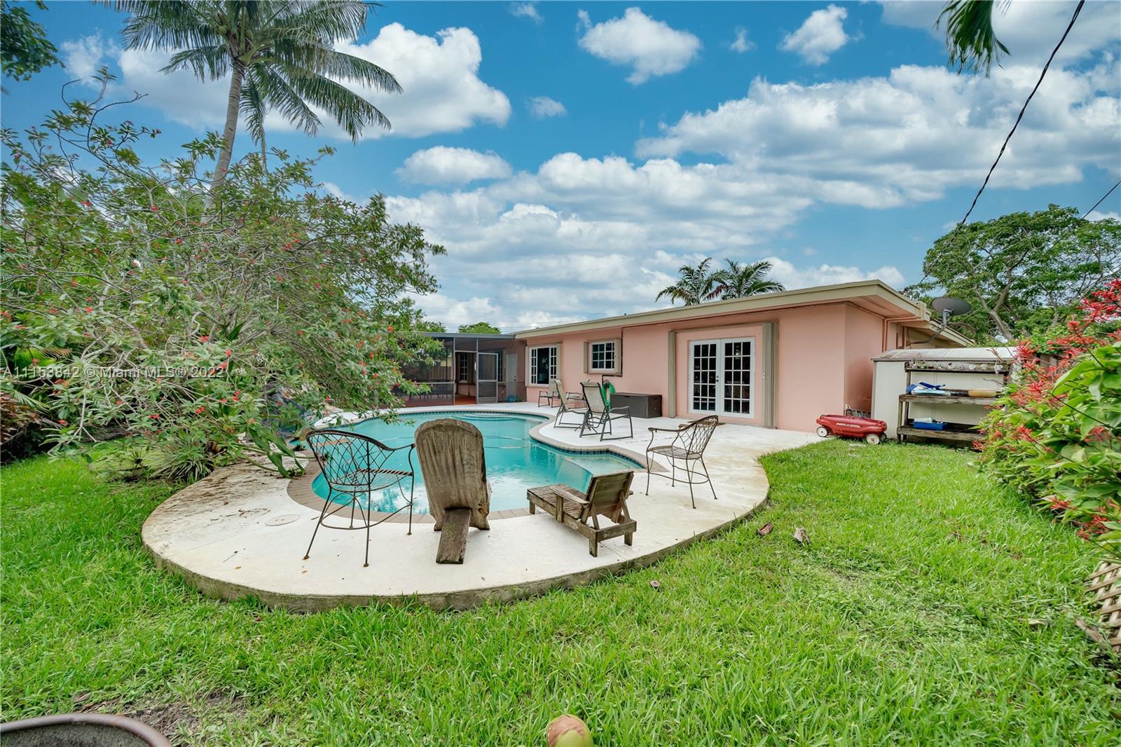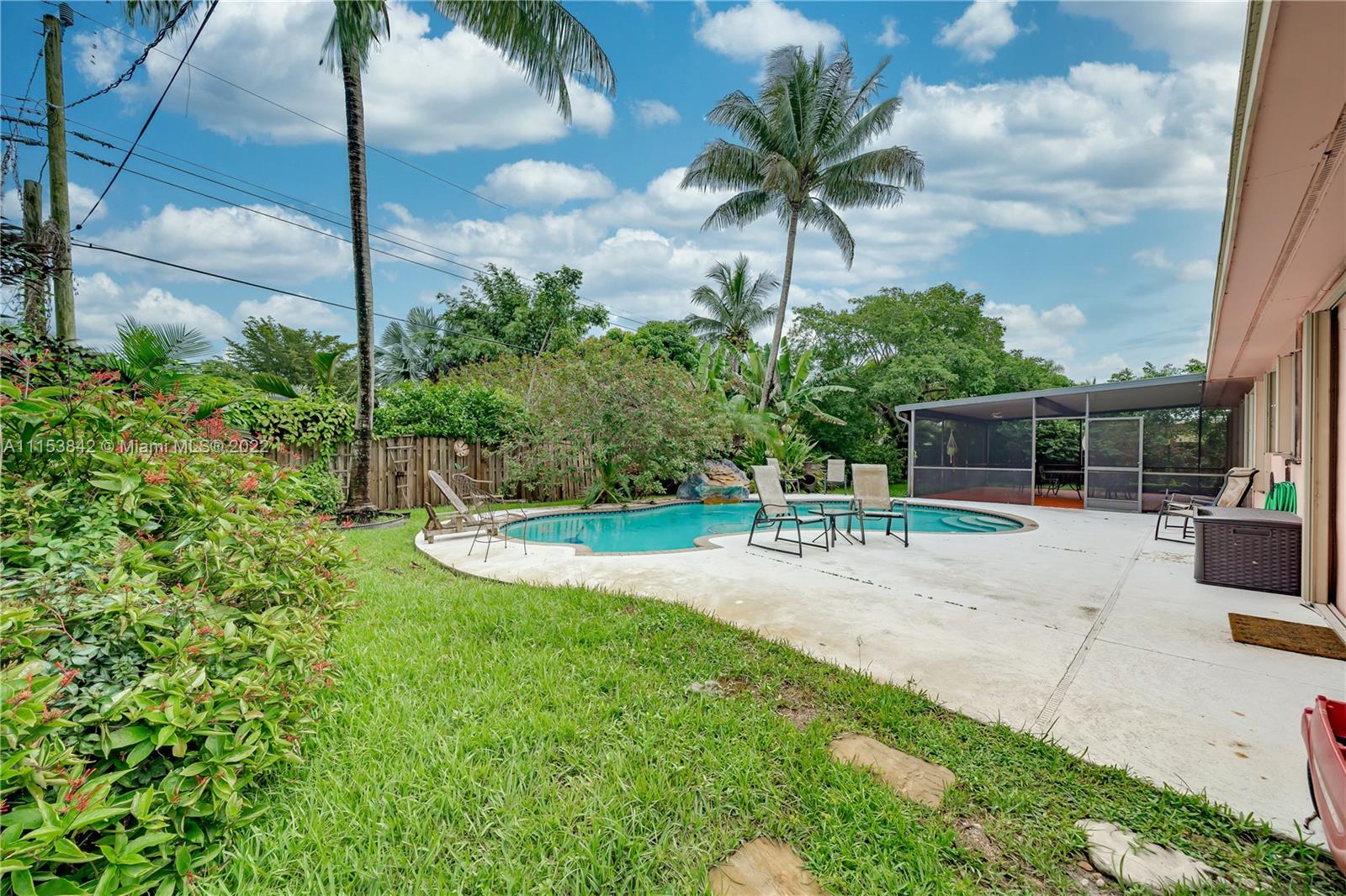 Beautiful 3 bed 2.5 bath pool home in Plantation Park!! BRAND NEW Flat roof just permitted/installed in 2022!! Stunning Brazilian Brown/Cherry Hardwood flooring. Ornate crown molding, casing & deep baseboards throughout the home. Plantation shutters across front of the home. Renovated kitchen features wood cabinetry, granite counters & stainless steel appliances. Oversized bonus room w/ travertine marble floors. Large fenced in lot w/ coconut palms, banana, jacaranda flower, moringa & papaya trees. Pool has a waterfall. Screened in patio area. Walking distance to elementary school & parks. Centrally located, minutes to 595, Ft Lauderdale Int Airport, Las Olas, Beaches, & more. Updated windows/french doors. Accordion shutters, tankless water heater. 2013 AC. Murray Elect Panel. No HOA!