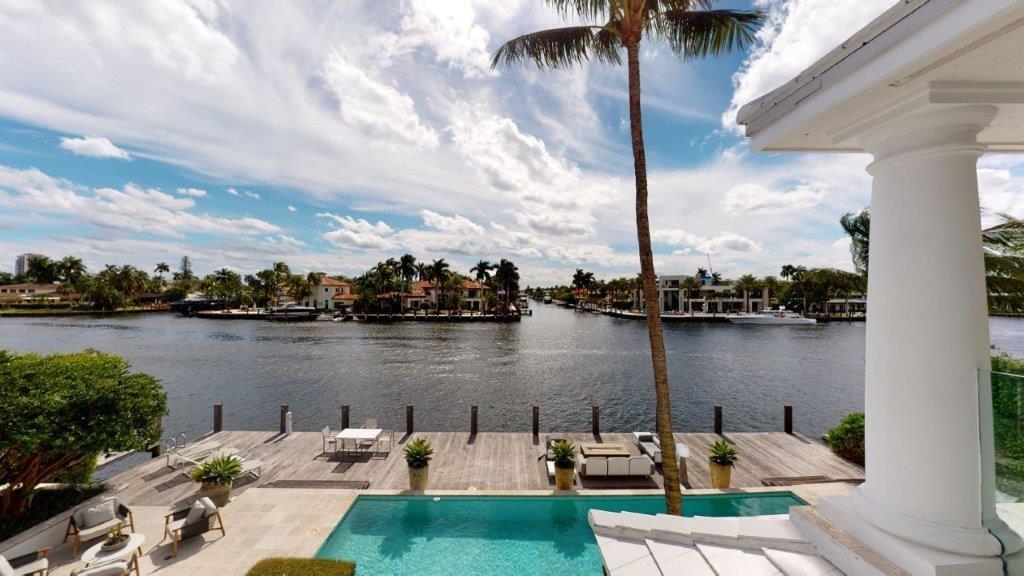 Stunning transitional waterfront estate located in prestigious Sunrise Key. Upon entering the home, you are embraced by wide water, Rio Barcelona, views through floor to ceiling glass windows and doors. Preferred southern exposure pours light into this custom estate reflecting on the white marble floors throughout. Modern Poggen Phol kitchen with Miele appliances including a 120-bottle wine refrigerator. Four generous ensuite bedrooms one of which doubles as a VIP suite with its own living room, breakfast bar, and private entrance. Primary bedroom with sitting area has floor to ceiling glass with spectacular panorama views and private balcony. Three car garage, 95' ipe dock and heated swimming pool. Dockage for large yacht, no fixed bridges with direct ocean access.