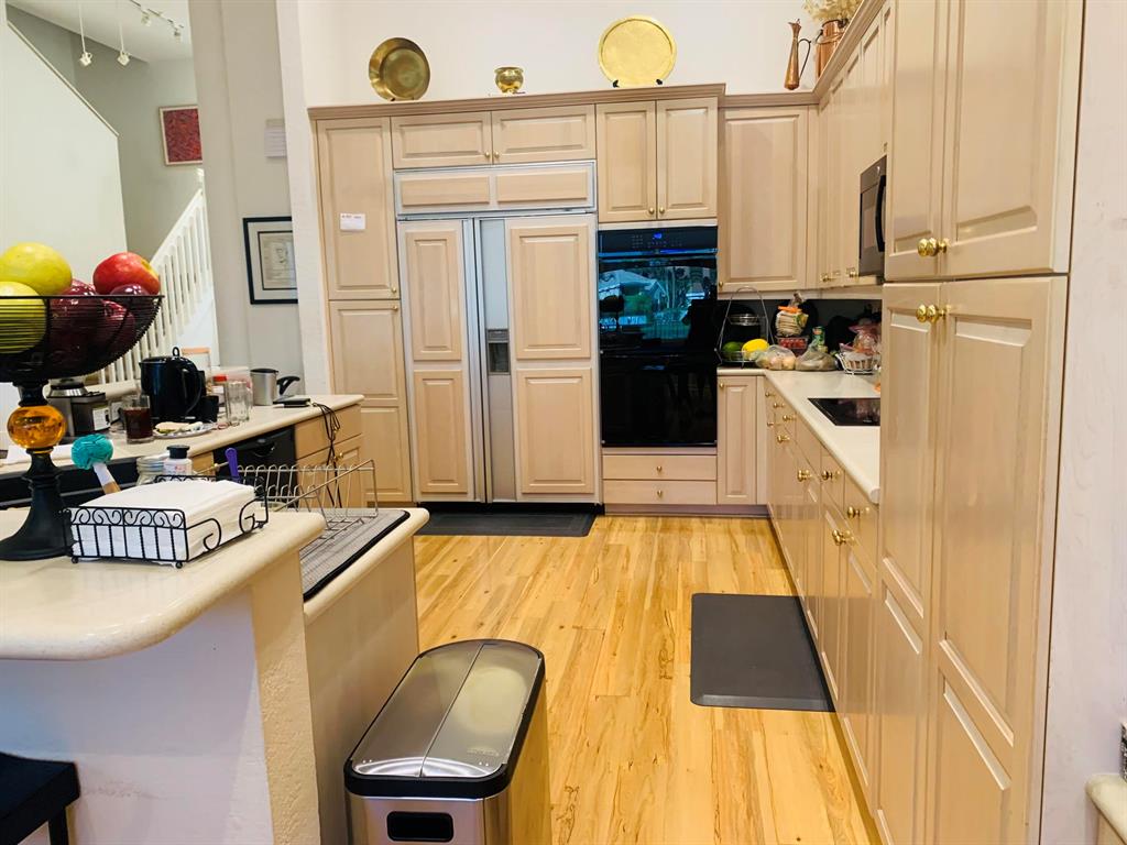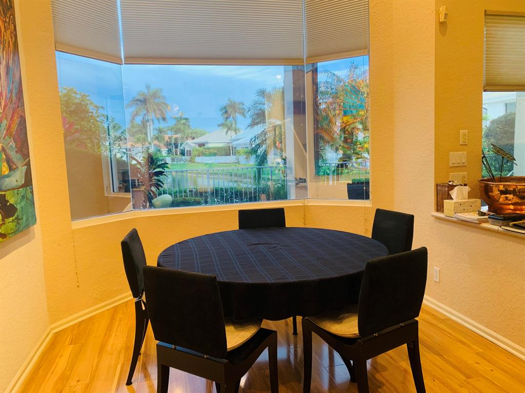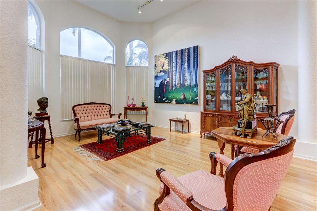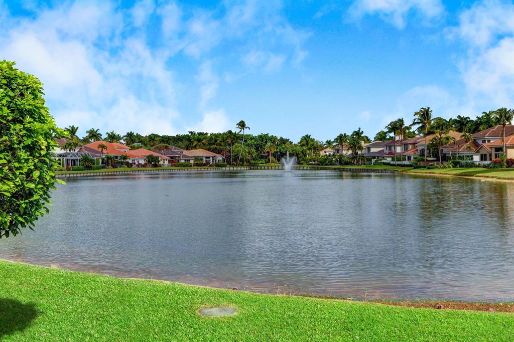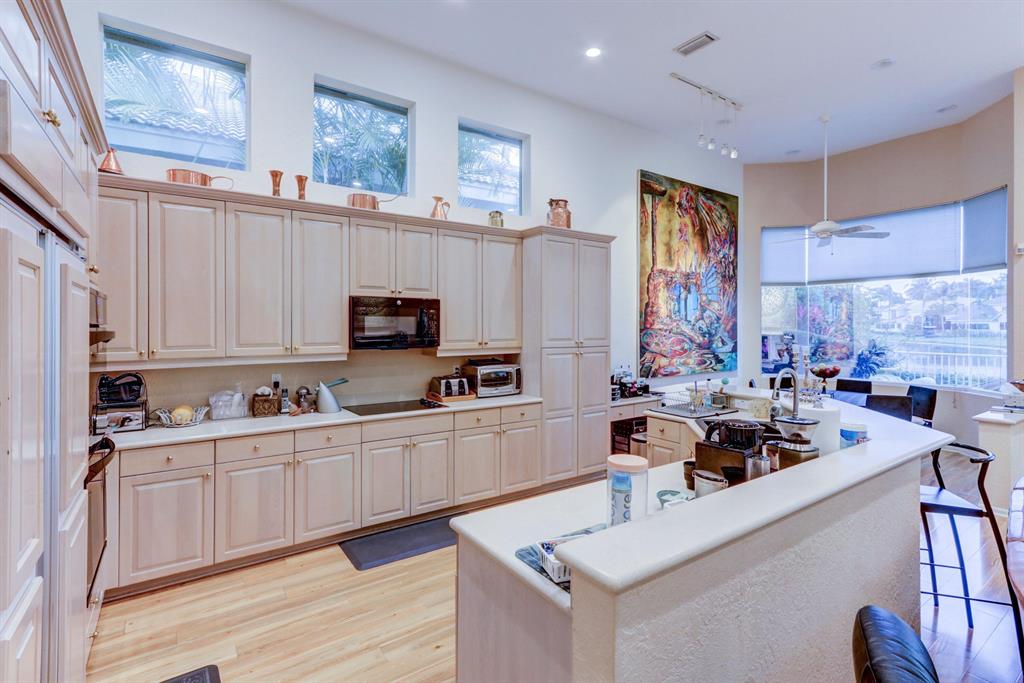 Banana trees lead to the front door that opens into a beautiful lake view the moment you enter. The floor plan offers the Master Suite plus an office & 1 1/2 baths down & 3 bedrooms, a loft up & 2 baths. Features of this lovely home include volume ceilings with LED lighting; neutral laminate tile floors & carpeting; decorative Living Room columns; Family Room entertainment center; inviting built-in bar; an open kitchen with 42'' light blonde wood cabinetry with roll-outs, corian countertops & newer sink, oven & microwave. Sliding glass doors open to a charming open patio with a tranquil long lake view.