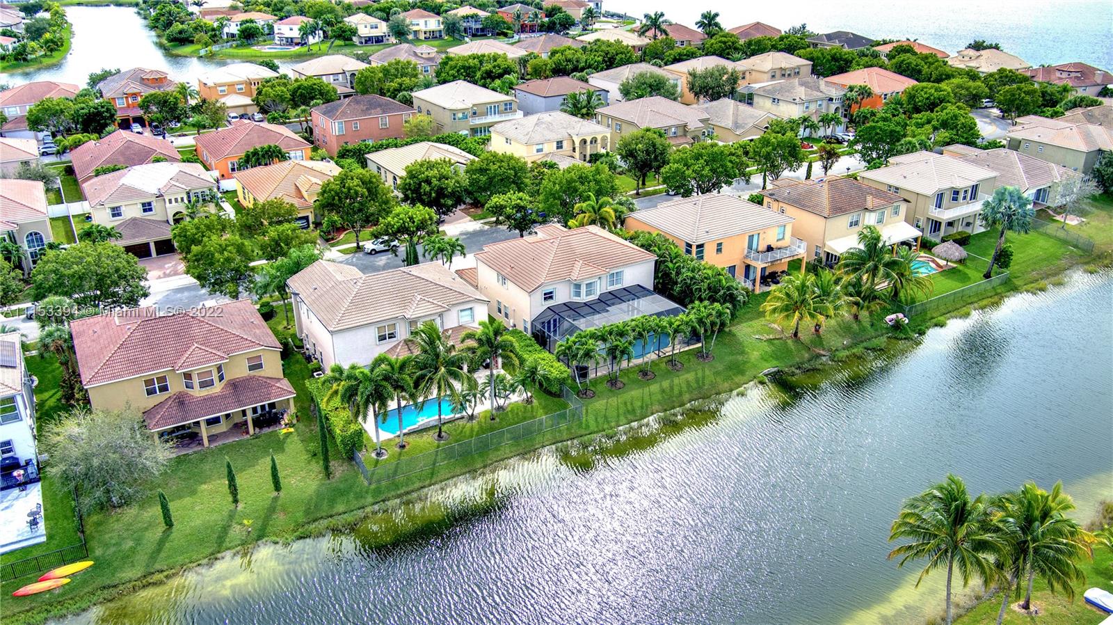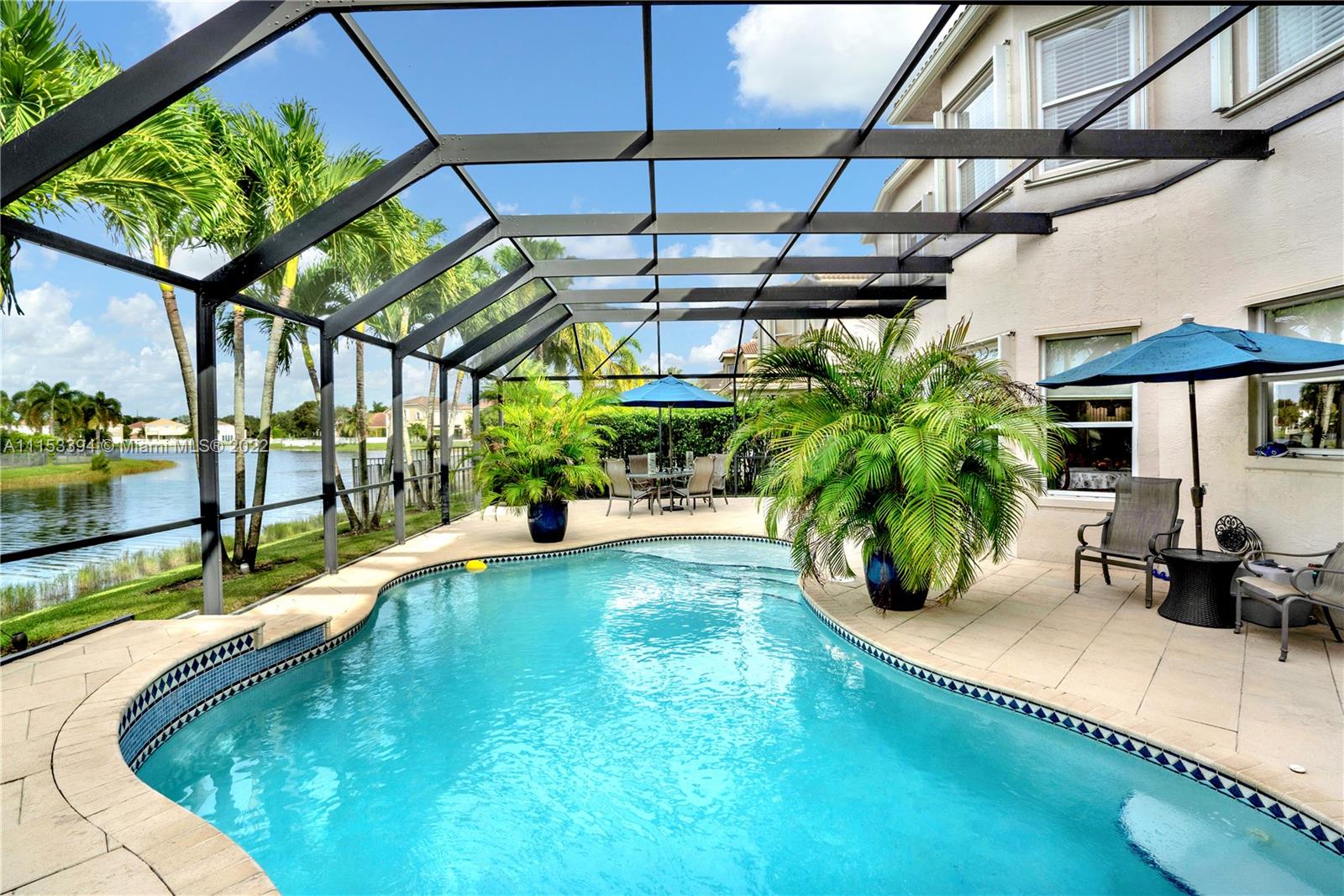 GORGEOUS waterfront house w/upgrades enhancing your living lifestyle. In the community of Riviera Isles. Beautiful Crème de Marfil marble on the first floor. w/marble inlay designs. Large kitchen w/beautiful granite countertops, stainless-steel appliances & maple wood cabinets. Spacious living & dining areas. Open kitchen & family room w/views of the pool & lake. Four bedrooms including a spacious Master Bedroom w/lake views. Three full bathrooms w/upgrades. Den area upstairs w/hardwood flooring that can be converted to a fifth bedroom. Ascending a gorgeous spiral wooden oak staircase you are greeted to an all tile second floor. Spectacular Salt-Water pool w/design artistic pavers for entire patio area w/views of the lake & astonishing sunset’s. Three car garage w/space for storage.